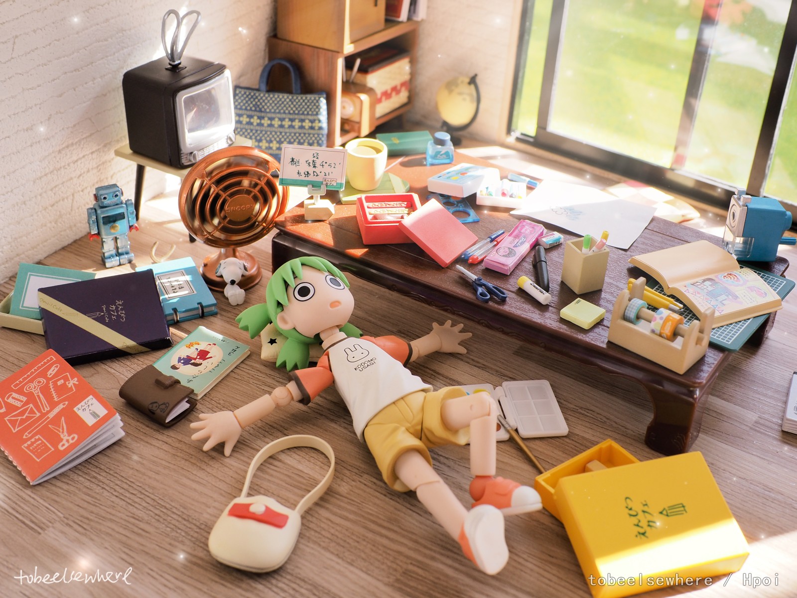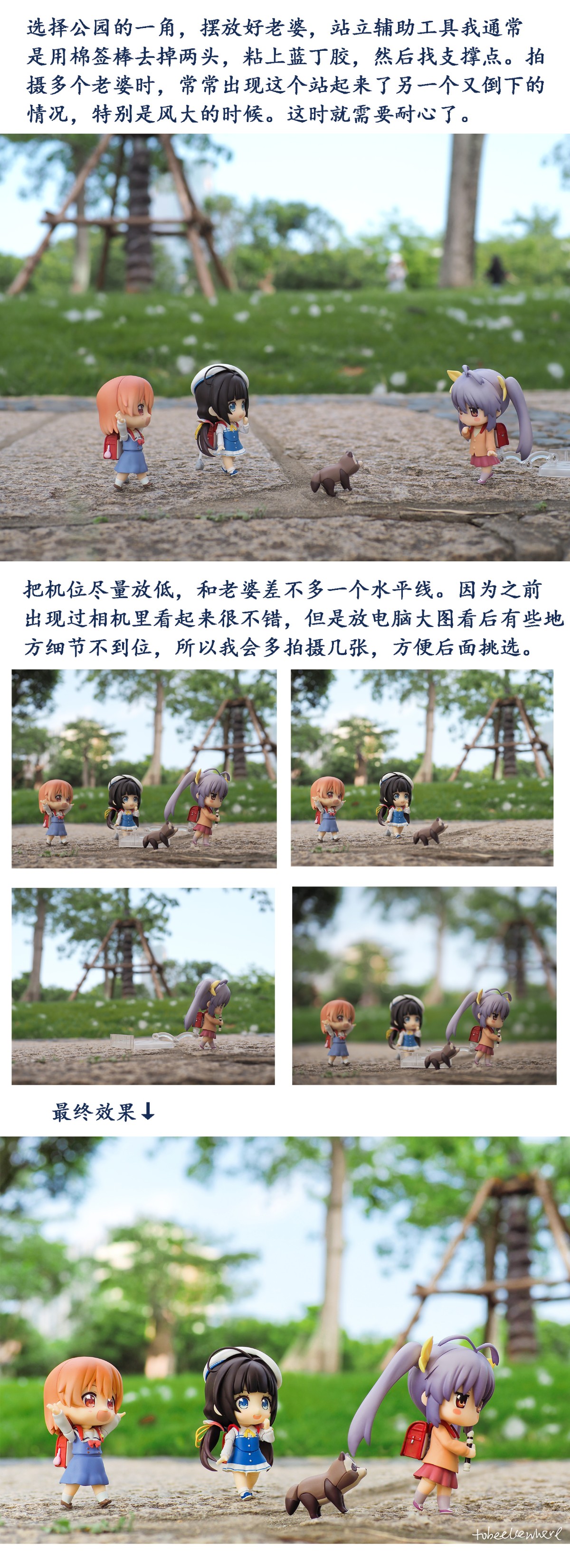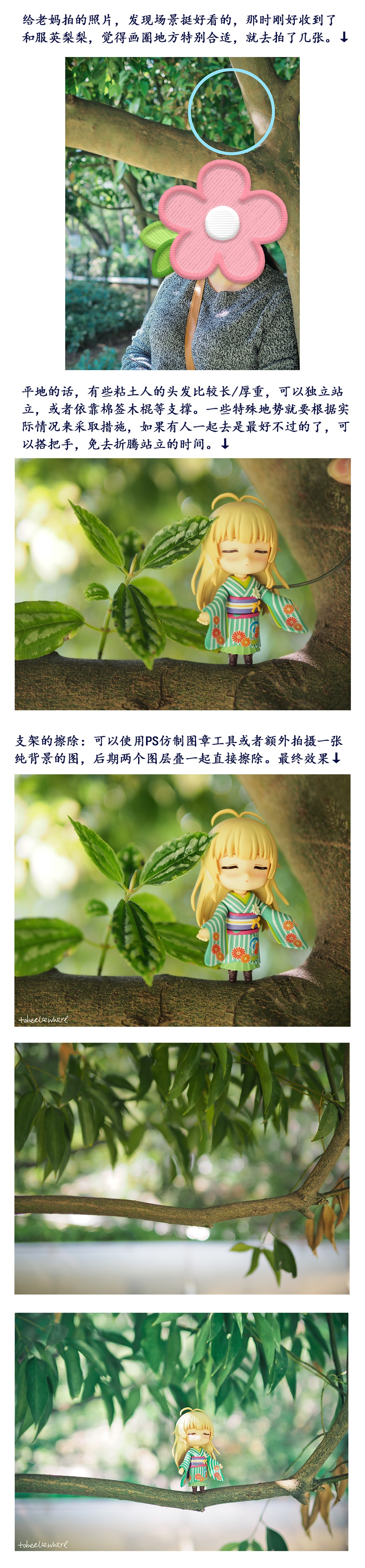 •有一点PS基础的,可以做出这种腾空的感觉。有支架的先拍摄一张,然后把粘土人拿走,再单独拍摄一张场景,方便后期把支架擦除(现在一些手机图片处理软件似乎也有类似功能)。