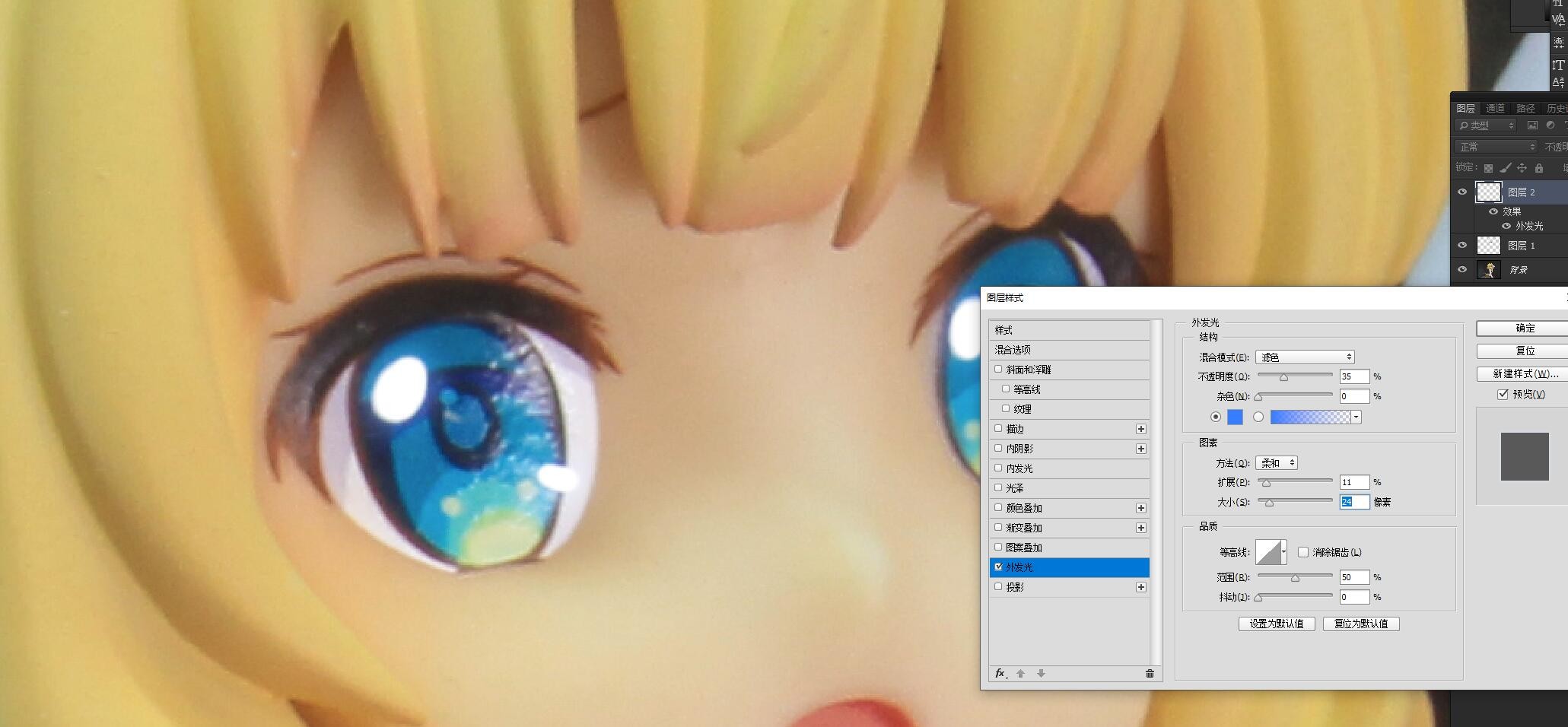 还有一种就稍微繁琐一些,先把高光用白色单独画出来,然后设置图层外发光,参数看个人喜好。