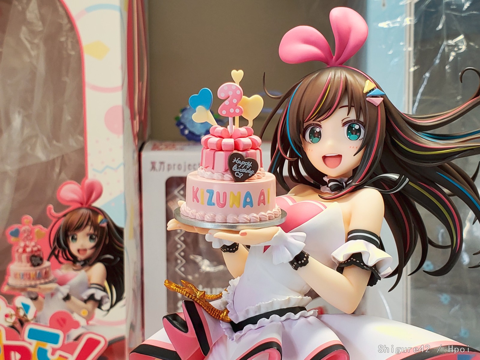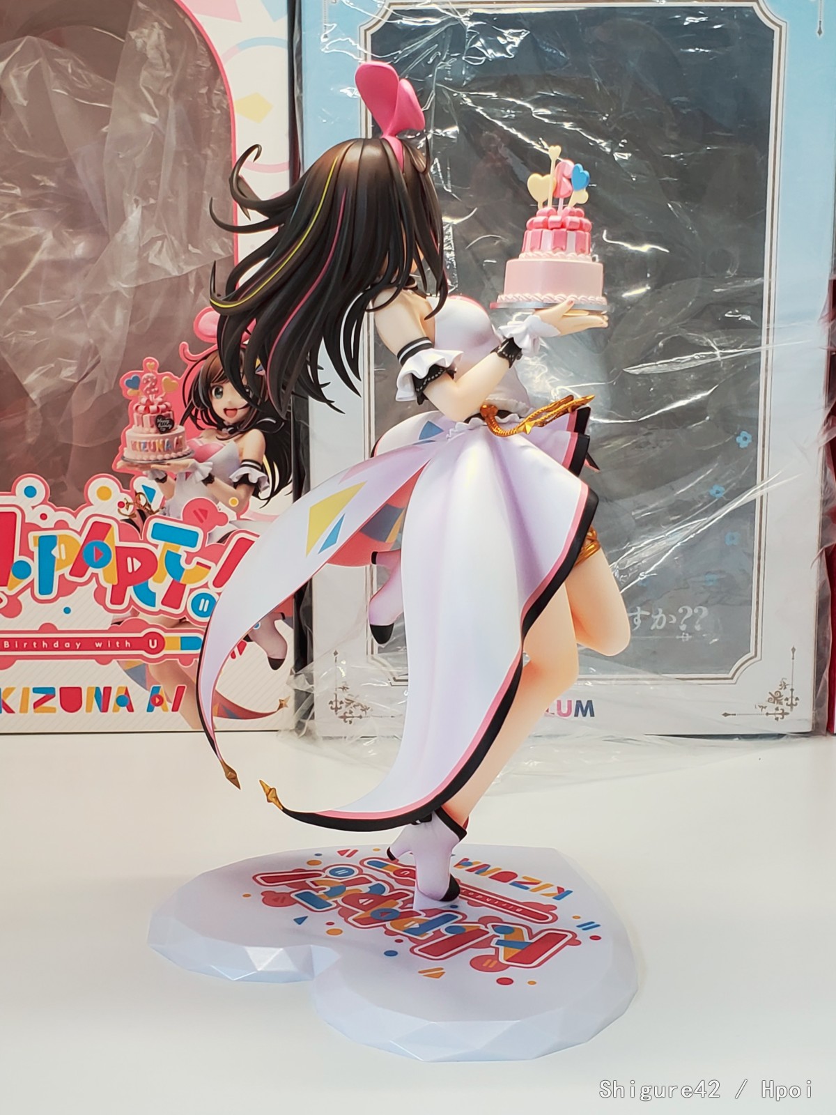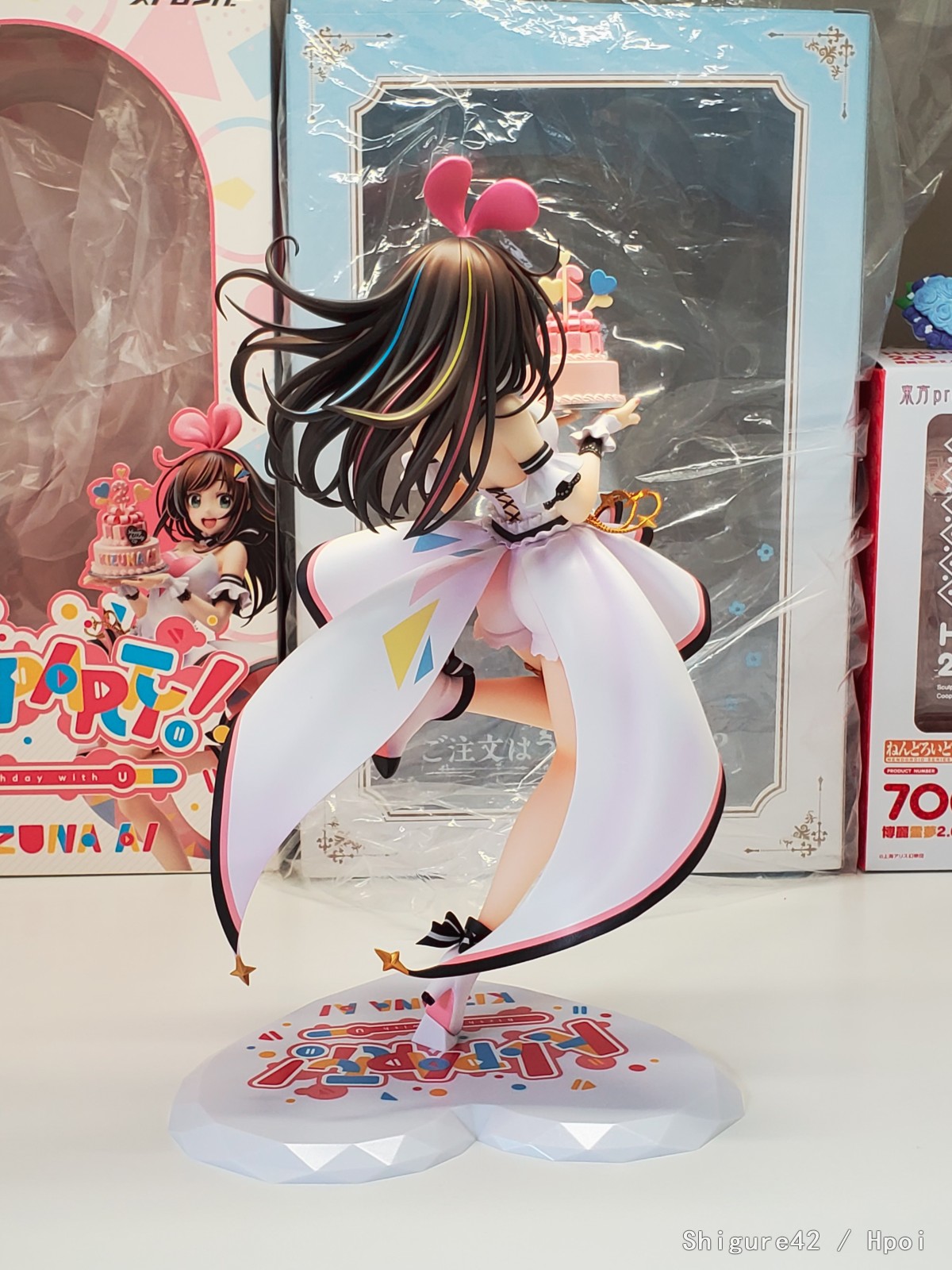 感觉后仰有点严重,没有官图那么灵动,和官图有一些微妙的出入,比如脸变得瘦了,就没有这么憨憨的感觉,平视(和底座齐平)的话绊爱是看着天的,也就是这是一个适合俯视的手办。其他没啥了,细节还是不错。
