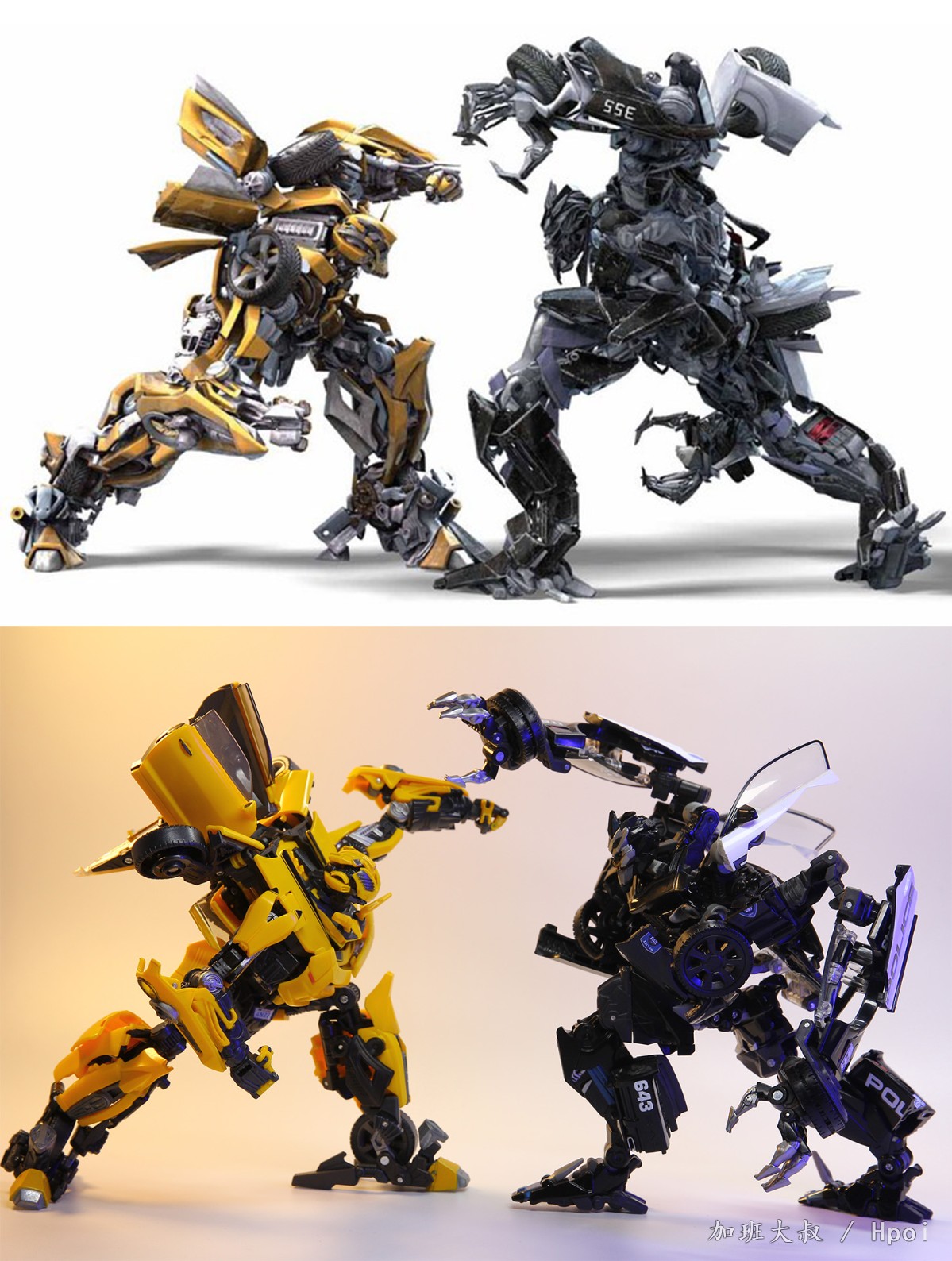 这一战是变形金刚真人电影第一场,变形金刚之间的战斗,令人印象颇深。本次还原采用master piece movies系列中的两款来进行还原,即MPM-03大黄蜂和MPM-05路障。