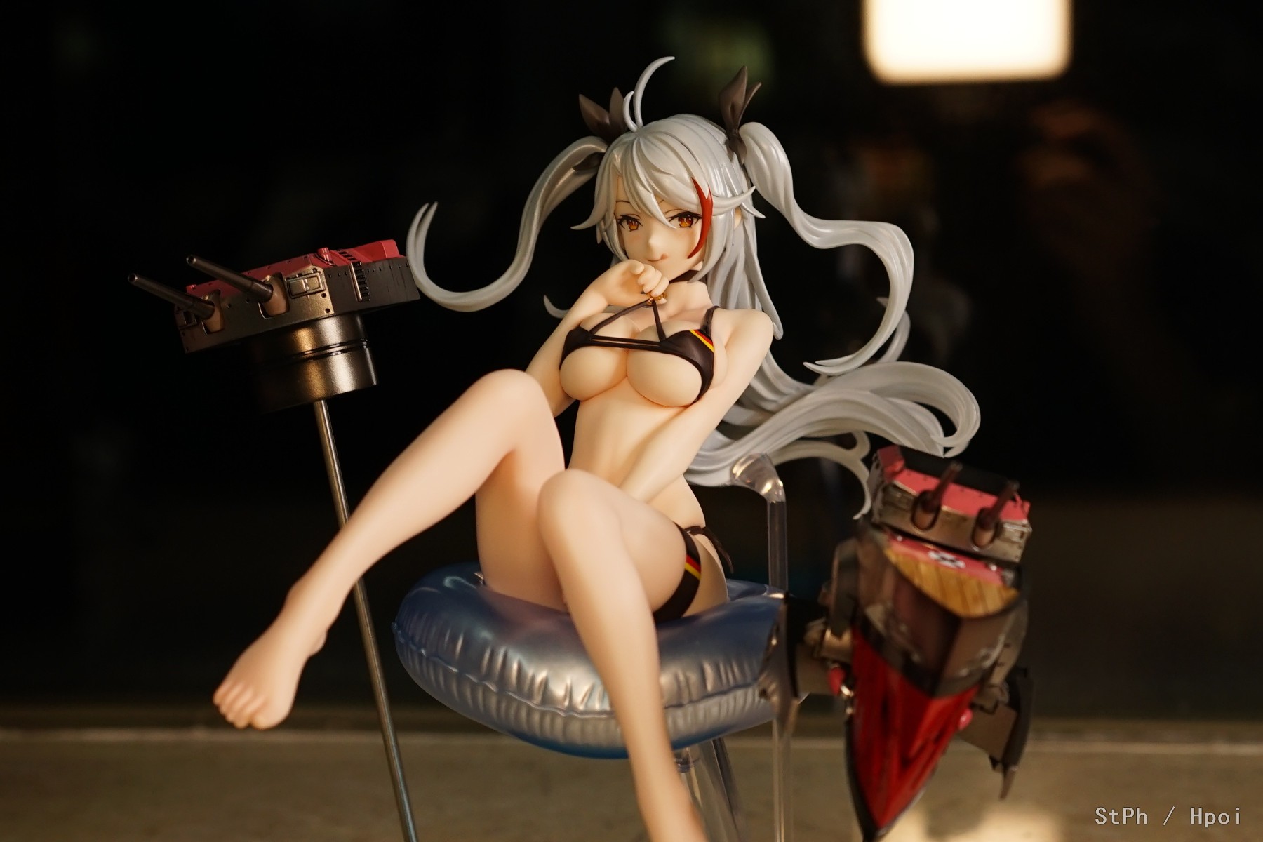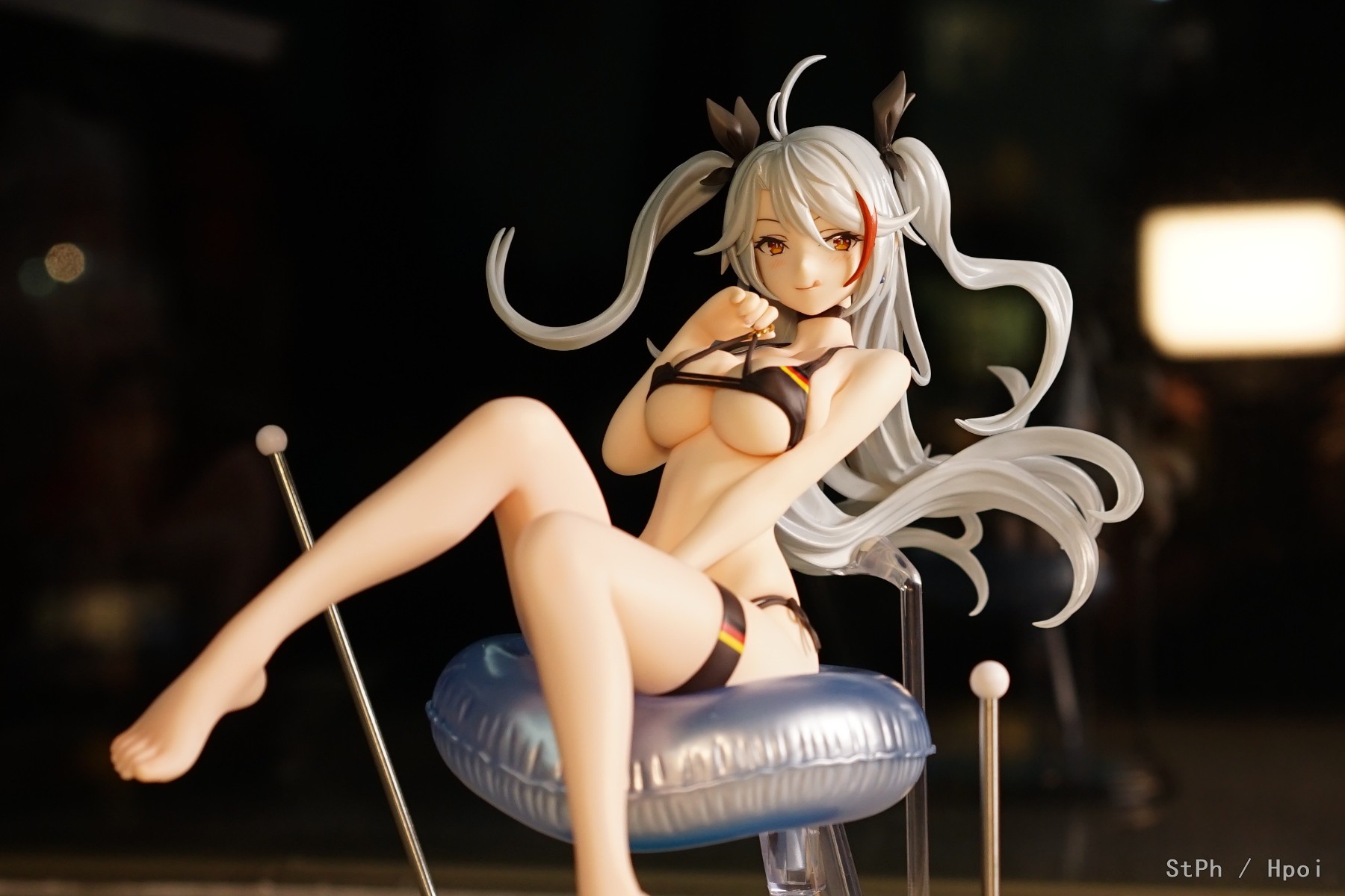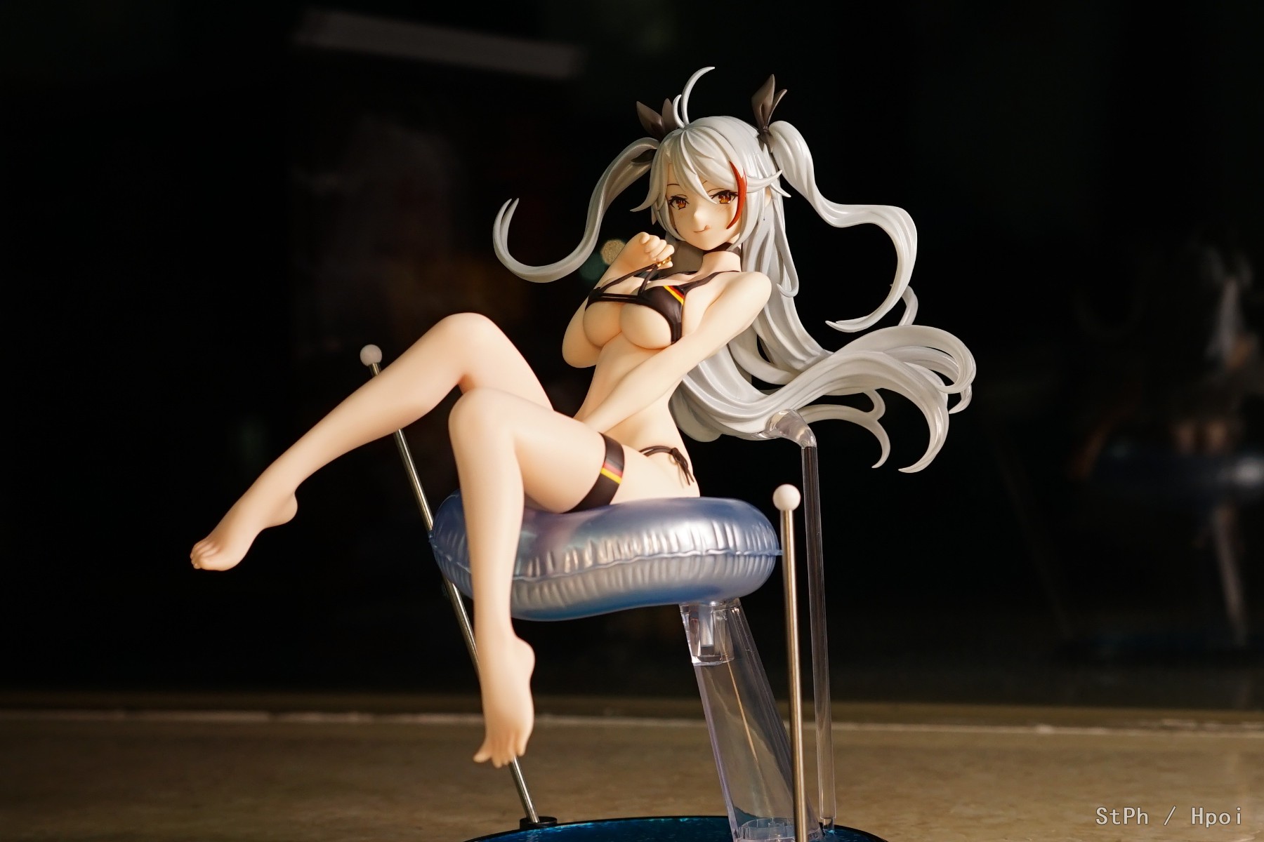 然后我翻hpoi发现这支架该怎么装之后,我确定不是我智商不行,而是设计者是新人类(确信)。我一开始觉得这透明支架限制了头部可动,让我颇为钟意的颈部关节变得形同虚设,设计者简直NT。然后我总算撑好,发现通过一只手稳住透明支架、一只手转动泳圈可以完美实现脸部朝向变化时,我觉得设计者简直是NT。