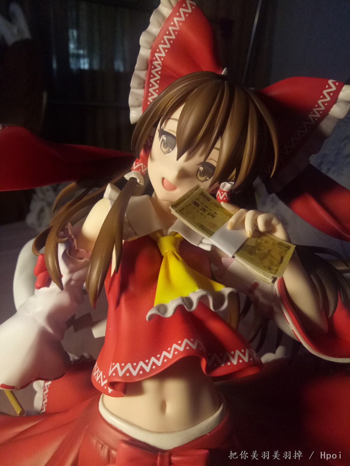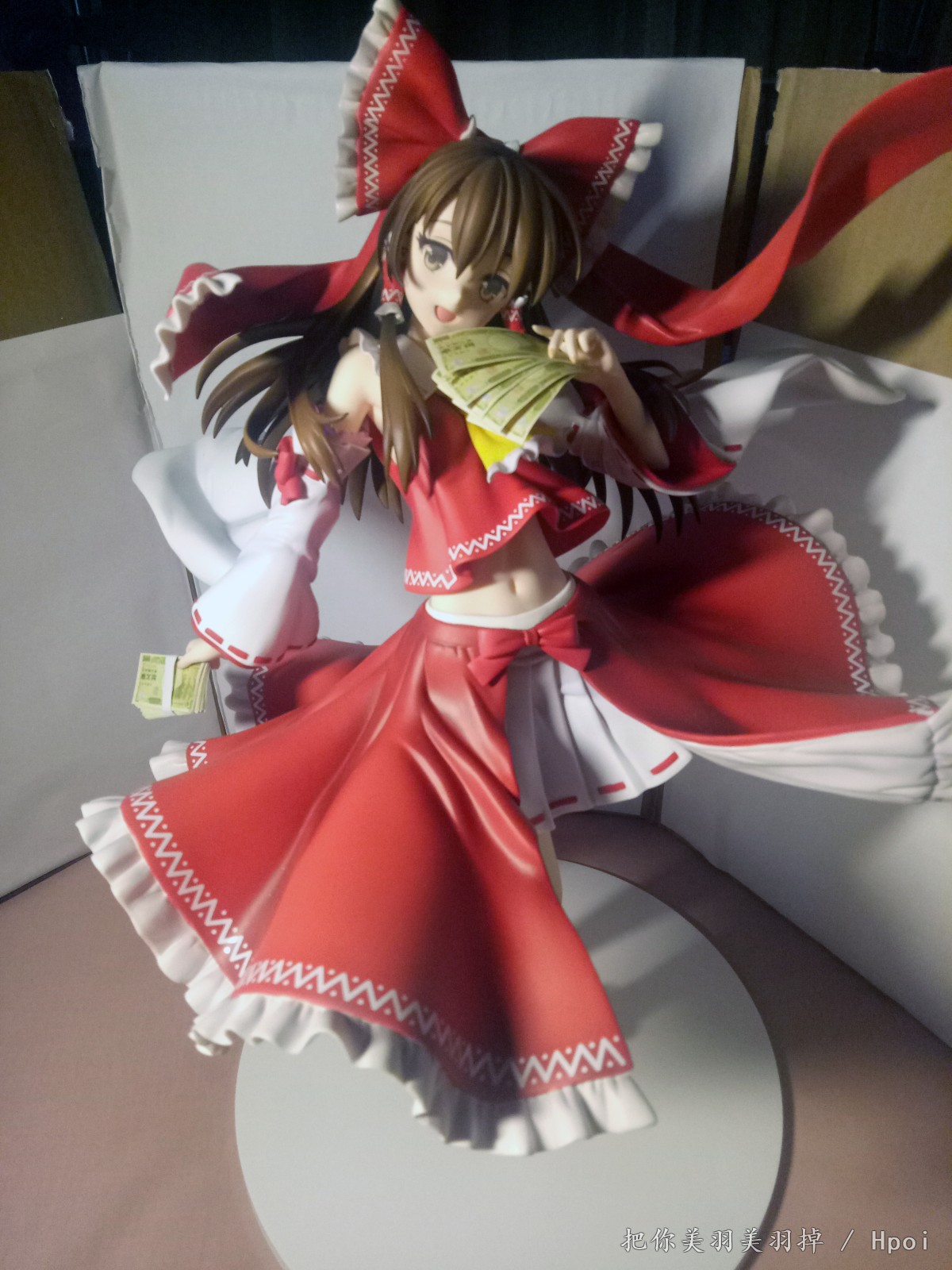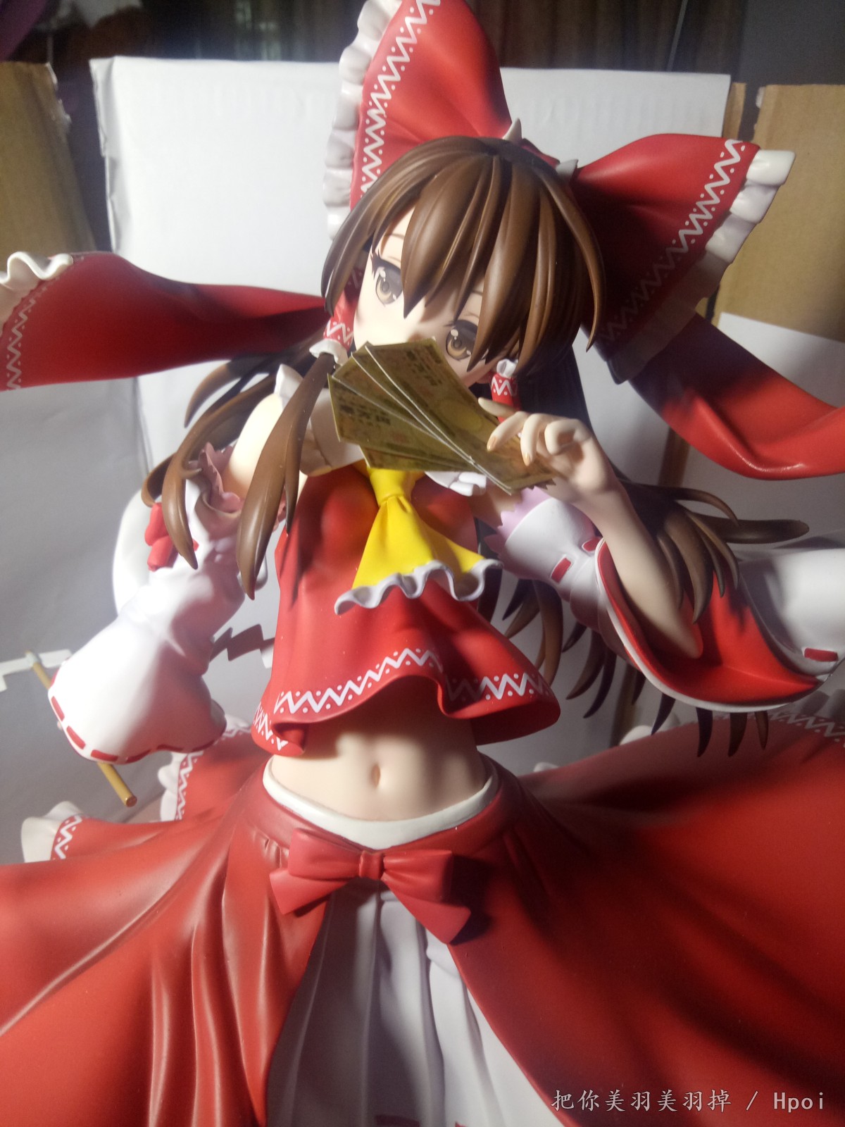 总感觉这款的灵梦笑的很邪恶,想了想感觉手上的符还有束币都不怎么适合,最适合这个表情的是钞票啊钞票!于是尝试自制了一下1/4的日元,从黑白试效果到最后完成的用了三版,第一版是黑白色的,效果不太明显。第二版前后色差太厉害了,于是就有了第三版。(我也真是够闲的)