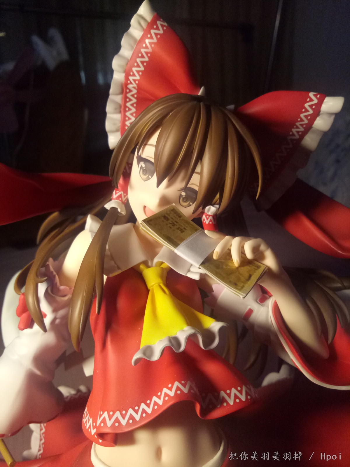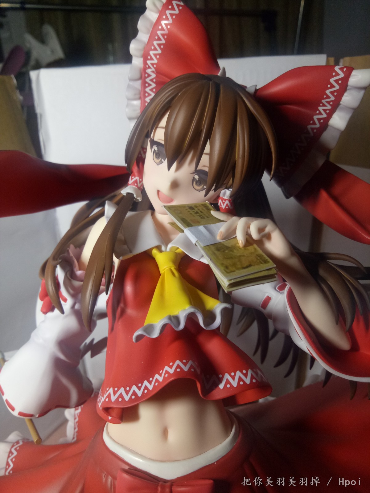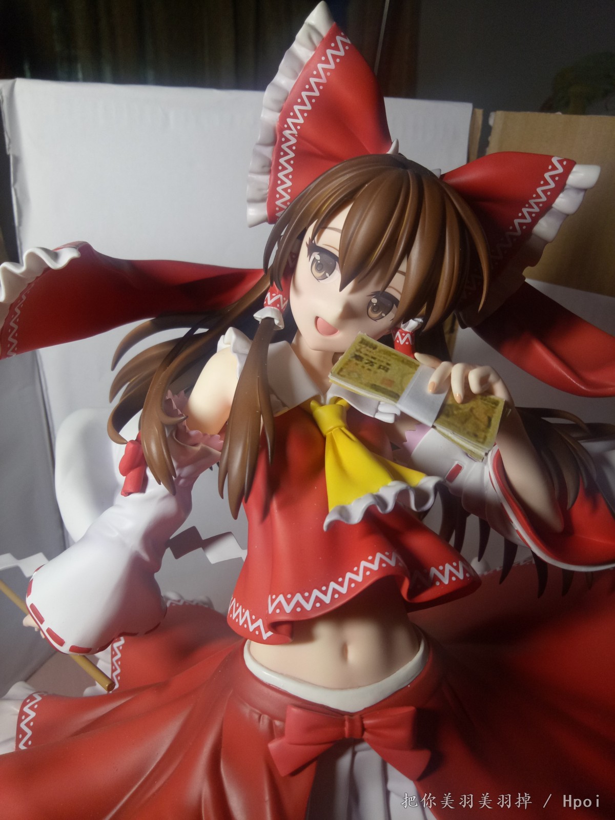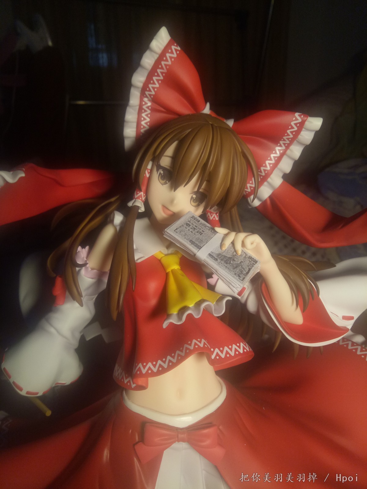 总感觉这款的灵梦笑的很邪恶,想了想感觉手上的符还有束币都不怎么适合,最适合这个表情的是钞票啊钞票!于是尝试自制了一下1/4的日元,从黑白试效果到最后完成的用了三版,第一版是黑白色的,效果不太明显。第二版前后色差太厉害了,于是就有了第三版。(我也真是够闲的)