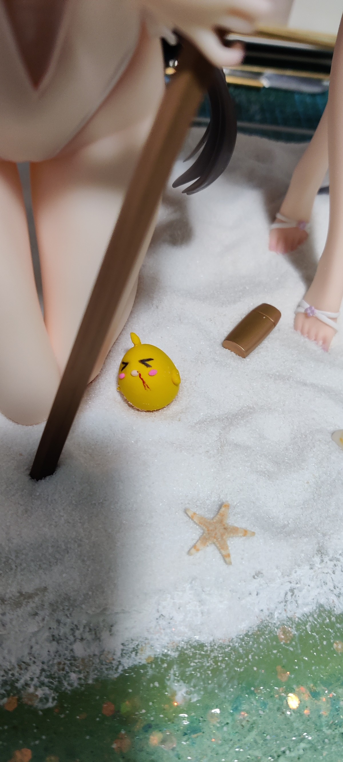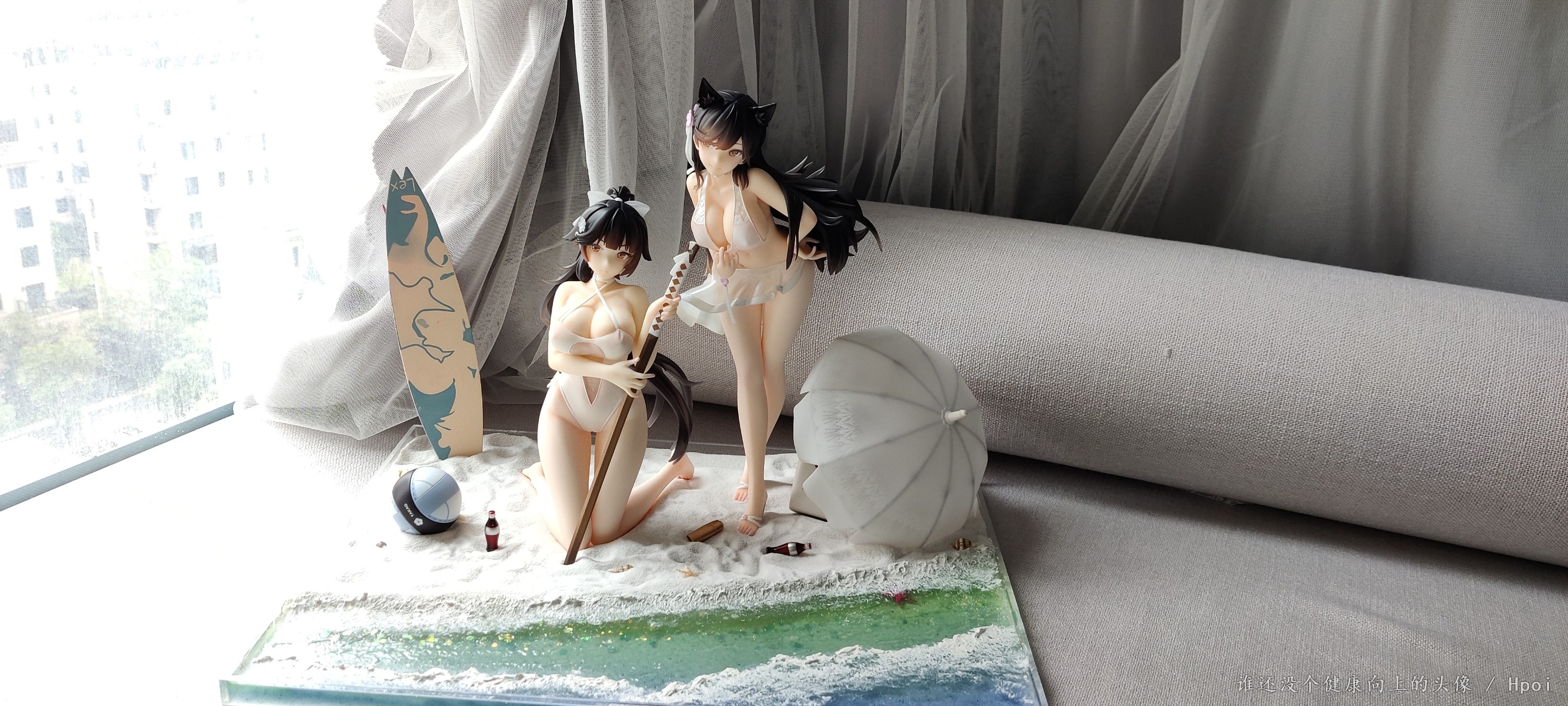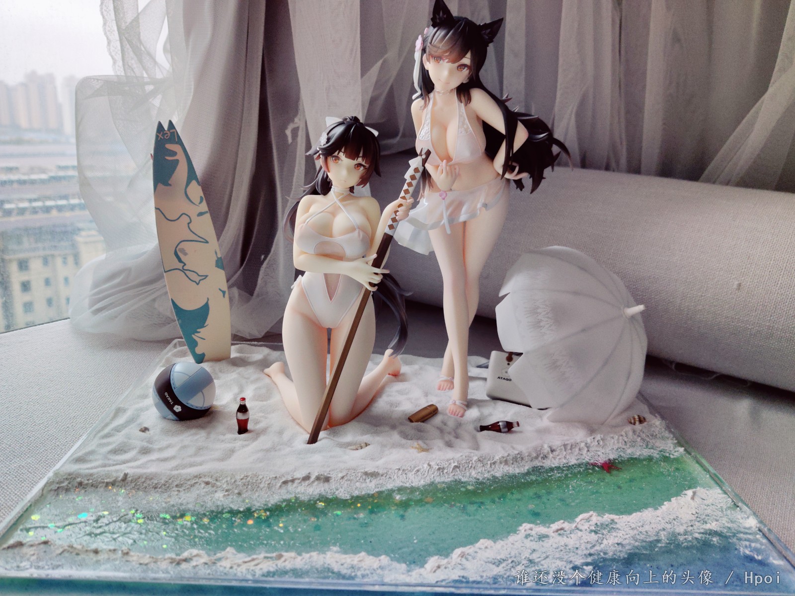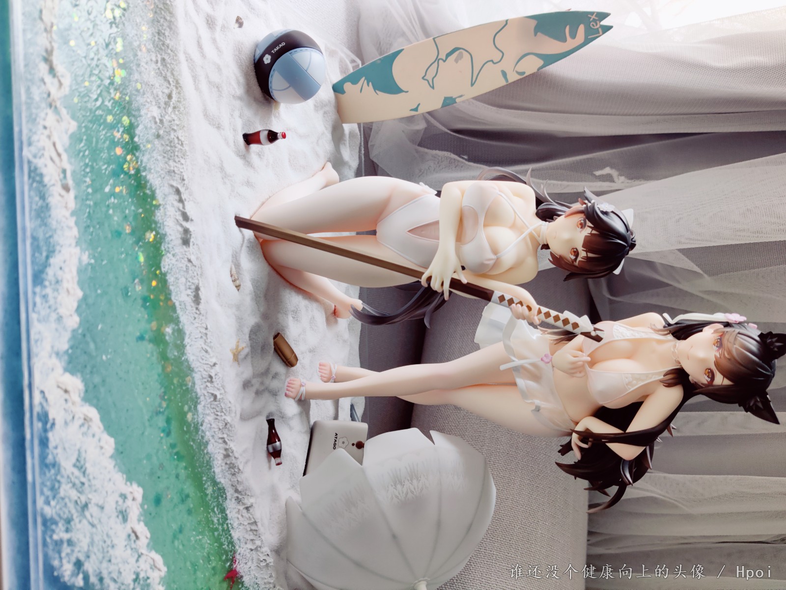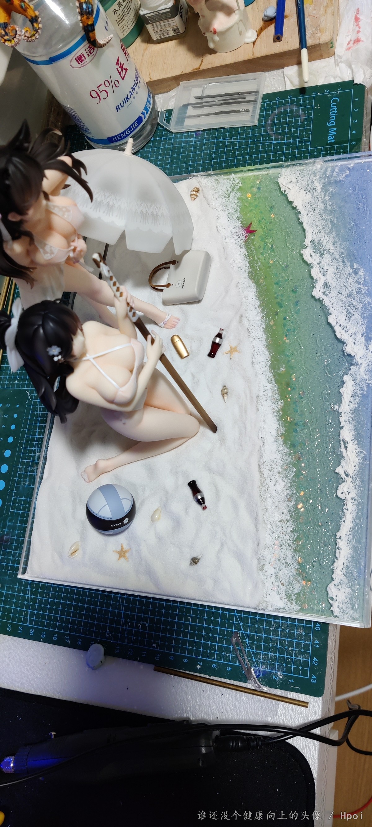 花时间摸了个地台让姐俩靠的近点,不然原厂地台离得太远,高雄下面做了软胶处理,跪的更稳也保护身体,软沙盘的方式也是为了高雄考虑,爱宕复刻了脚桩,拍照环境有限就这样吧,脸和胸都二次追加了红晕。