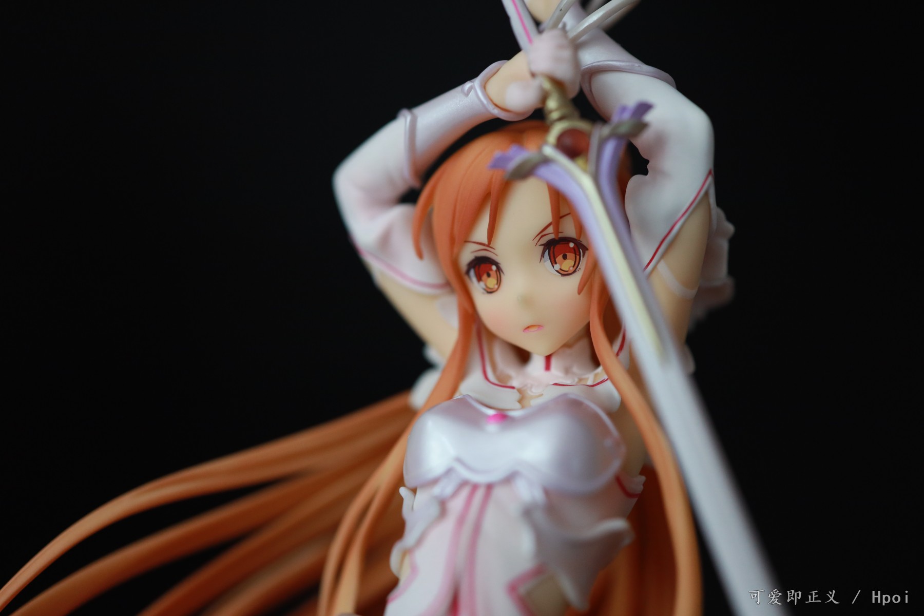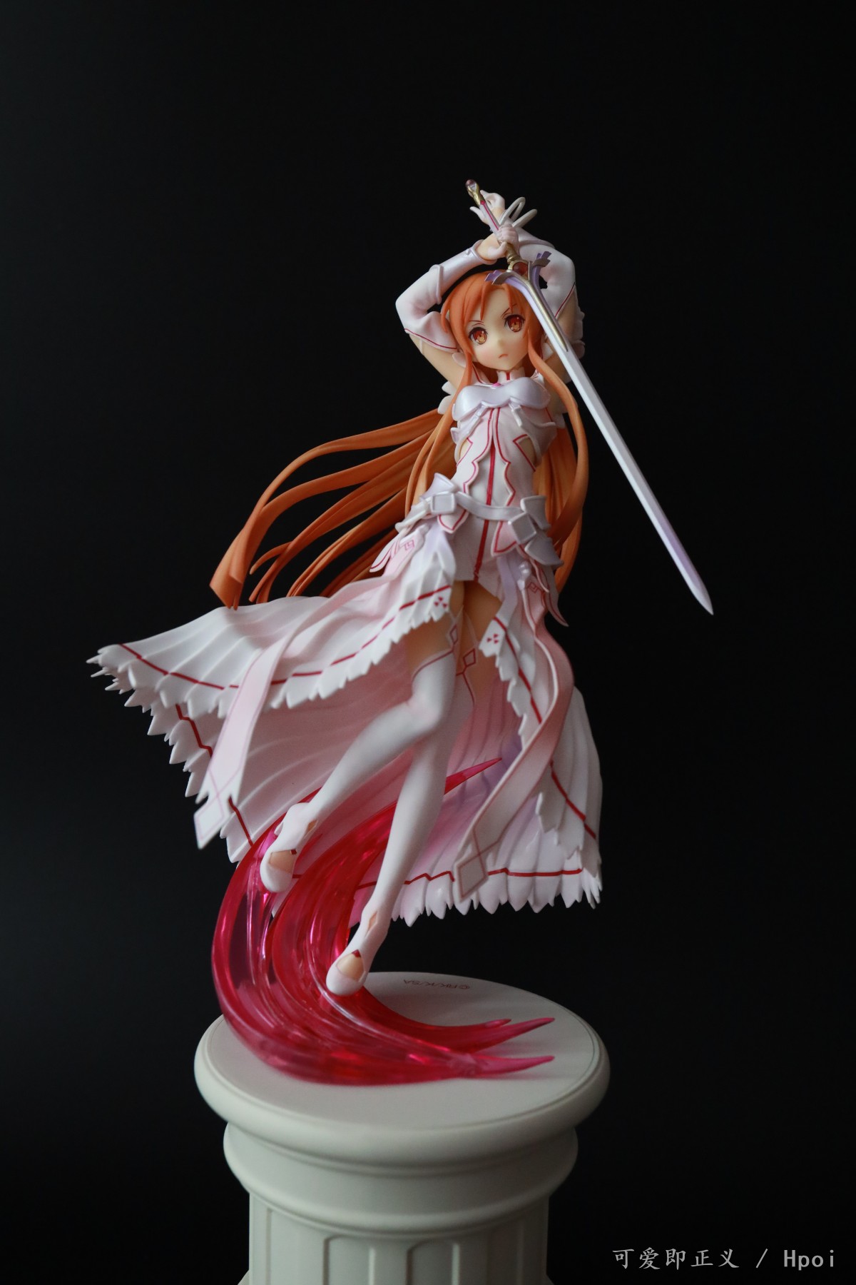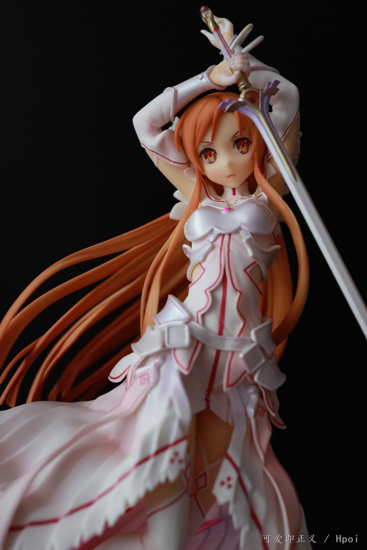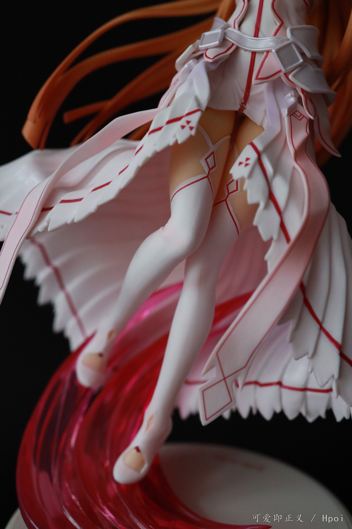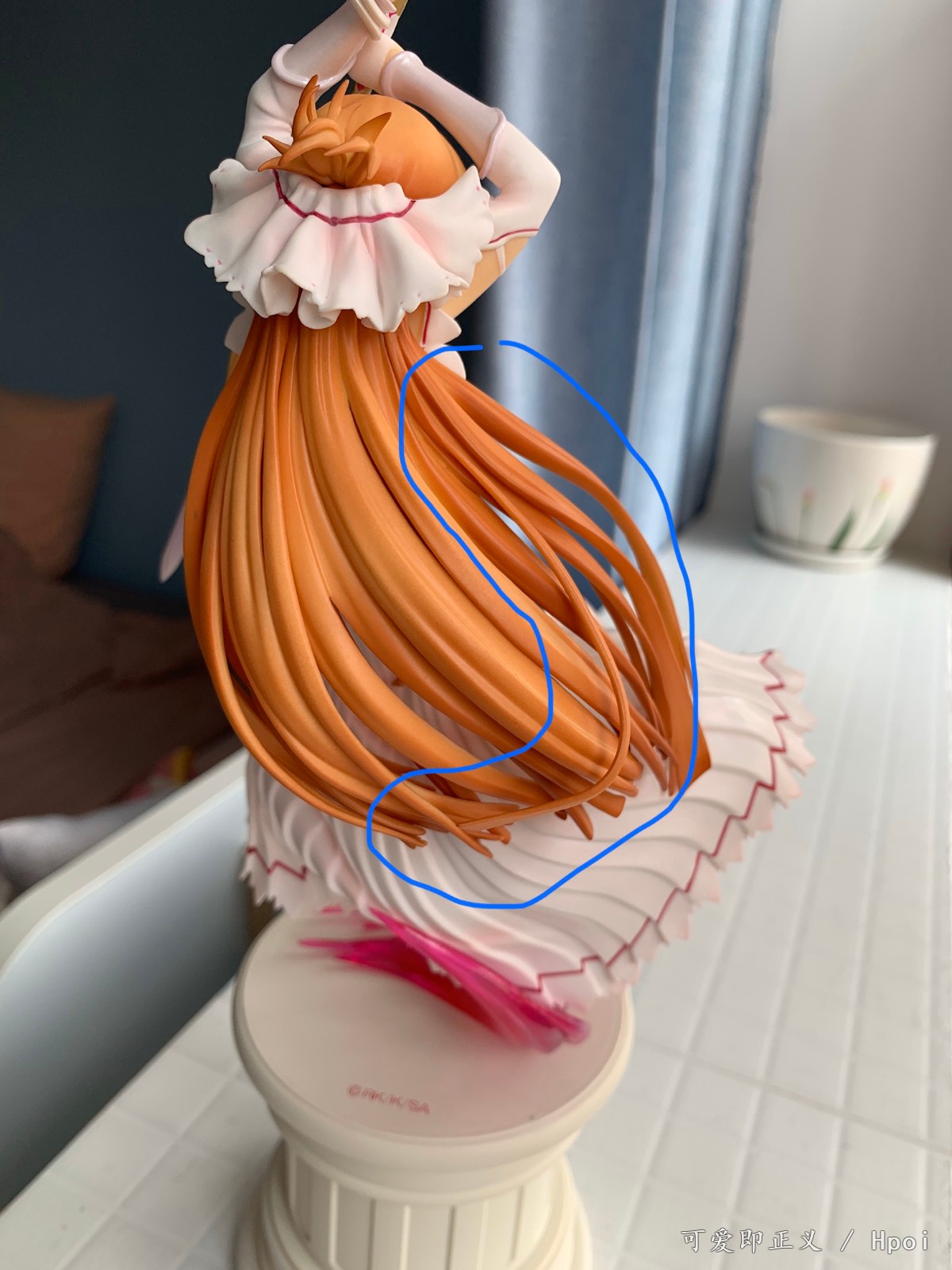关于头发,塌的很多,不对比不知道一对比吓一跳,然后细节上可以明显的看出装涂小瑕疵很多,特别不走心,裙边装涂里里外外的,背后头发盖住的里面还掺杂着颗粒,阴影色的大范围缩水,比寿屋的血盟(图里是我300块收的是散货,正不正不知道)都是很拉胯的,还有嘴巴,涂的那么大,颜色还是死亡芭比粉,这点有点不能忍。然后手里的剑,握不到官图的位置,总是往下滑,要卡在下面粗一点的地方才行。人物整体我觉得往后倾斜的太多了,正面平视看像往后仰过去了一样,不知道都这样还是我中奖了?