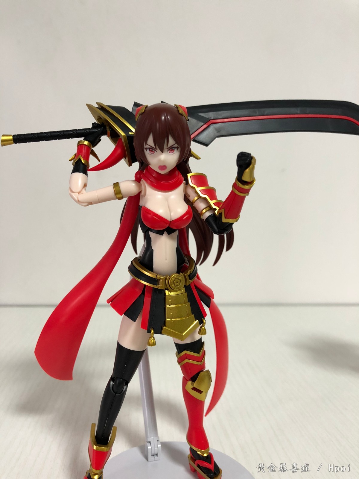 相比之下,有问题的地方也多出了好多。本来头发的连接件就比较脆弱,这次有些部件还做成了左右合的设计,我的一根连接件没摆几次姿势就当场断了,断件卡在头发里还夹不出来。拼装难度虽然不高,但是与上一作相比多了很多细小的部件,有点地方也需要大力金刚指,摆造型的时候更容易掉件了。大刀虽然不错,但是摆姿势超困难。手臂的转动件超紧,当你想转手臂的时候,结果是肩部一起动了,然后连带着整个上胸部就裂开了,晕。