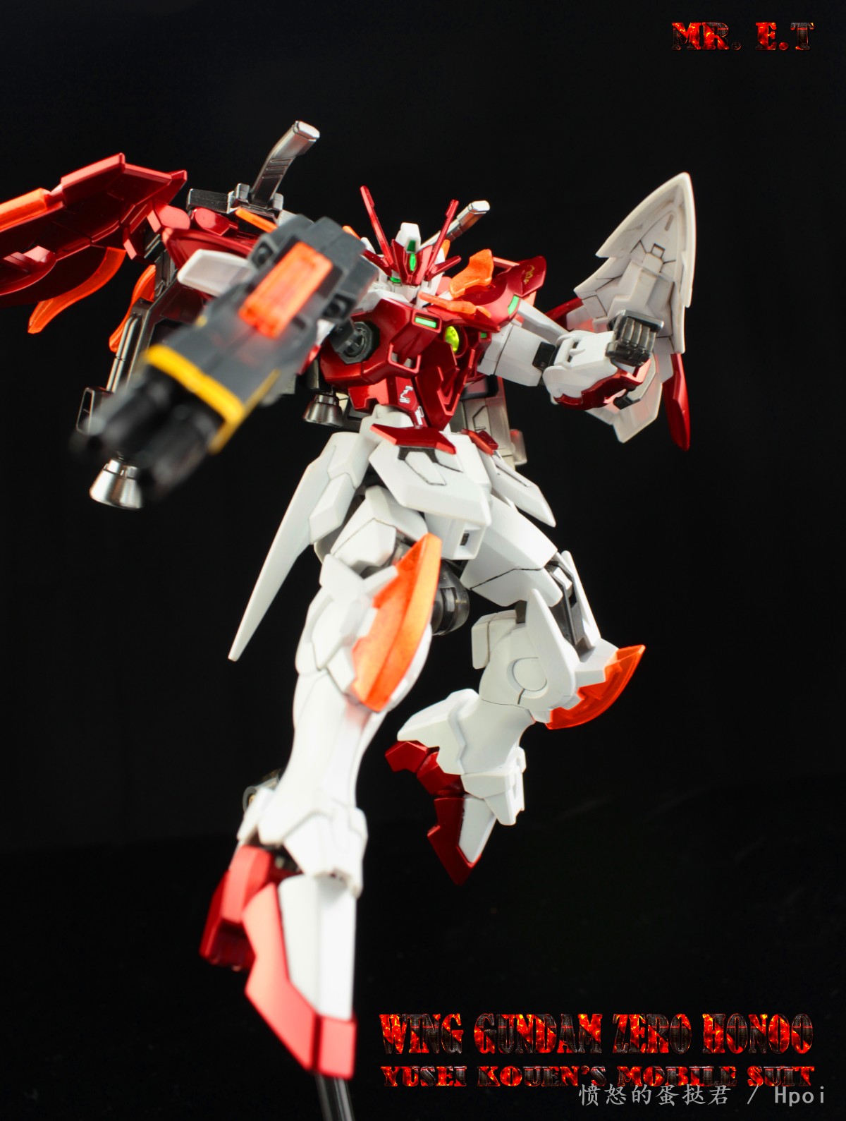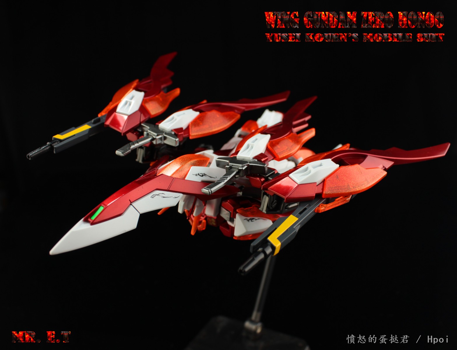 又是一台眼缘机,没有看过漫画,单纯冲着颜值购买,改用了hobby版的天线和武装,依旧伪电镀配色,橙色透明件利用电镀银的喷灌撒了一层银粉,最后覆盖了一层透明橙来增加粒子感