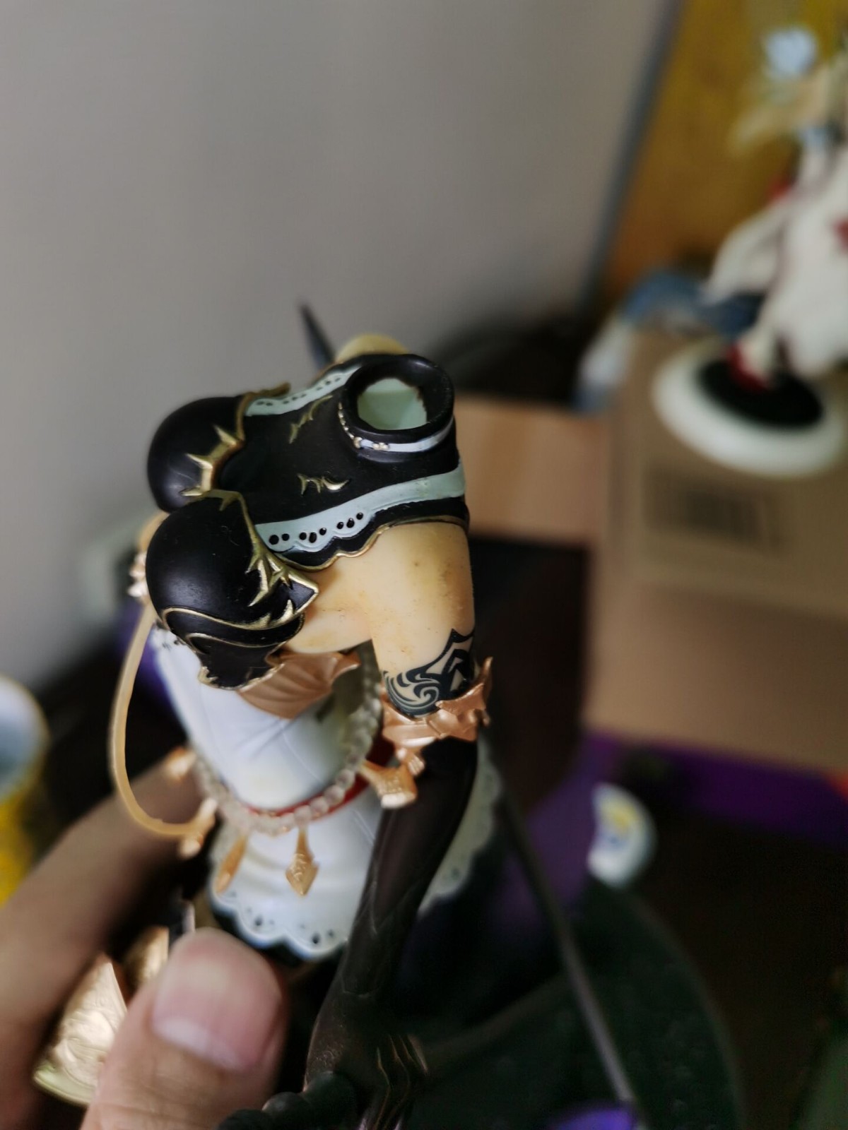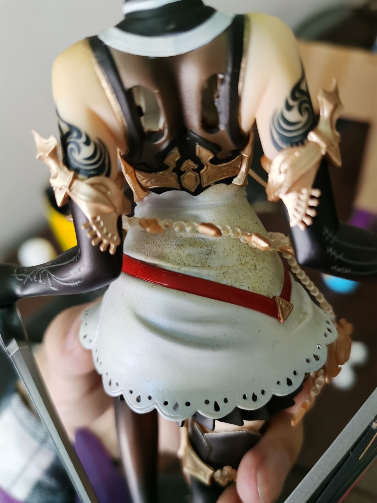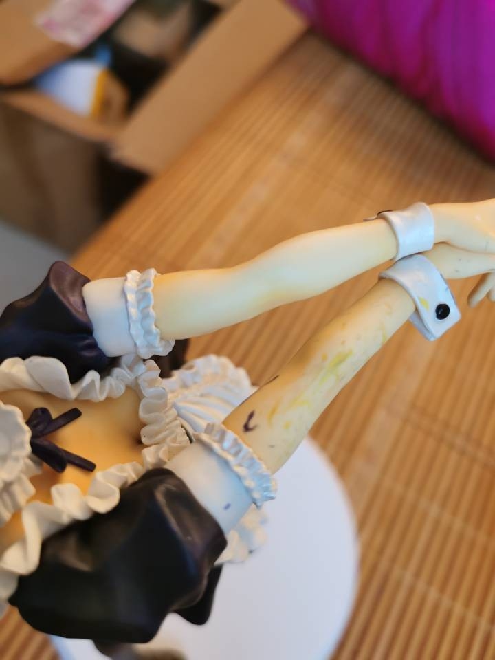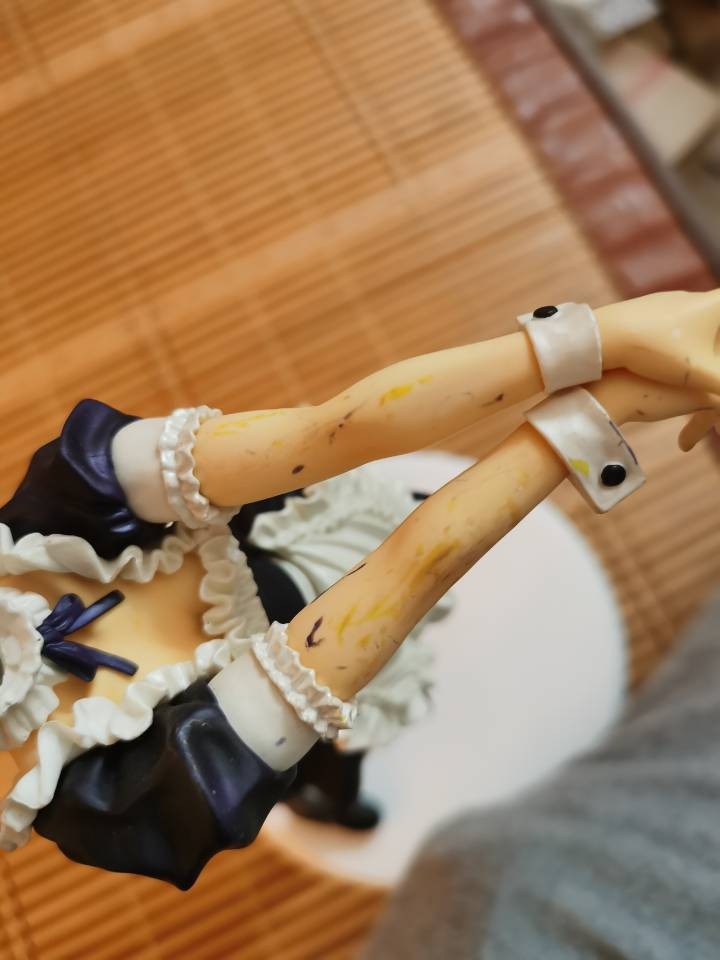 例如这个地狱里爬出来的女仆saber,我也不知道怎么才能蹭漆成这样的,当时无盒的手办包装好,结果好心的驿站姐姐又帮我重新打包发出去,我不以为意,结果到买家手中变成这样,算了算了,反正就是也是当尸体卖的,卖了也卖不了多少钱。