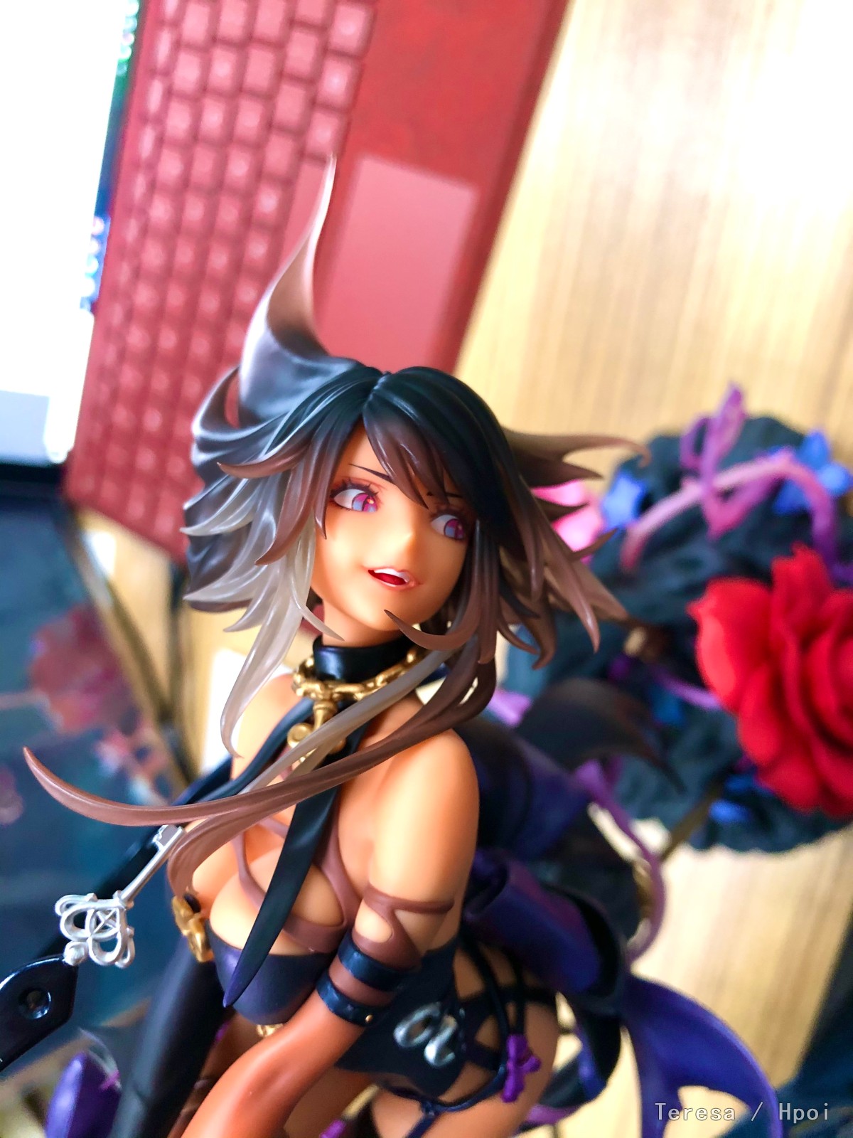 实物比图要更鲜艳一些,主要问题还是丝袜大破洞地方是分件的,接合处有明显缝隙,其他地方没什么大毛病,脸带点角度限定,反正从上往下看不会很惊艳就是了,正常角度我个人标准是完全没问题,能接受的程度,故意找不好看的角度拍那确实没办法,这换你仰头你也难看,我这只涂装还行,比较精致,没有什么溢胶溢色问题,破洞地方的小洞填色没填满,主要毛病基本都集中在这块了,就看左脚、尾巴和头发的透明件经不经得起时间的考验,别弯了。总体来说比较满意,买照骗厂手办容易血压升高,看看接下来的韶华和2233不问天品质如何,如果这三只拉胯了,那该冲还得冲。韶华主要工艺难度集中在头部的头发刘海、背后发丝的渐变喷涂和脸部的眼睛还有脸型把控,嘴唇的上色也比较重要;2233没什么技术上的难度,主要是阴影色和大平面喷涂容易沾灰尘,照骗厂大货又不怎么弄阴影色,和官图比大货估计会显得特别红,没什么立体感,官图渲染后的红还有点金属色质感,我估摸着大货也难实现,但谁叫我喜欢中式婚服呢。