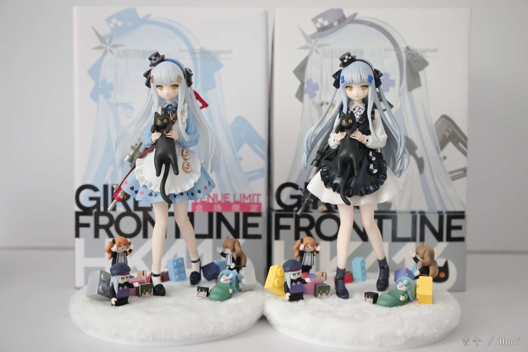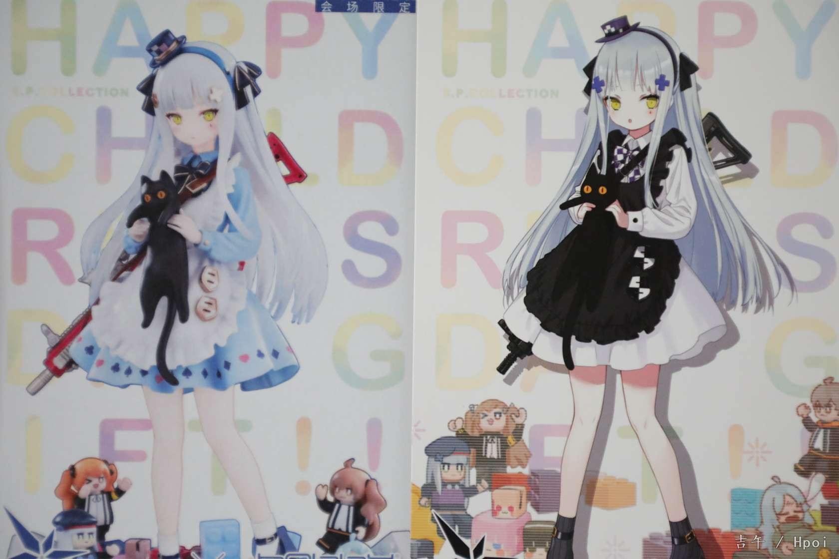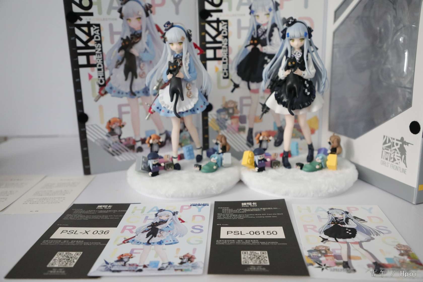 黑猫原色今天到货啦,两个盒子设计都很好看,翻盖的设计很赞~盒子图案细节不太一样。黑白都给了限定编号卡,白的200个黑的说是15000个。仔细对比的话异色的细节和配色还是更胜一筹,包括头顶帽子和头饰的涂装,还有裙子的花边和枪等等,非常精致~两只底座也不太一样,包括积木的位置和颜色等等。送的徽章很可爱,家具兑换卡可以当明信片摆出来哈哈。总的来说诚意满满吧,两个版本都让人很喜欢,摆一起很好看做工也没有明显瑕疵。一对差不多1300的价位来说相当满意了~