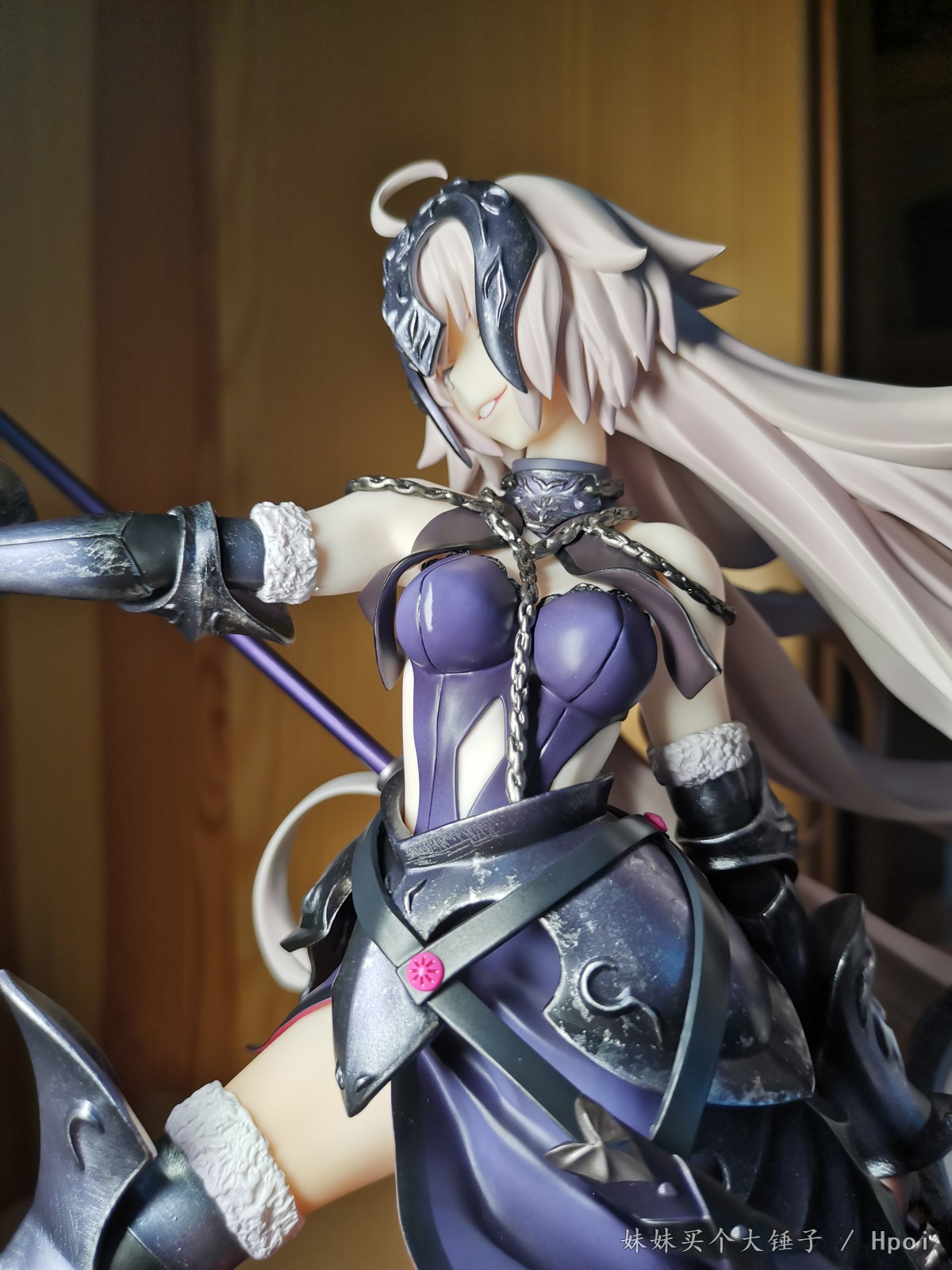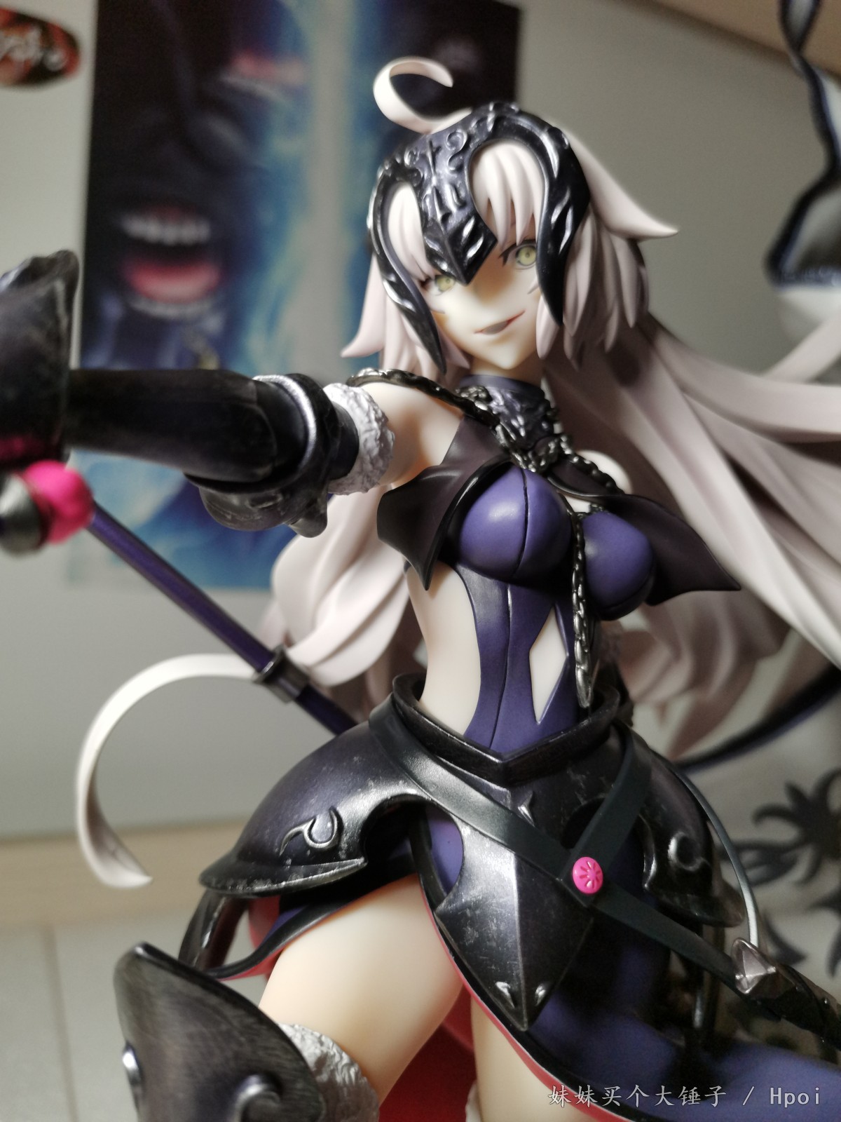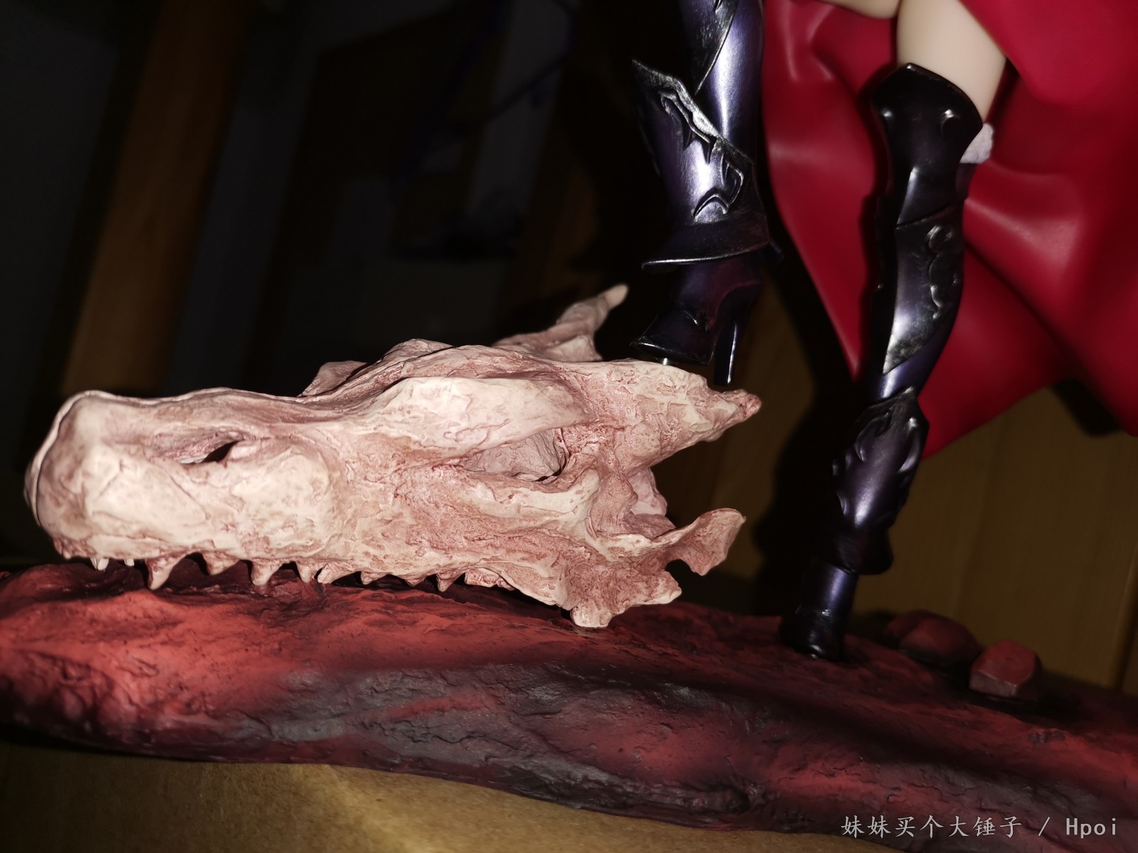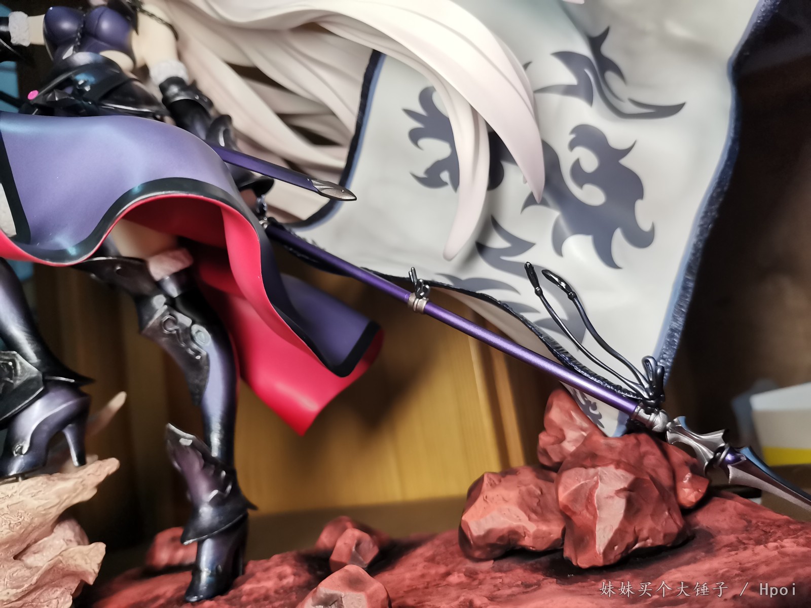 细看之后才回想起官图上面的表情刻画,亮光涂装的大小眼,立体的嘴部,就是这邪魅的笑容啊!仰视的角度看仿佛贞德在看垃圾一样。(这也太戳XP了,不愧是迦勒底最好搞定的女人)再一个非常亮眼的就是她飘逸长发采用的是那种三角块面的的造型(这很武内),线条造型非常流畅,飘逸。再是身上的衣着和细节,背后的勒肉,肌肉线条和肩胛骨的刻画以及前面的衣服那种紧致也是细节满满。然后有个小细节就是细看下面有一条勒出来的线qwq……胸前这个锁链感觉稍逊,做的没有官图好。再接着就是这个铠甲上的亮点,那种银色的旧化磨损效果,非常有金属真实质感。金属紫的渐变涂装也非常有厚重感。ABS的武器,上面的涂装也没有溢色,效果非常好。(用荧光灯照还有强壮壮黑呆的同款惊喜qwq)这款手办的另一个本体,是软胶材质的旗帜——软胶所以不用太担心断裂或者蹭色。旗帜的流苏和挂穗的细节刻画感觉一般。旗杆是外面是有一层金属外壳哈,拿在手里很有分量。连接的处理比大A的那款要好总体这个旗帜是倒立向上飘起,非常有张力。最后就是不得不提的底座——与一般手办不同,采用的是多配雕像的场景地台。红色到黑色渐变的涂装非常有厚重感,地面的阴影涂装也是非常细节。恶龙头骨也呼应了这款手办的名字:身缠昏暗烈焰的龙之魔女。上面的雕刻细节,不是那种新鲜的头骨感,而是那种沙地——像犹他州National Park里面的red rock给予的那种被风沙侵蚀得表面泛红的粗糙头骨。不过虽说地台非常地好看,但其实对比官图是缩水了的。毕竟是工厂大妈批量生产,也难免哈qwq。有点可惜。