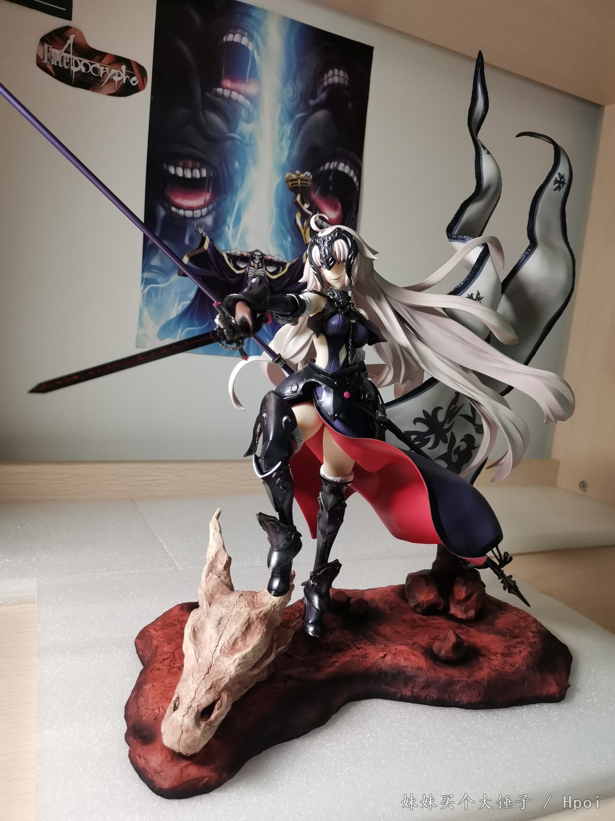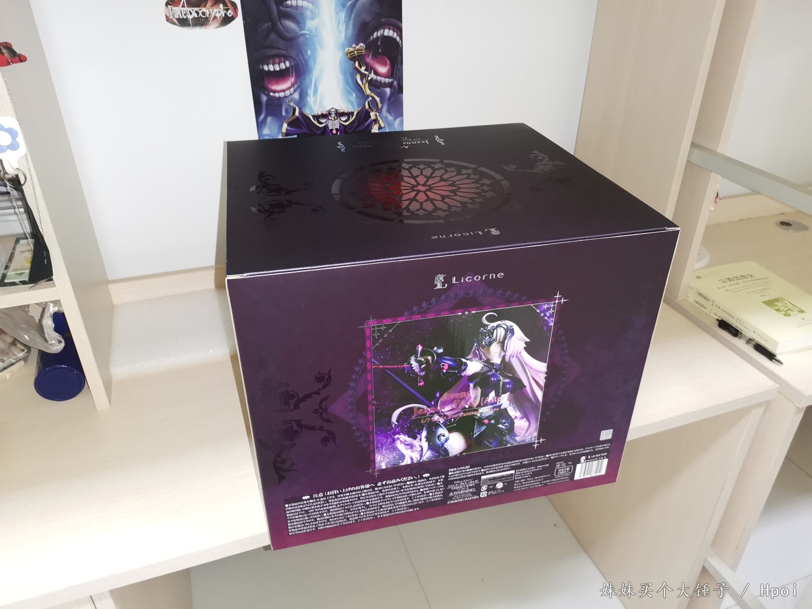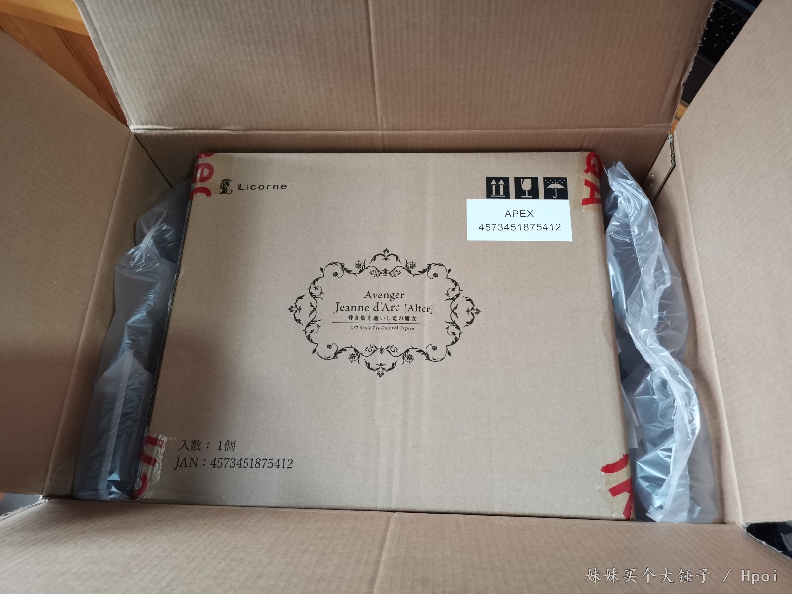 8月11号,终于还是入手了人生中第一款贞德的手办。贼重的大盒子,你说里面装的是大雕像我都信。回家拆开里面还有一个Licorne的盒子,再拆开,里面才是硫酸纸裹着的,装着老婆的盒子。扯开硫酸纸,霸气就侧露了出来。红色的印花,高大上的紫黑花纹……背面还有官图上冒着紫烟的狂气贞德。