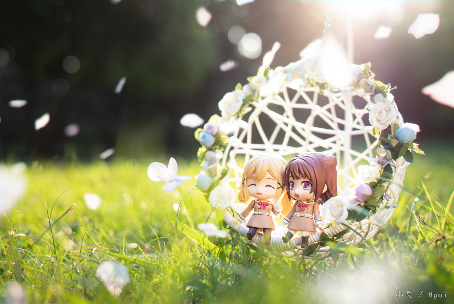 坐在摇椅上沐浴着阳光的二人,忽然发现飘落在空中的重叠花瓣就像蝴蝶一般