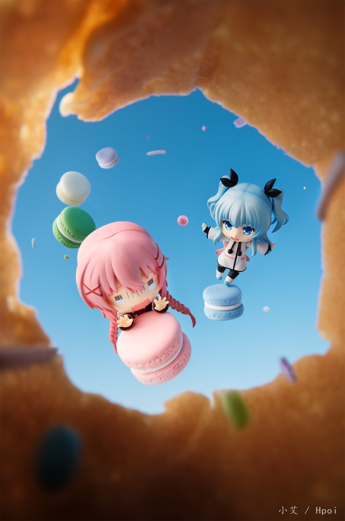 这次外拍依然是以蓝天为背景,以冰淇淋蛋筒为前景,使用柔光布来柔化太阳光,尝试了与粘土人气质非常符合的马卡龙,由于当天的风很大,整个拍摄过程比想象中艰难,好在最后还是成功的完成了。