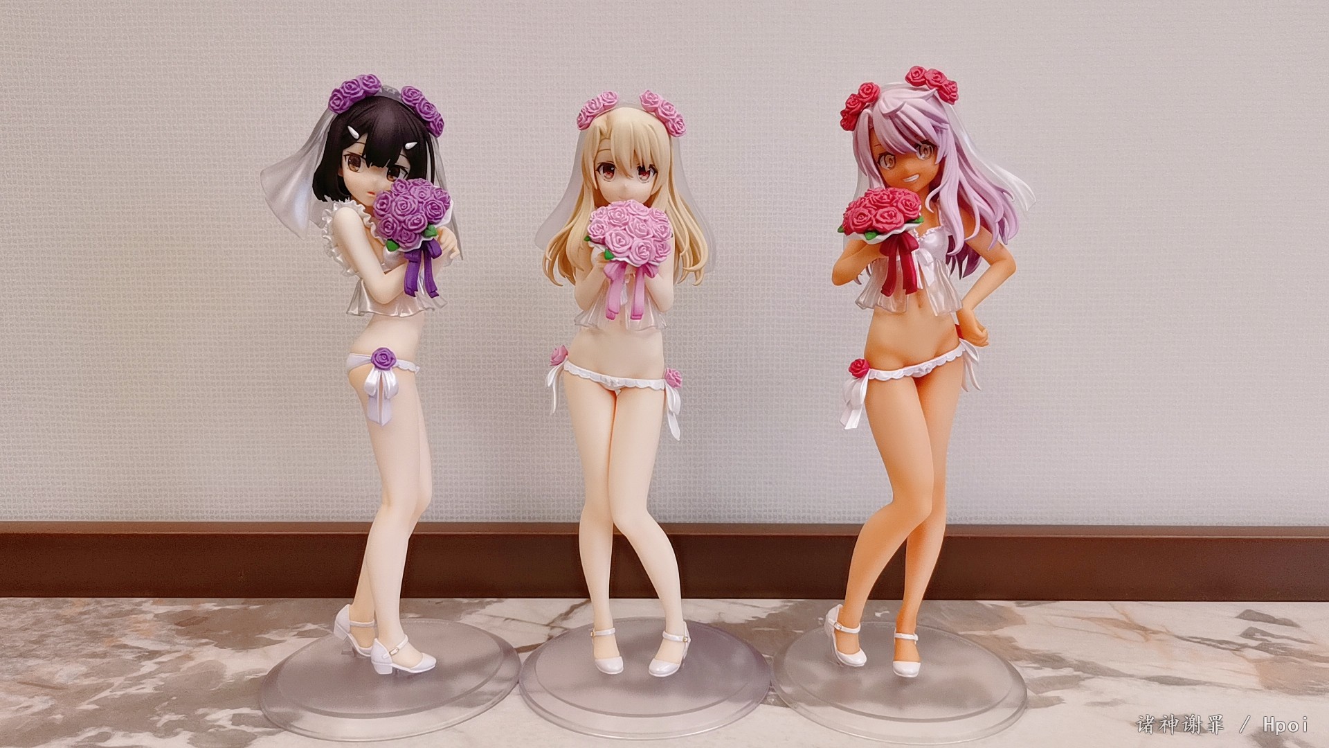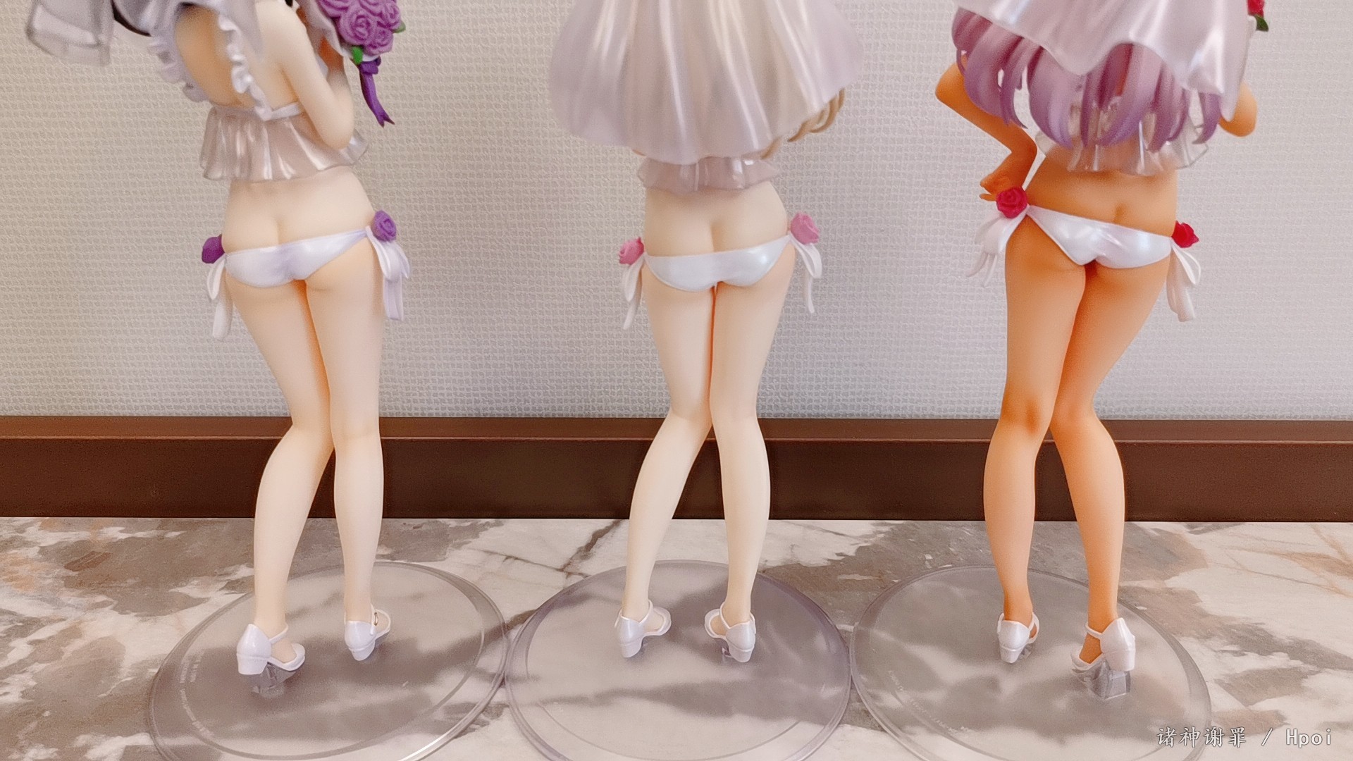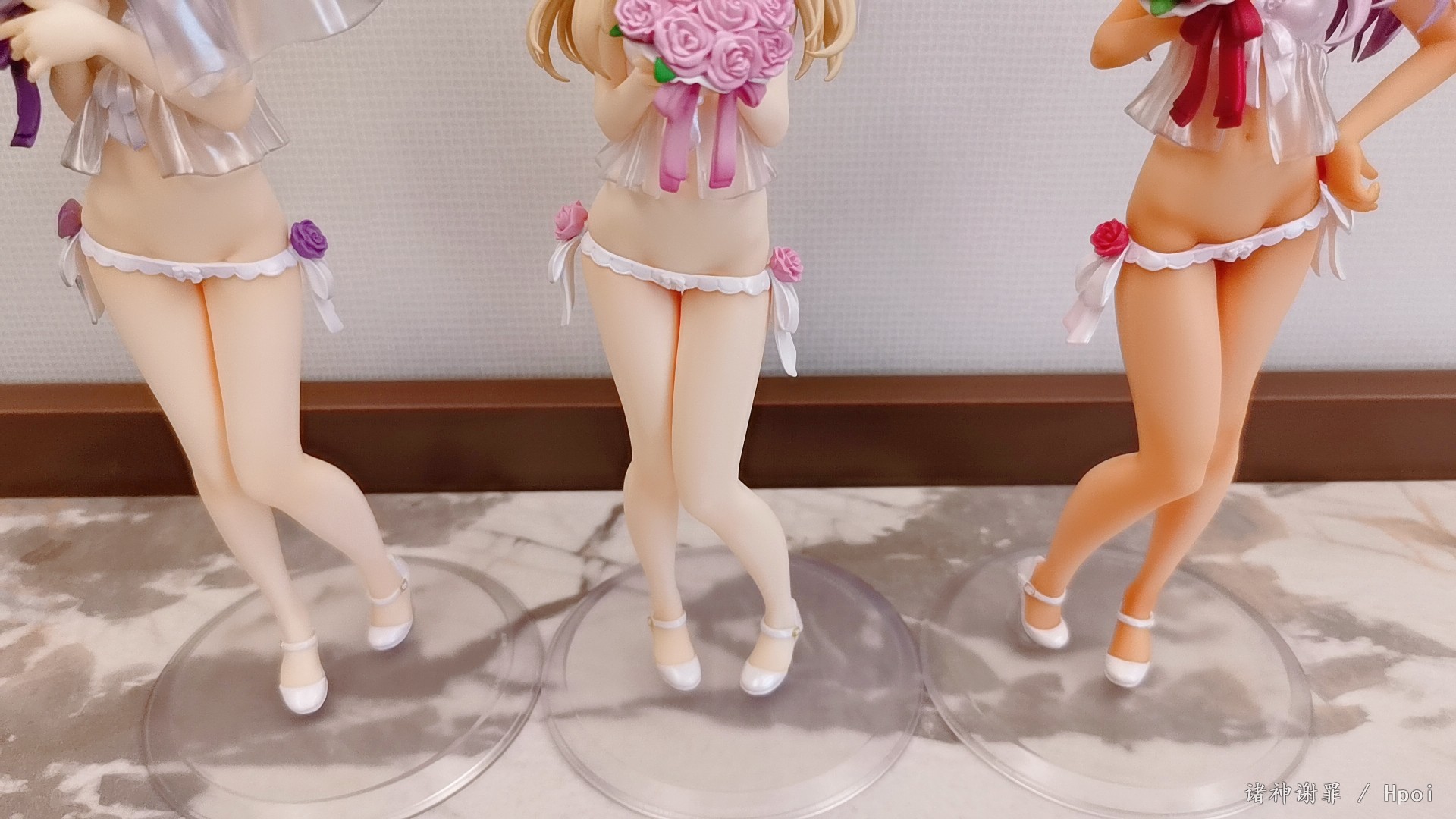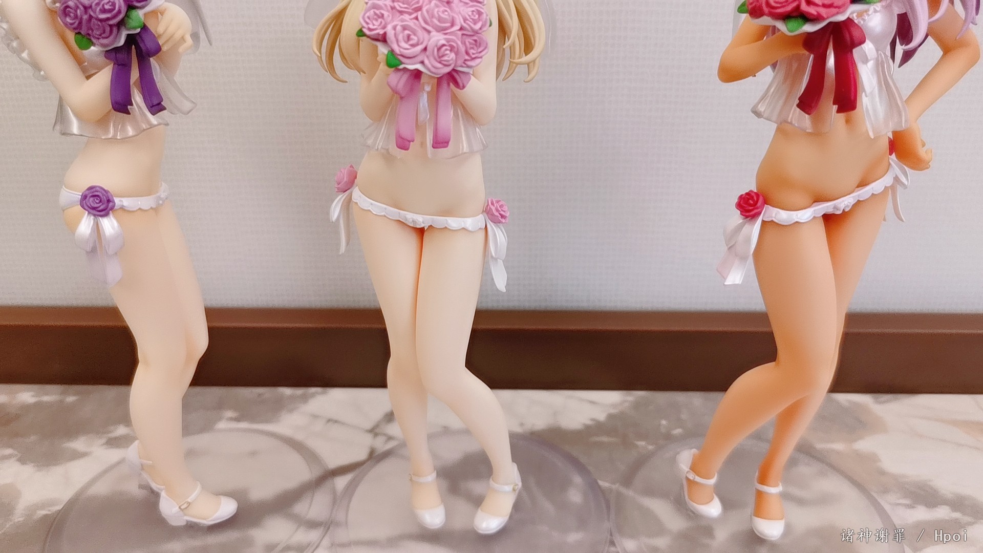 吐槽一下,小黑胖次上的花需要用力插进去,不像另外两个,简单就插进去了。整体不错,没有溢色也没有崩。希望炼铜致富吧,更希望HobbyJapan那一套泳装可以再版,更更希望出一套可脱的魔伊战队。