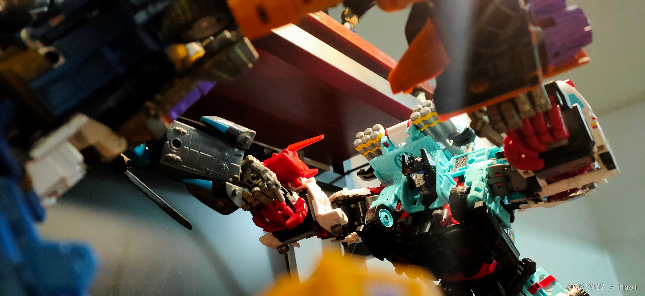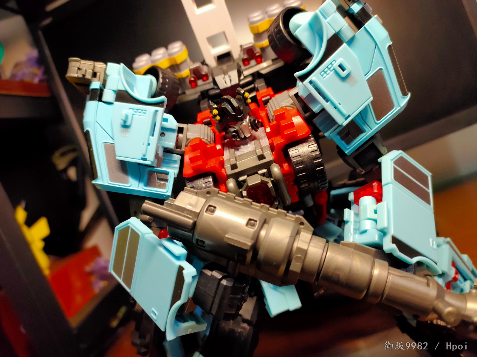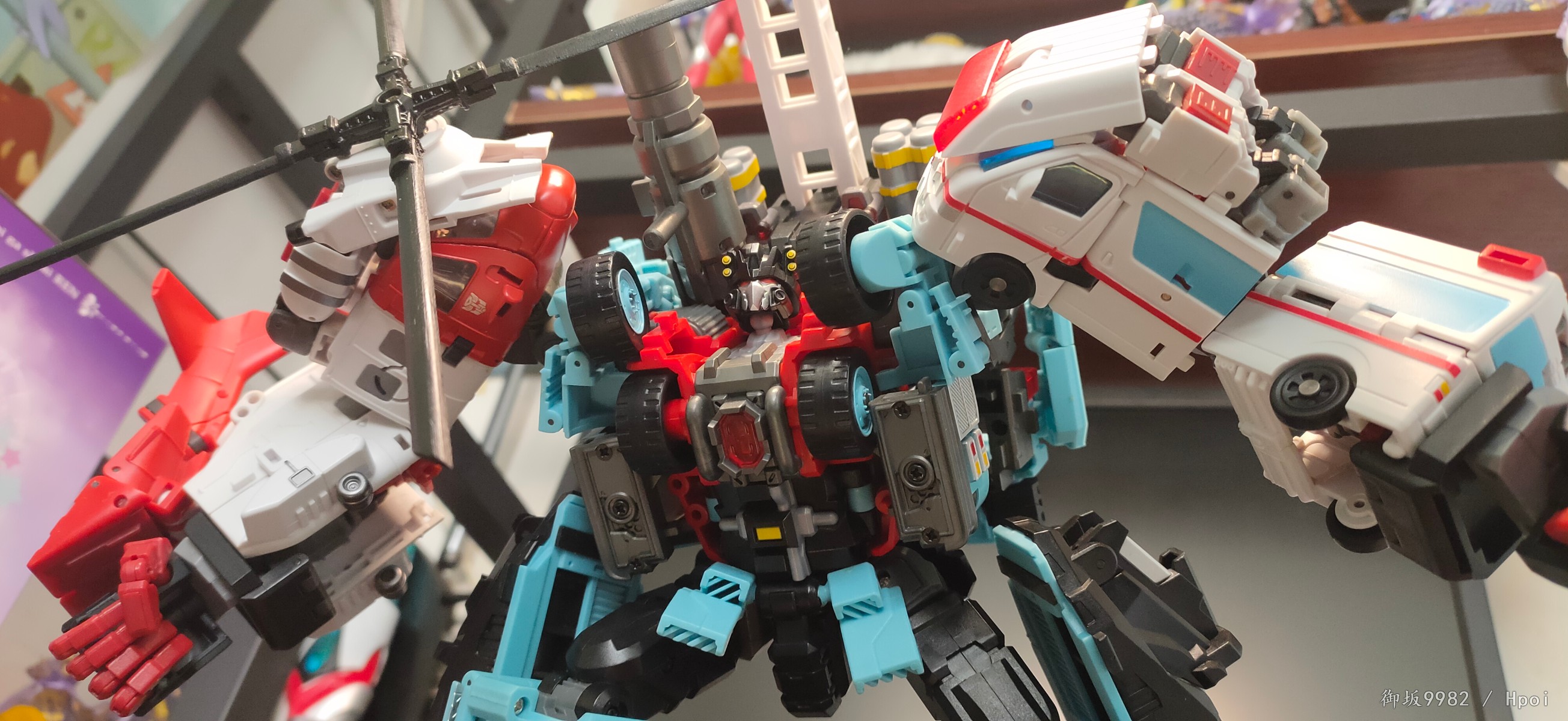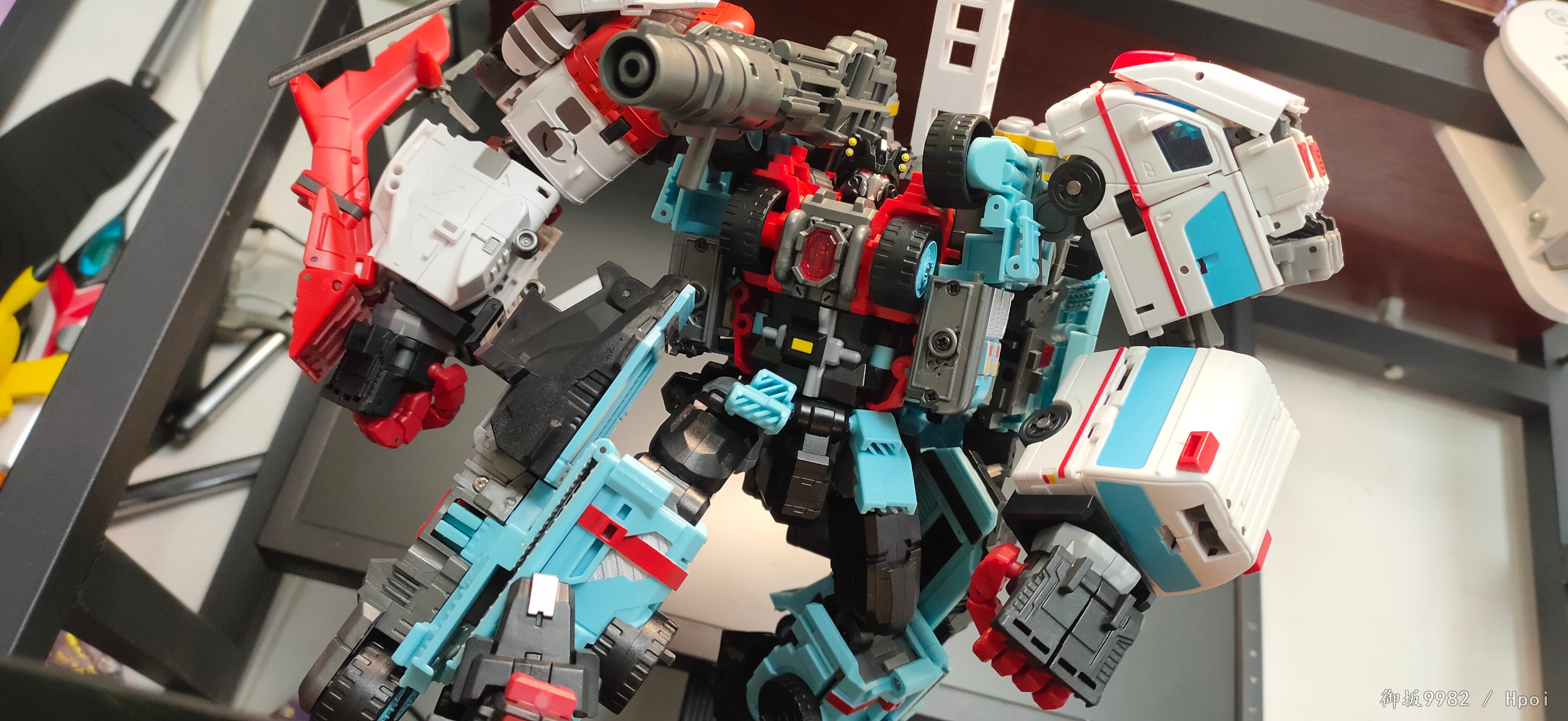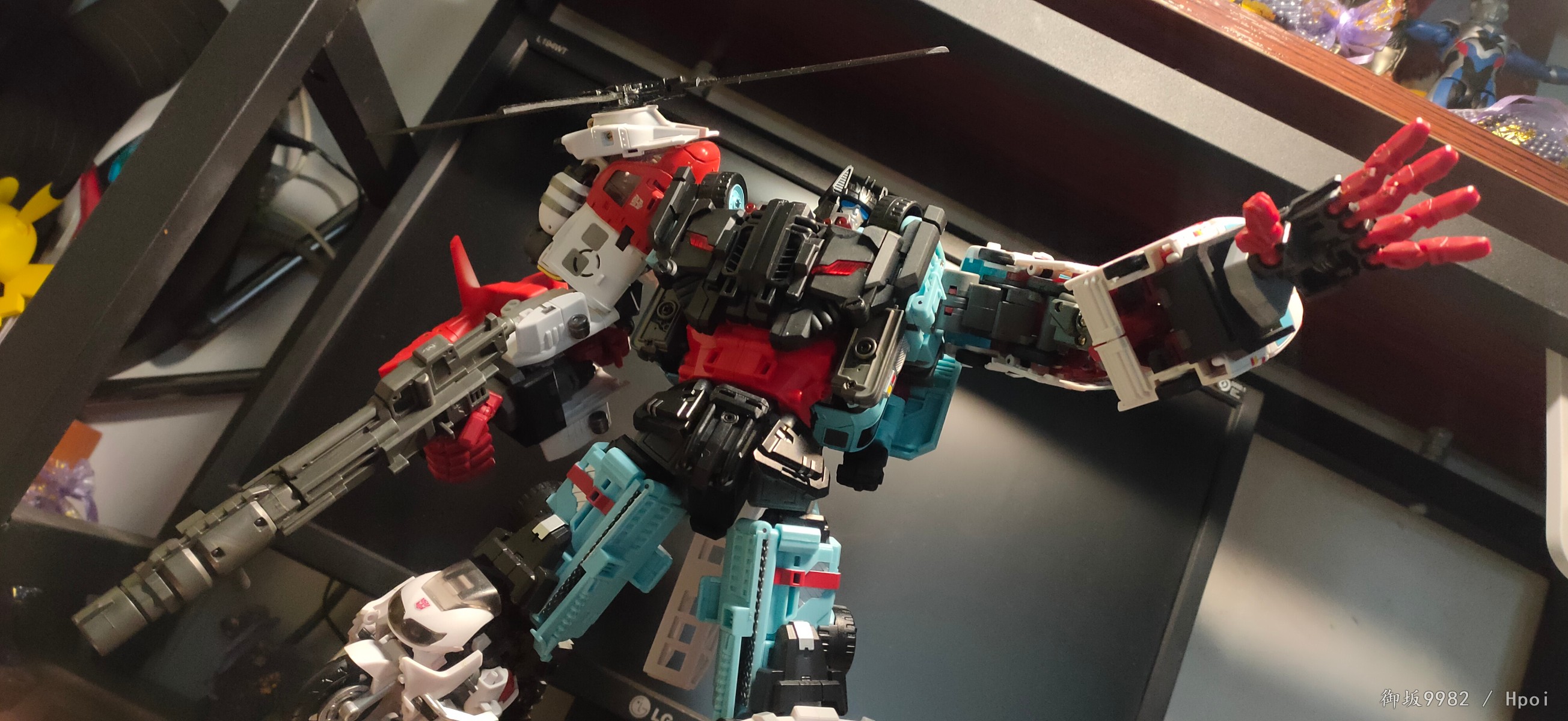 合体形态下的守护神的机械造型说是长在机器人玩家xp上也一点不过分,夸张的装备和敦实壮硕的身材就是往那随便一站都很有气势,也归功于守护神本身配色,mt在这边也是很好的照顾到了一些g1的特征形象,非常漂亮;由刀刃和急救员变成的双臂,关节的设计有非常大的问题,铆钉的链接和零件的镂空使得两只胳膊基本都处于一个松垮状态无法保持侧平举,但下半身都还挺稳的,配合一些张力不太大的姿势整体也是能应付得来;合体形态的肋部和脊背部卡扣基本形同虚设,好在卡不住身体也能依靠热点双臂的卡扣勉强保持不散架,甚至因为卡不住,从而可以解锁合体形态的腰腹可动,算是因祸得福吧。