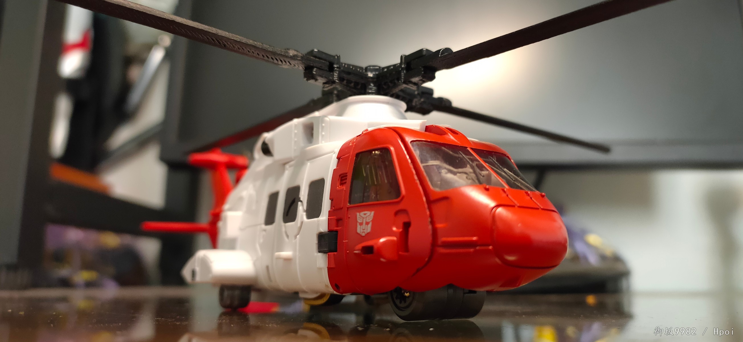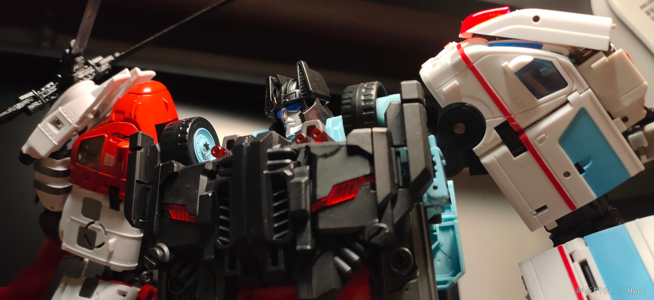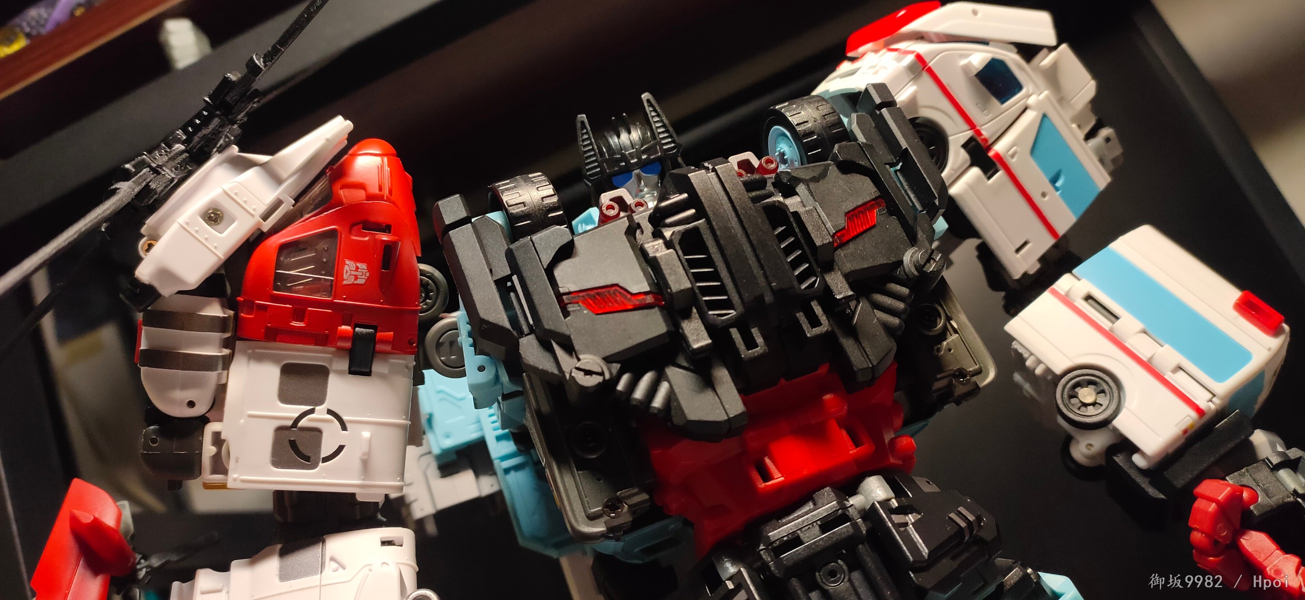 整个机器卫兵小队的变形设计有很多都过分的去依赖到塑料的韧性,这一点在急救员和刀刃的腿部设计上体现的尤为明显,两人结构相同,人形态的双臂根部都无法固定,其中在刀刃螺旋桨设计上mt可谓是自断武功:用鸡肋的桨叶变长刀噱头成功毁掉了直升机形态的螺旋桨造型和稳定性;热点的圣衣变形当年可是饱受诟病,没有配件就无法保证车形态的完整性确实非常很可惜,但人形态加上所有配件后魁梧壮硕的莽汉感觉还挺让人喜欢的;车辙是小队出的第一款,幻视机动天马的人形和十分漂亮写实的警用摩托车本来是车辙最让人期待的地方,却被廉价质感的锌合金部件毁掉了整体口碑,裂的裂断的断,腰和车把自不必多说,我这只甚至连脚上的合金连杆以及前轮刹车盘、油桶脚踏也都全部碎裂,无奈只能请朋友帮忙打印对应零件..好在经历过这次问题mt才给后面的成员取消掉了合金零件的使用;大街综合素质来讲是这套最棒的了,基本没毛病,人形美型度和可动、车辆载具形态的表现都非常令人满意,硬要说缺点可能就是变形时双腿收纳进腰部的卡扣略显纠结一点吧,同样纠结的也还包括刀刃急救员的肩部变形。