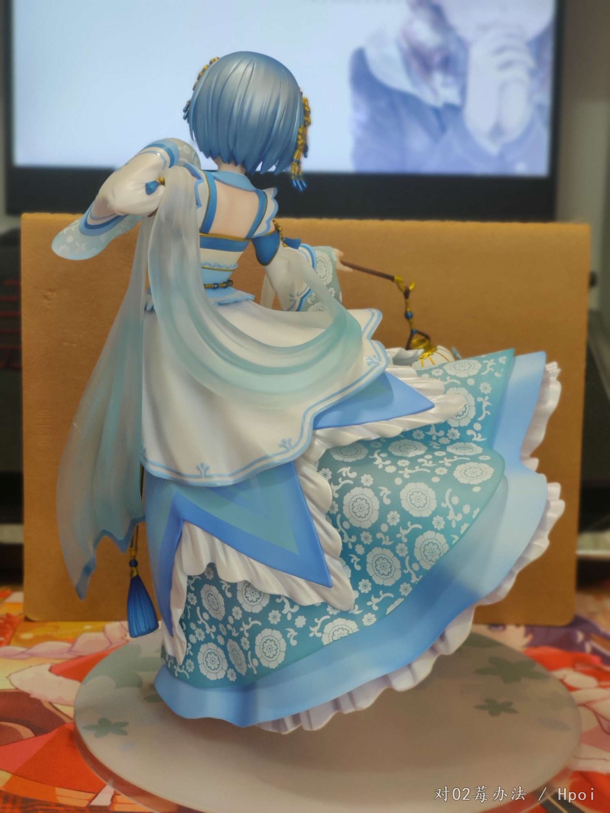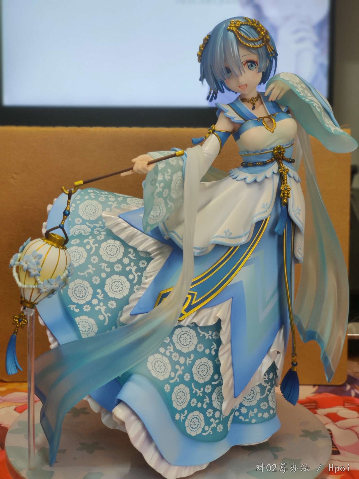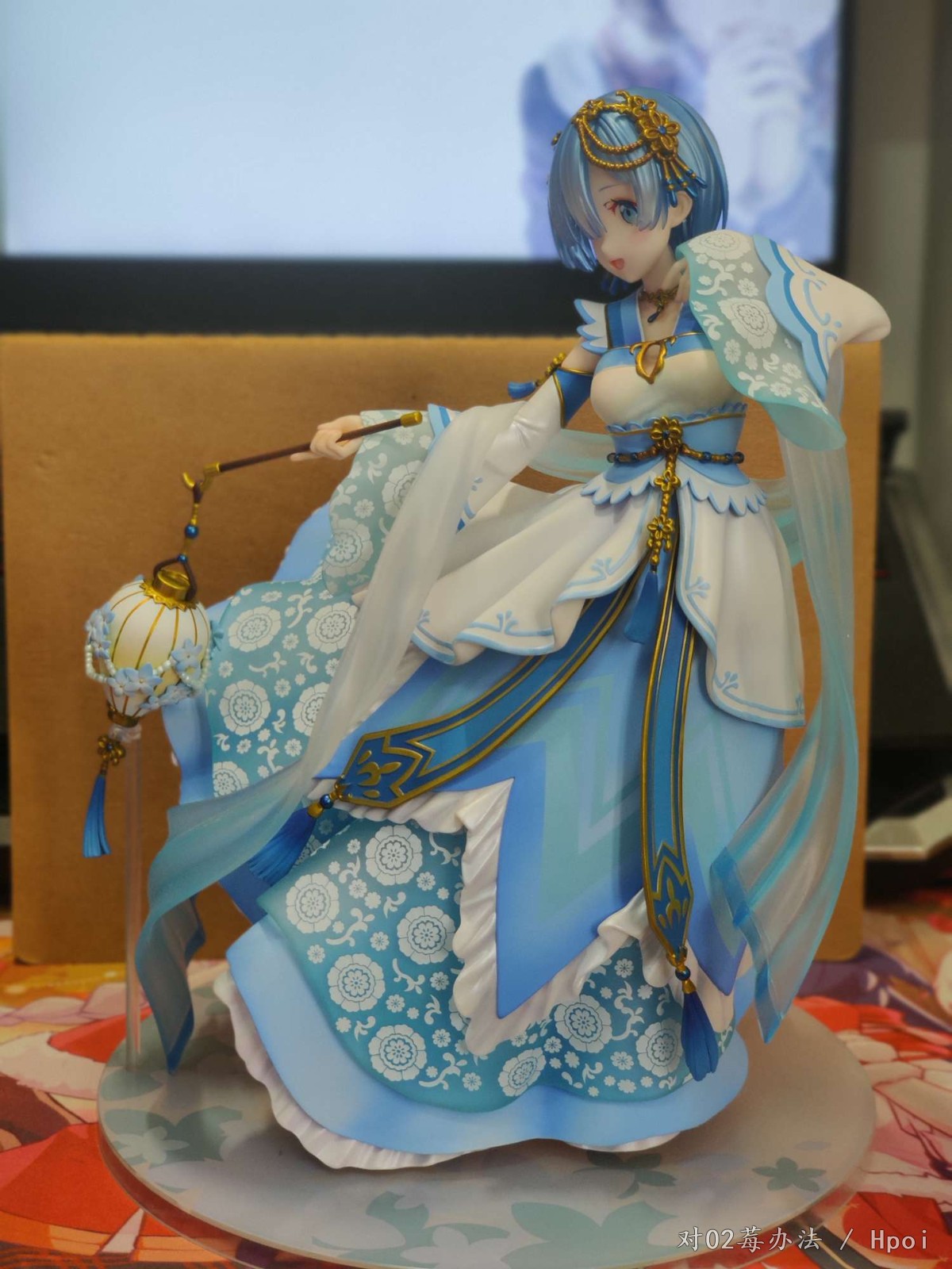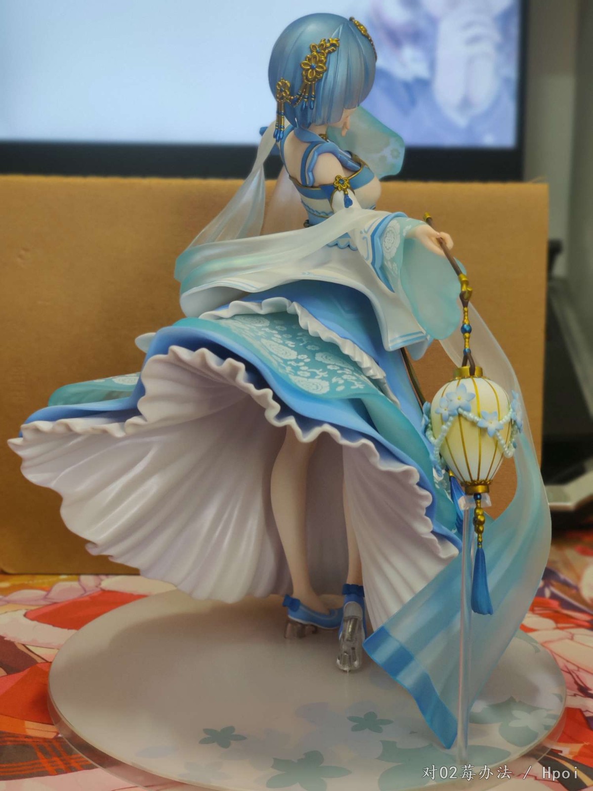 看了手机渣拍后还是心动的就入手吧,当年只买了水晶爱蜜莉雅没钱买水晶蕾姆了,现在拿这个将就一下了。yq期间是真的闲的无聊,宿舍没地方放,也不让拿回家,现在只能回盒堆桌下,闲着无聊拿出来拍两张照片。 很重,这款手办拿在手里就感觉很重,得一手捏着腰,一手扶着底座,底座真不好装,这桩位真的费手。 外裙上的白色印花很规整,感觉像是机器印的。 采用了大量软胶。浅蓝的透明薄纱,是用磨砂软胶做的,不容易断,但是划痕什么的还是有点多(买回来就有划痕),拍照看不出来。 腰部伸出来的两条蓝的带子也是软胶,涂装没问题,毕竟这么平坦再涂不好很难找借口。 此外,手办上大部分金色以及褐色的部件都是软胶材质,头上的装饰,腰上的装饰,灯笼手柄,灯笼下的挂穗等等。 但是最外层白色褶皱裙子的手涂部分还是不太行,蓝色描线有深有浅不够均匀,添笔严重,细看第五张照片能看出来,也可能是我中奖了? 我是原价预定的,感觉不太值这个14张价,但是也还可以接受,现在12张左右能收到,感觉性价比一下子就上来了。喜欢蕾姆的可以考虑双入,两张脸一起摆hhh,不用换来换去。特典是闭嘴微笑脸,我更喜欢开口笑的脸,更有蕾姆活泼的感觉。噢噢,白色的,有小荷边哦