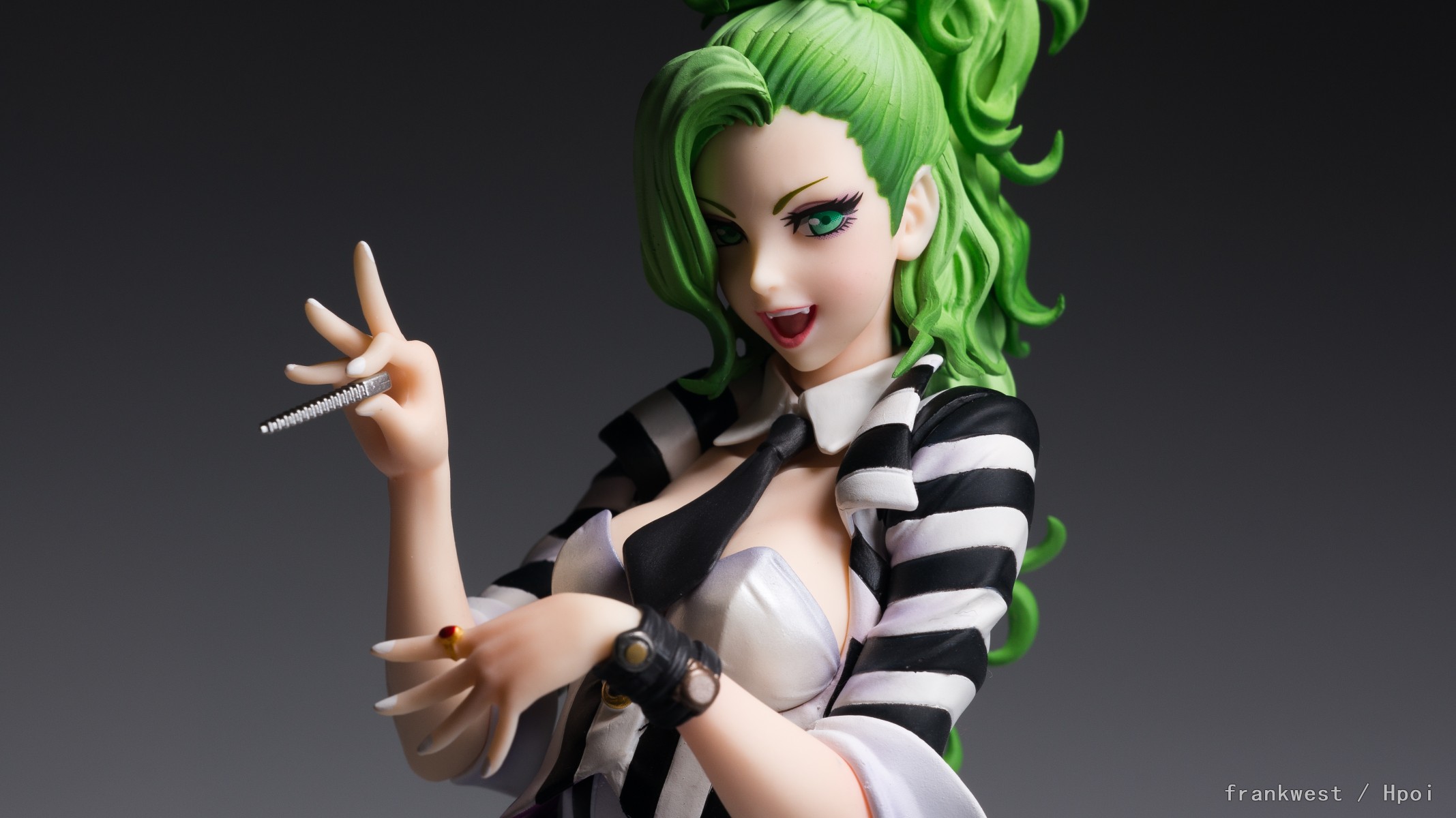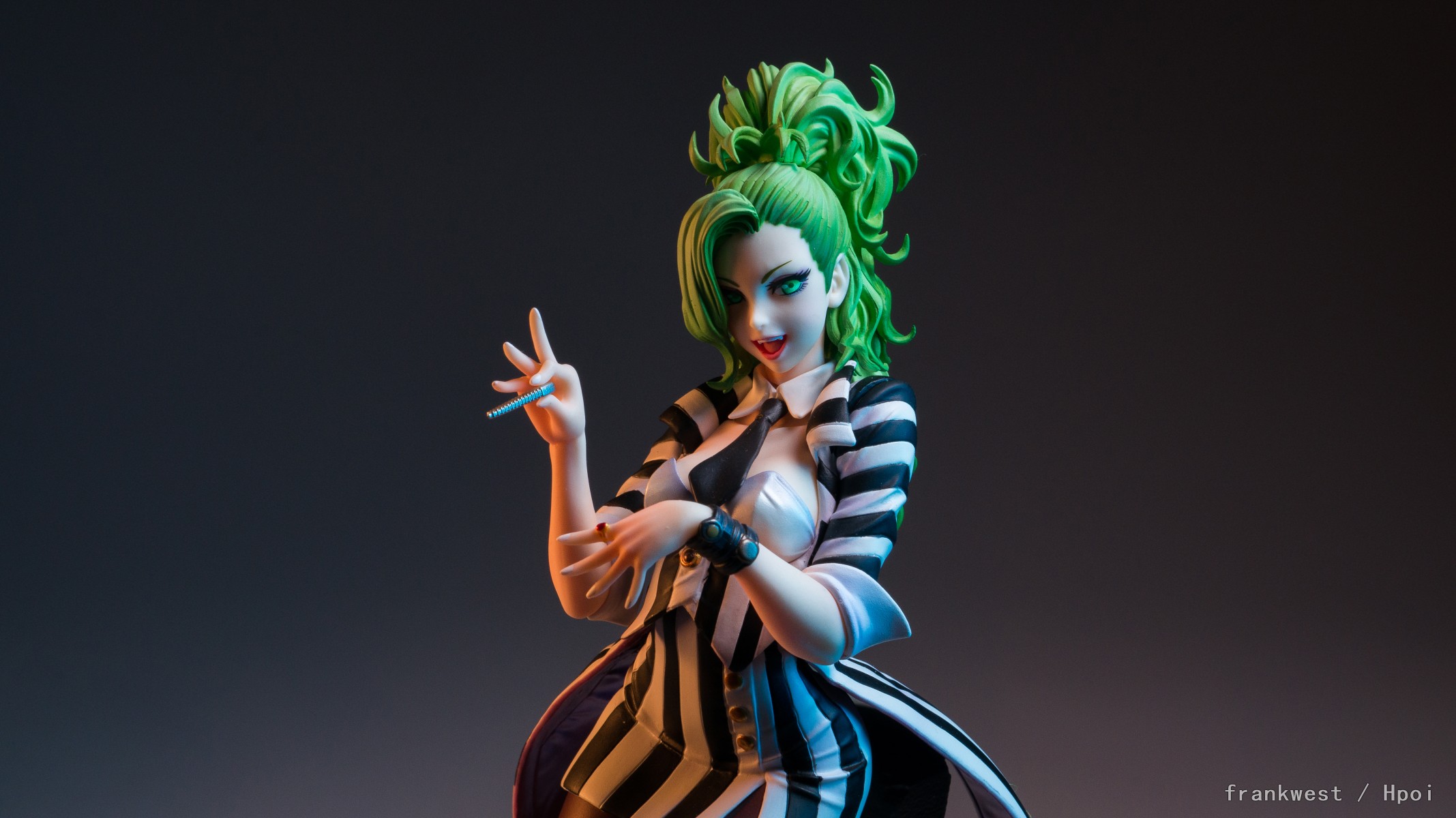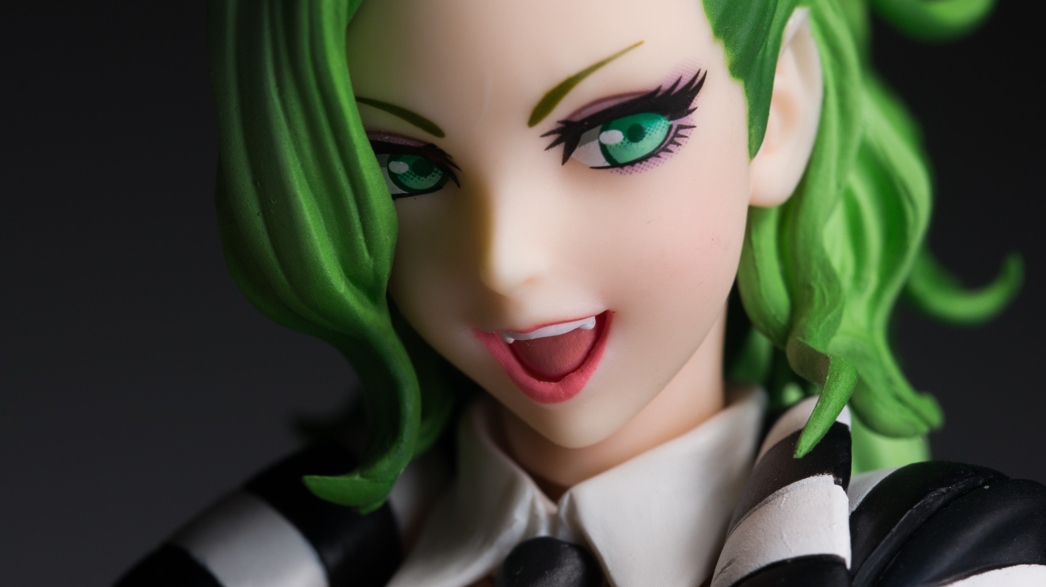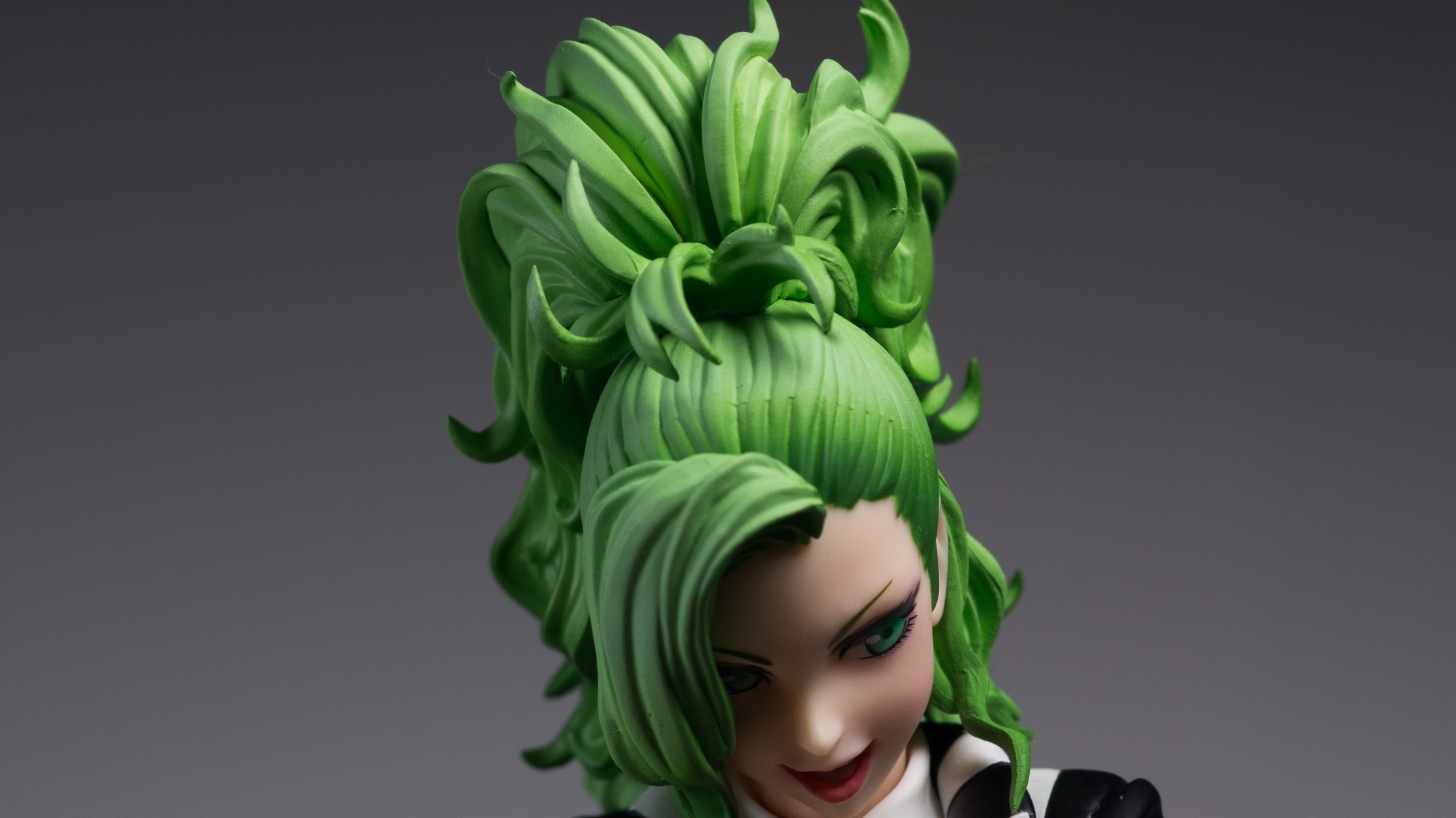 手办的头发部分涂装做了简单的高光效果,顶部到边缘有渐变过渡。不过鉴于此款的价格,涂装水平只能说过得去。另外由于发型比较复杂,在细节上处理比较潦草。能看到一些合模线和涂装不平整,而且发型的尖端也不是很锐利。