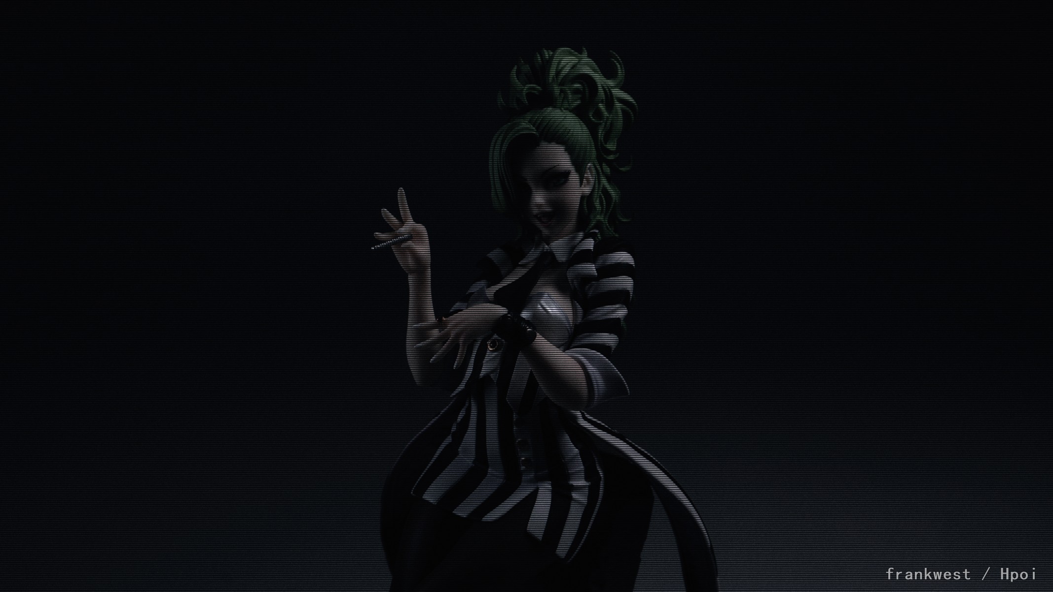 这款的发型非常有个性,巨大绿色卷发在背后垂下,像绿色的火焰在跳动,半边刘海让脸显得小巧,还增添一些叛逆的感觉。
