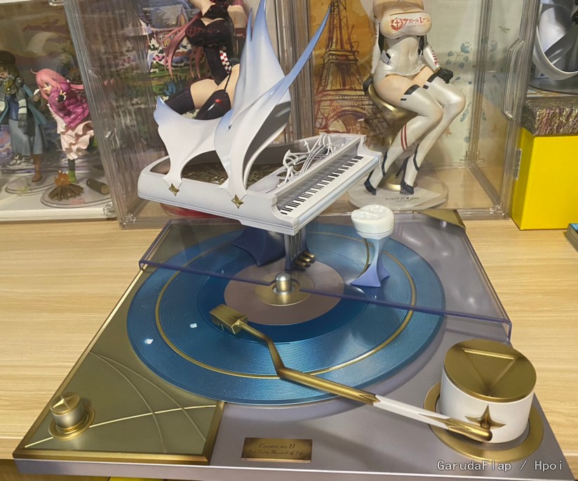 底座的尺寸大约是38cm x 38.5cm,唱片机、钢琴和座椅是一体的,除了钢琴需要装一根支撑杆外,整个底座没有额外的零件需要安装。底座上有金属铭牌,上面有“Canon in D For every Moment of Life”的铭文,也就是这款手办的名字“D大调卡农 至生命中的每时每刻”。比较可惜的是,铭牌并没有编号。