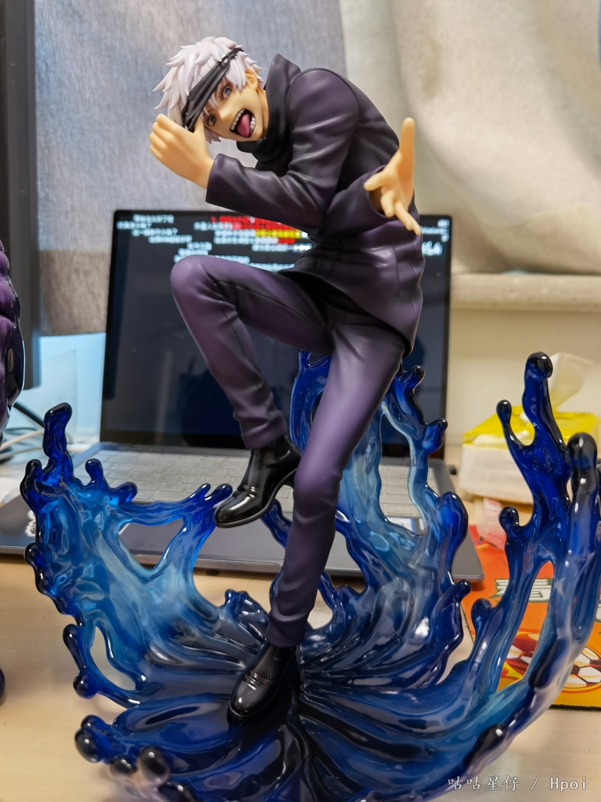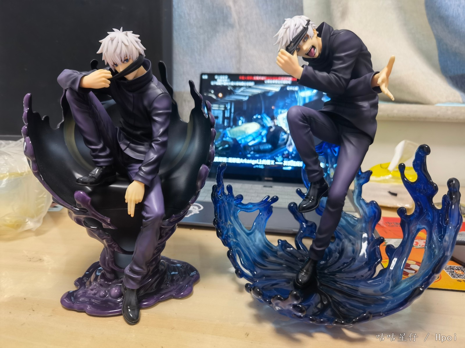 相似:据说是同一家生产厂家,做出来的东西确实有很多相似之处。皮鞋、眼罩、衣服质感大致相同,做工也都在线。 区别:妇幼的衣服相比SSF要亮一点,并且紫色阴影涂装运用较多。妇幼的眼睛是蓝色,SSF的是蓝白渐变色,相对要浅不少,个人更喜欢SSF的眼睛。头发部分二者都有淡紫色阴影涂装,妇幼就是正常质地,SSF的头发看起来是用的珠光漆,会更闪亮一些。 价格:妇幼这只市场价1k左右,而SSF的只有6、700,相比之下还是SSF性价比更高一些。不过还是要看个人喜好,毕竟风格差异过大,一个安静美男子一个疯批美人。自己不喜欢的东西再便宜也是亏,有条件的话还是不要将就。 总结:两只五条悟两种风格,都做的很不错。相比之下我更偏向于SSF一些,主要还是这个特效件做的太绝了,渐变涂装和通透程度都是斯巴拉西。