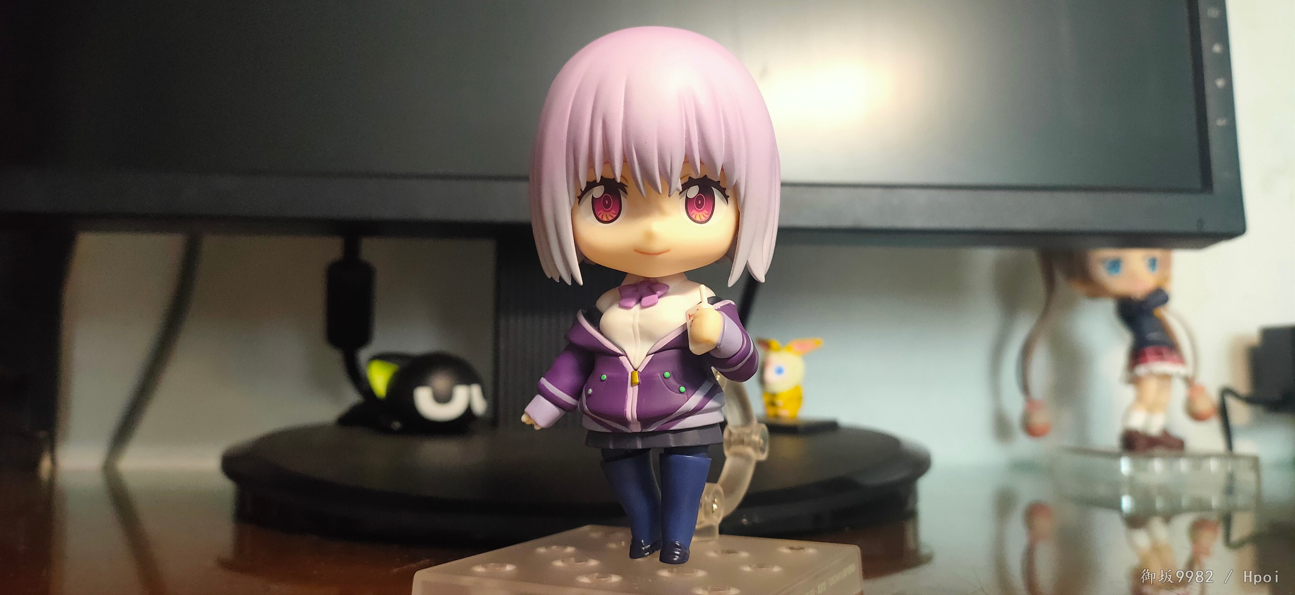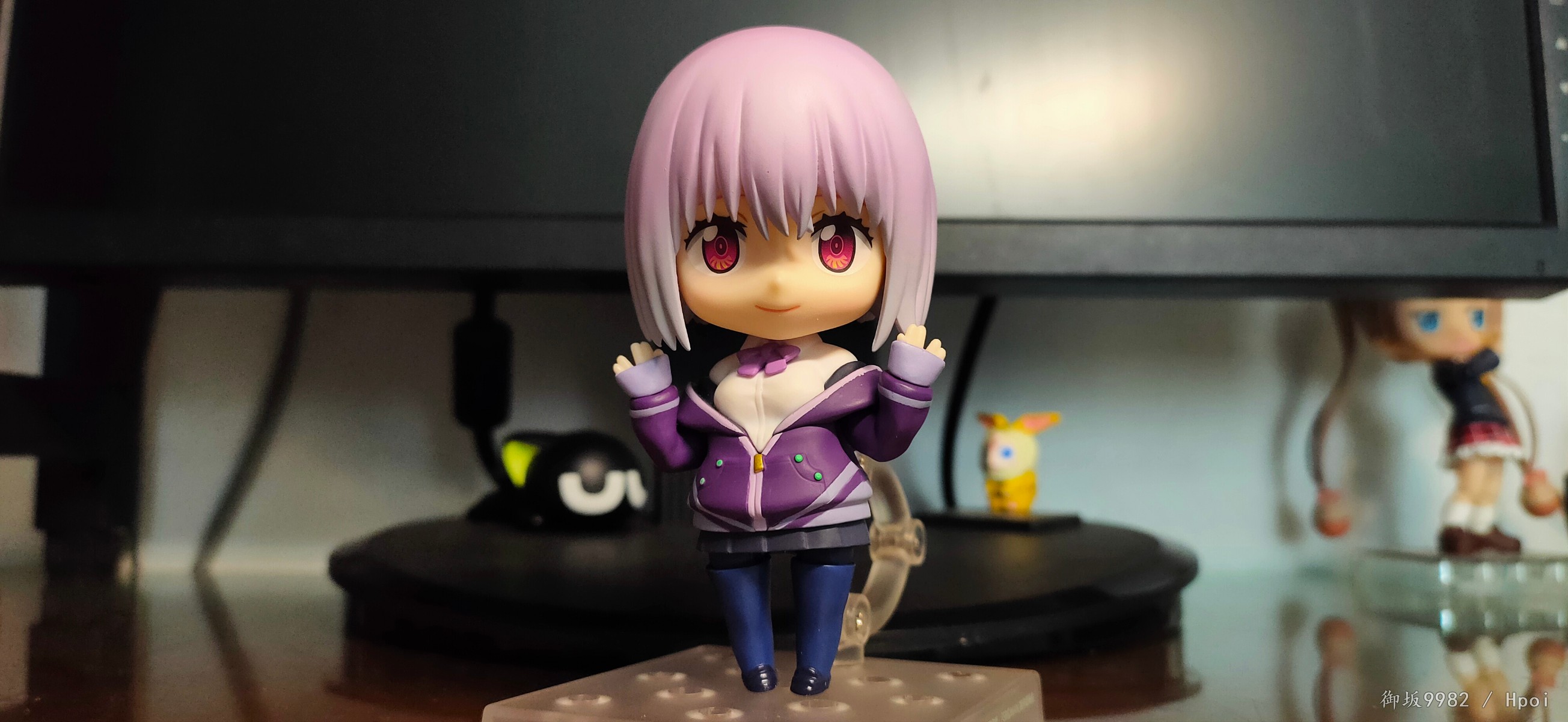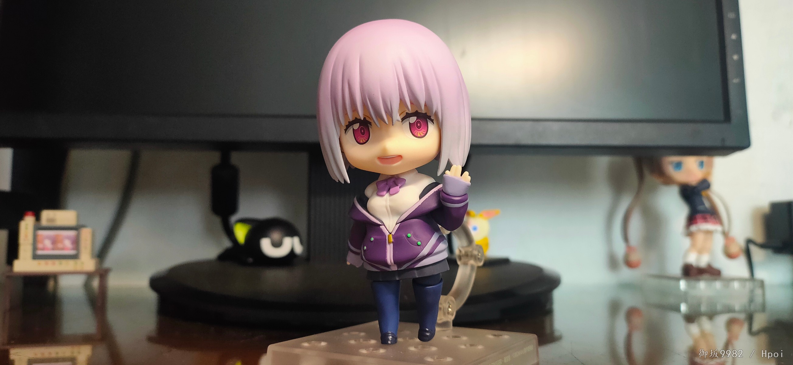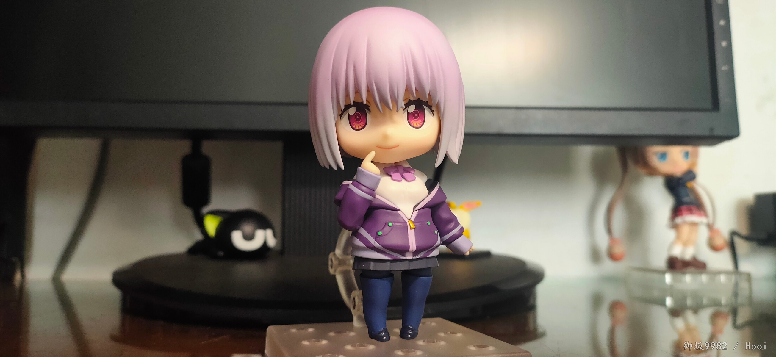 来自现实世界的病娇jk,邪恶镜像擎天柱的异时空同位体,茜给人的第一印象就是那种软软的女孩子,尤其是衣着打扮和性格方面确实能激发人的保护欲,可惜回到家后暴露本性才知道是个厌世病娇→_→...茜在外形上的一大特点也就是她那永远也不会拉上拉链的耷拉外套,虽是萌点,但也给可动玩具的设计带来了难题;面对此等造型,figma在这里使用软胶来分件,但可动和造型还是大受限制;粘土人这边则放弃了通常的插桩关节,连接处采用了和宝多六花的双腿一样的球关,虽也算得上另辟蹊径却也一样对可动没有起到什么帮助并且弯曲造型的那对手臂还装不太稳╮(╯▽╰)╭;配件上来说确实不少,除开显示器和俩 真·粘土怪兽外其他小配件也挺多,还有一对带胖次的裸足⁄(⁄ ⁄•⁄ω⁄•⁄ ⁄)⁄,双眸刻画和宝多六花一样非常漂亮,耳机配件更是增色不少,可惜没有电脑桌和椅子,如果能给到姑妈dx的那种桌椅配置就完美了╮( ̄▽ ̄)╭