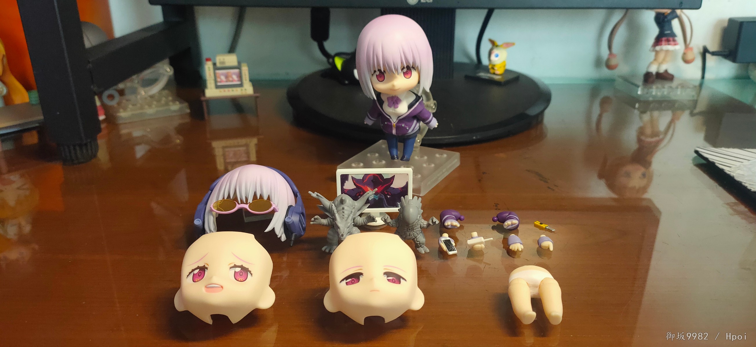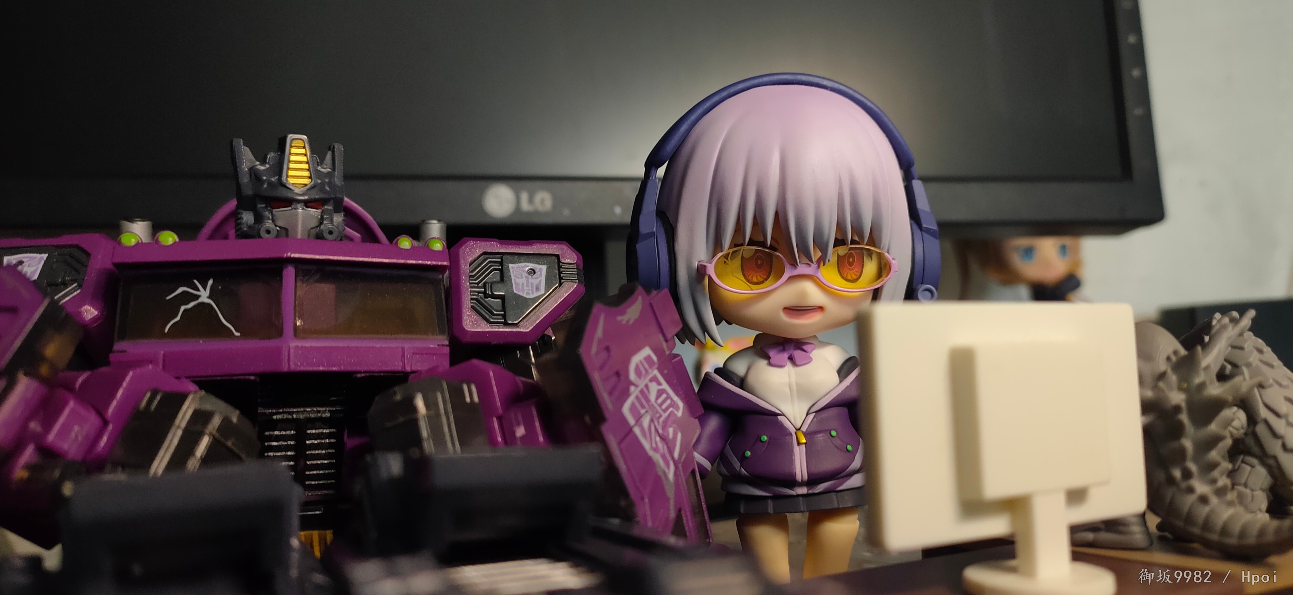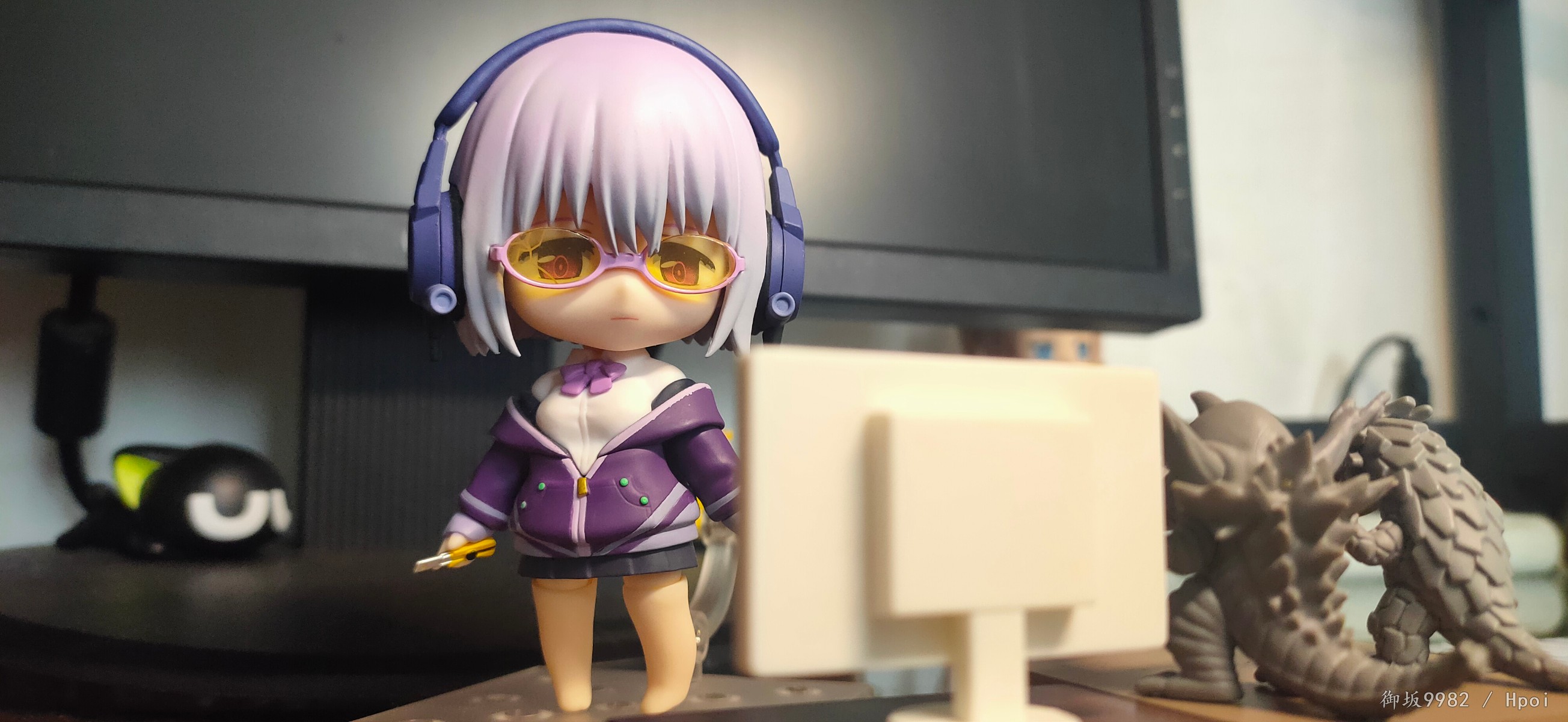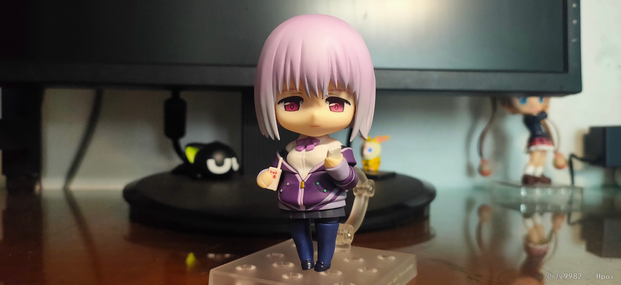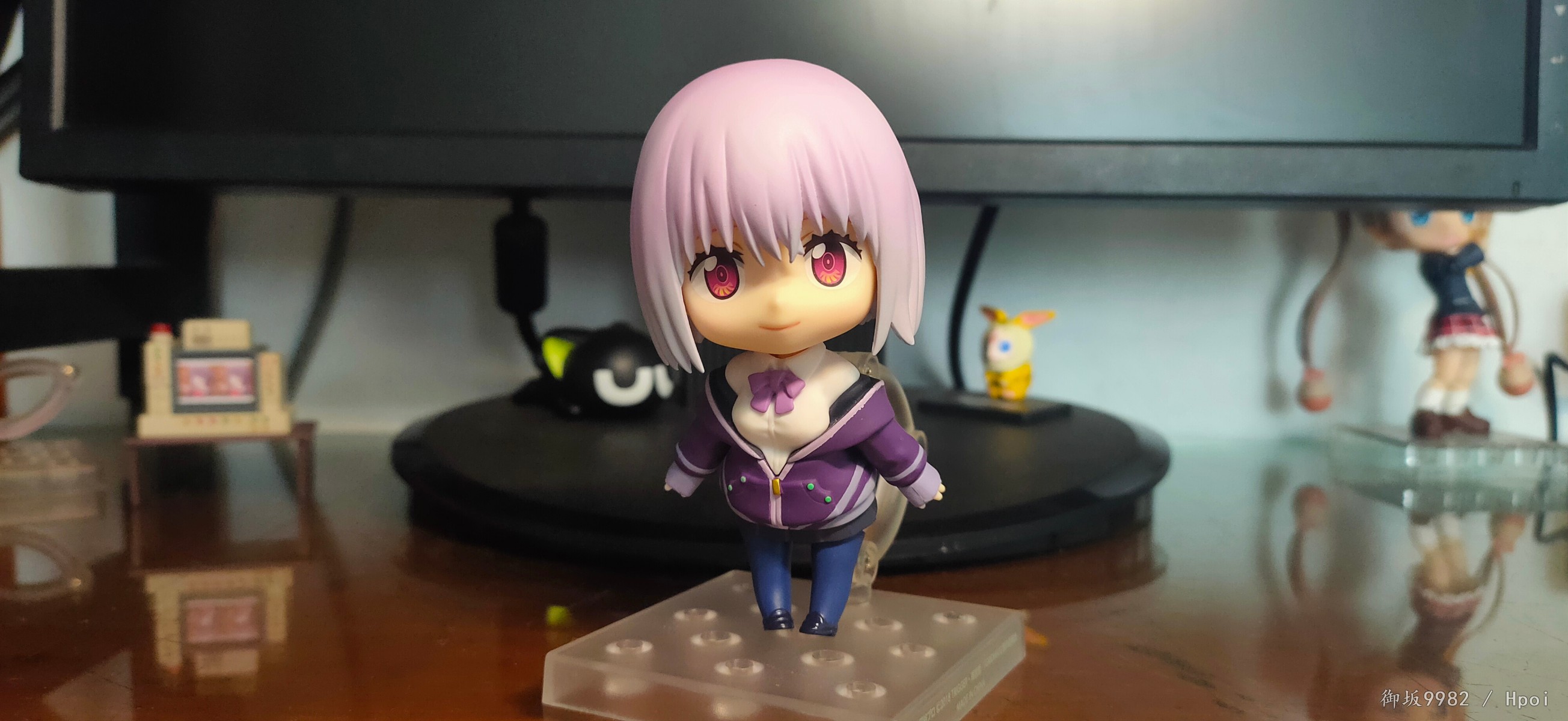 来自现实世界的病娇jk,邪恶镜像擎天柱的异时空同位体,茜给人的第一印象就是那种软软的女孩子,尤其是衣着打扮和性格方面确实能激发人的保护欲,可惜回到家后暴露本性才知道是个厌世病娇→_→...茜在外形上的一大特点也就是她那永远也不会拉上拉链的耷拉外套,虽是萌点,但也给可动玩具的设计带来了难题;面对此等造型,figma在这里使用软胶来分件,但可动和造型还是大受限制;粘土人这边则放弃了通常的插桩关节,连接处采用了和宝多六花的双腿一样的球关,虽也算得上另辟蹊径却也一样对可动没有起到什么帮助并且弯曲造型的那对手臂还装不太稳╮(╯▽╰)╭;配件上来说确实不少,除开显示器和俩 真·粘土怪兽外其他小配件也挺多,还有一对带胖次的裸足⁄(⁄ ⁄•⁄ω⁄•⁄ ⁄)⁄,双眸刻画和宝多六花一样非常漂亮,耳机配件更是增色不少,可惜没有电脑桌和椅子,如果能给到姑妈dx的那种桌椅配置就完美了╮( ̄▽ ̄)╭