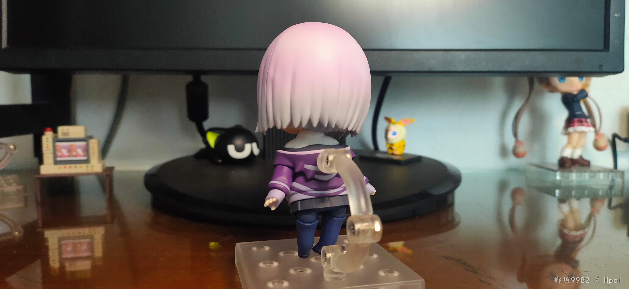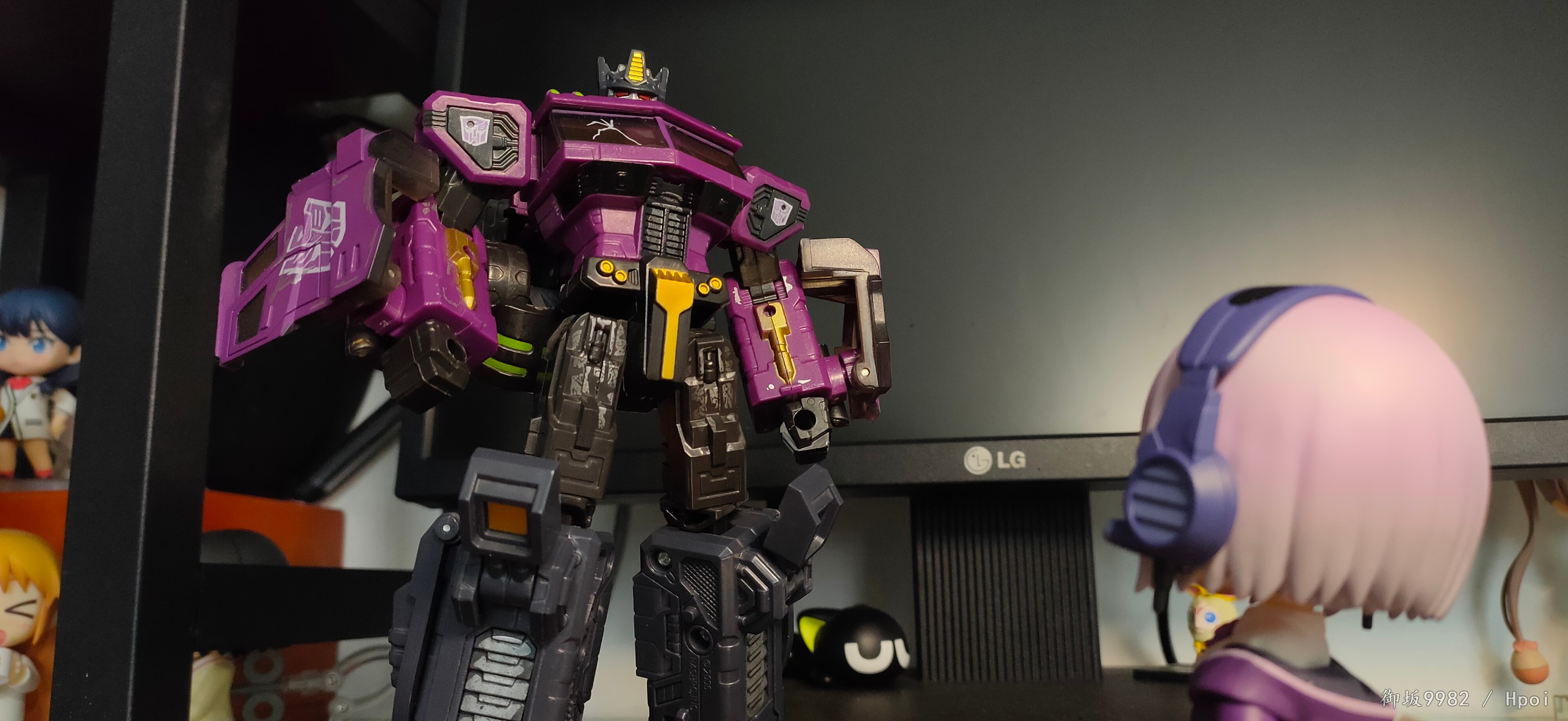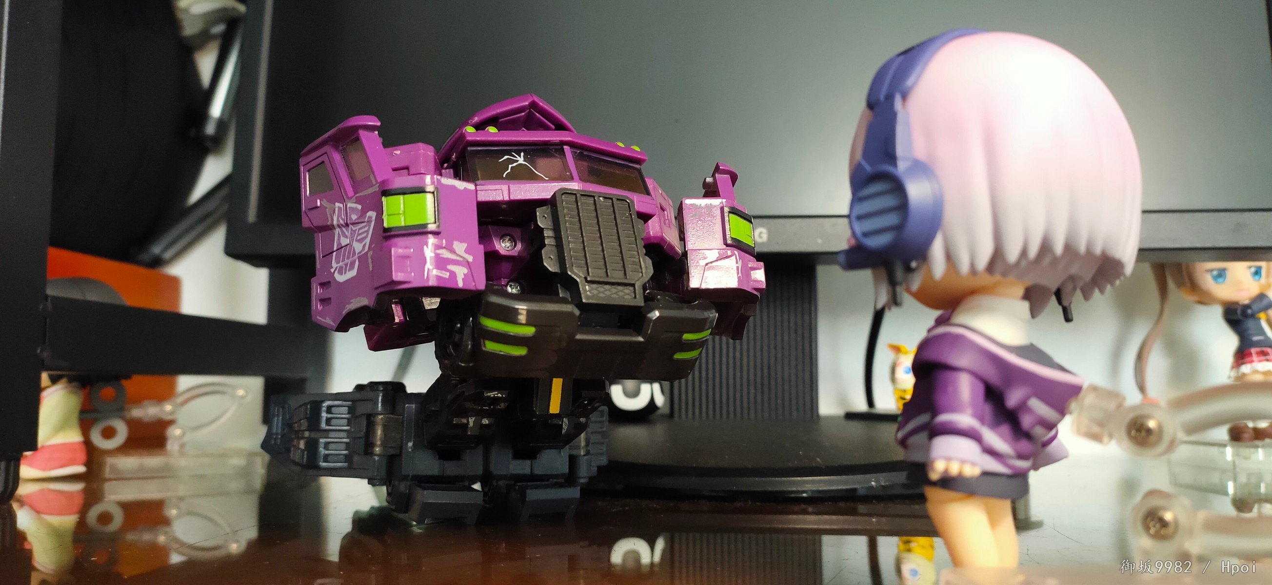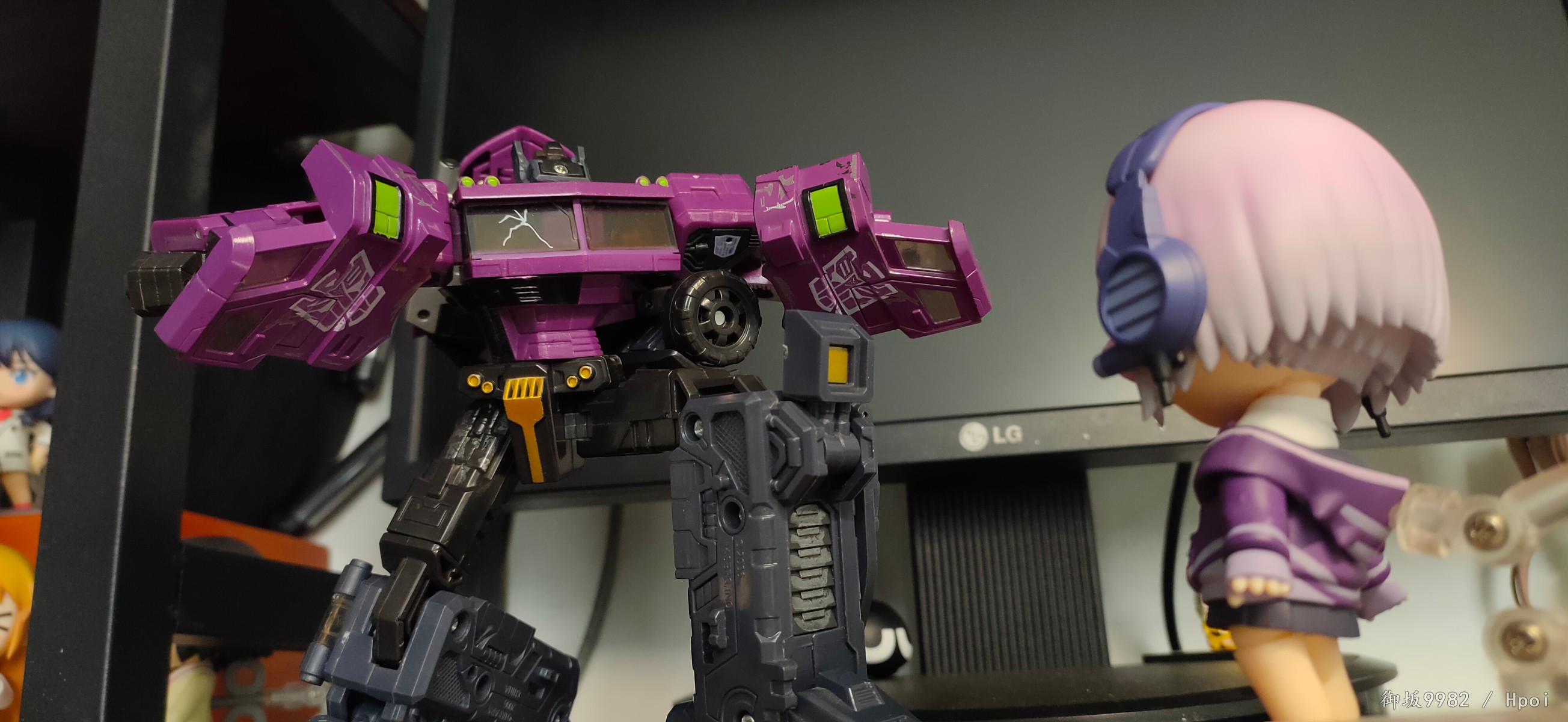 来自现实世界的病娇jk,邪恶镜像擎天柱的异时空同位体,茜给人的第一印象就是那种软软的女孩子,尤其是衣着打扮和性格方面确实能激发人的保护欲,可惜回到家后暴露本性才知道是个厌世病娇→_→...茜在外形上的一大特点也就是她那永远也不会拉上拉链的耷拉外套,虽是萌点,但也给可动玩具的设计带来了难题;面对此等造型,figma在这里使用软胶来分件,但可动和造型还是大受限制;粘土人这边则放弃了通常的插桩关节,连接处采用了和宝多六花的双腿一样的球关,虽也算得上另辟蹊径却也一样对可动没有起到什么帮助并且弯曲造型的那对手臂还装不太稳╮(╯▽╰)╭;配件上来说确实不少,除开显示器和俩 真·粘土怪兽外其他小配件也挺多,还有一对带胖次的裸足⁄(⁄ ⁄•⁄ω⁄•⁄ ⁄)⁄,双眸刻画和宝多六花一样非常漂亮,耳机配件更是增色不少,可惜没有电脑桌和椅子,如果能给到姑妈dx的那种桌椅配置就完美了╮( ̄▽ ̄)╭