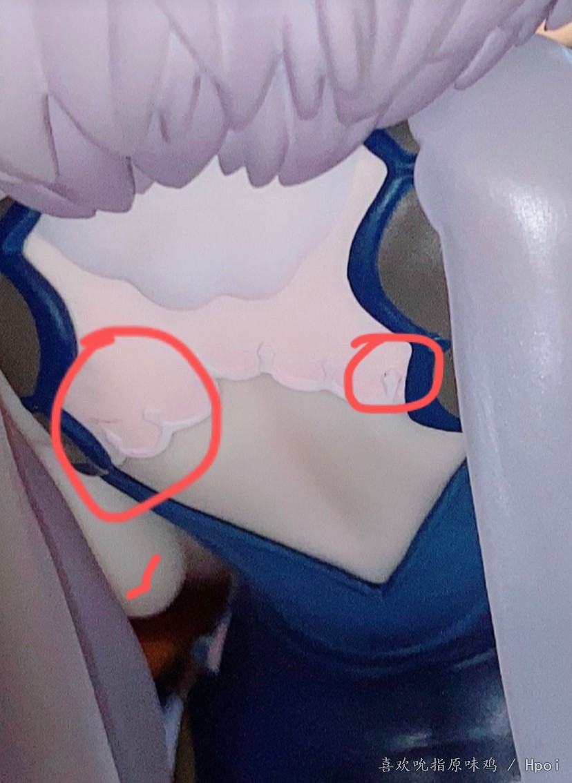 肉眼看比闪光灯拍出来明显很多,从后面看可以很容易看到一块污渍,后面的头发上也有两块污渍,是不是没洗手就上生产线了
