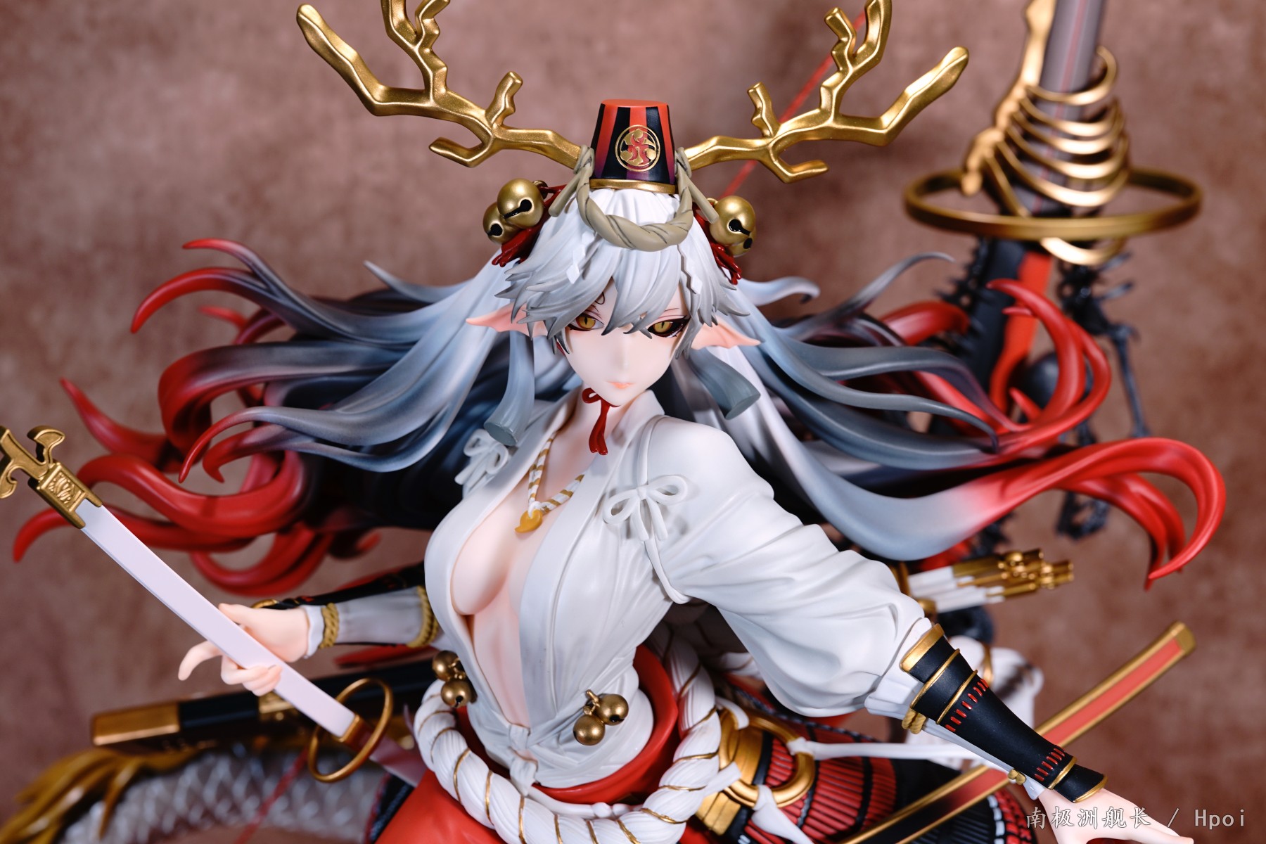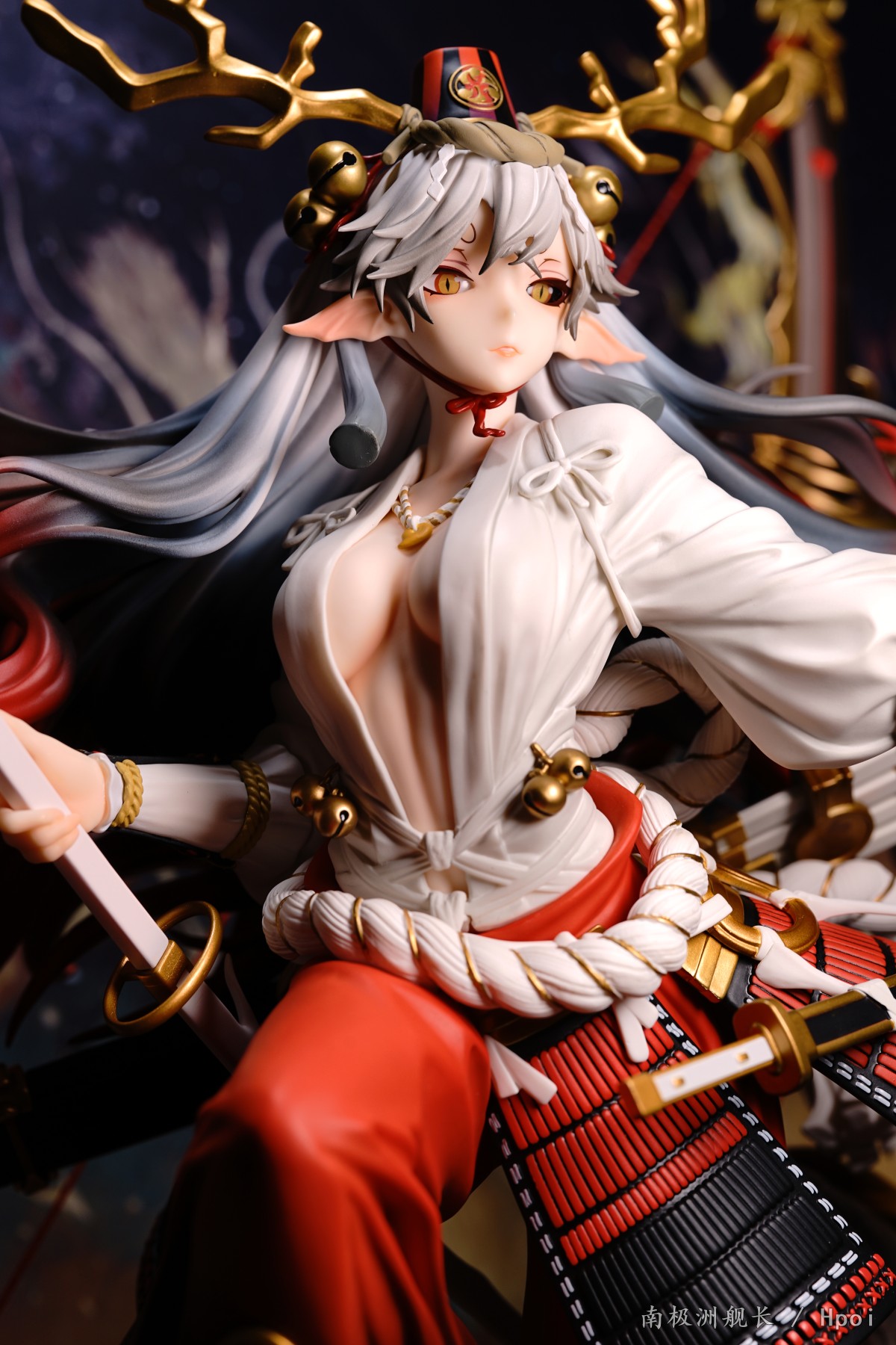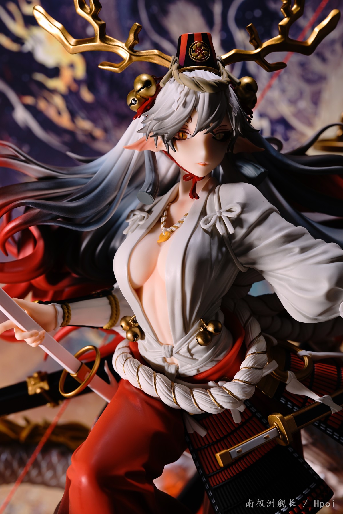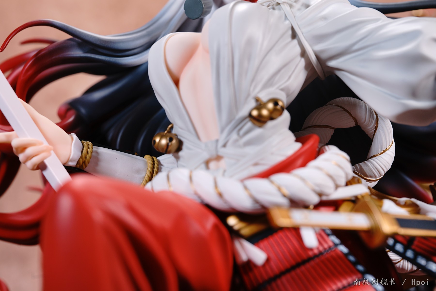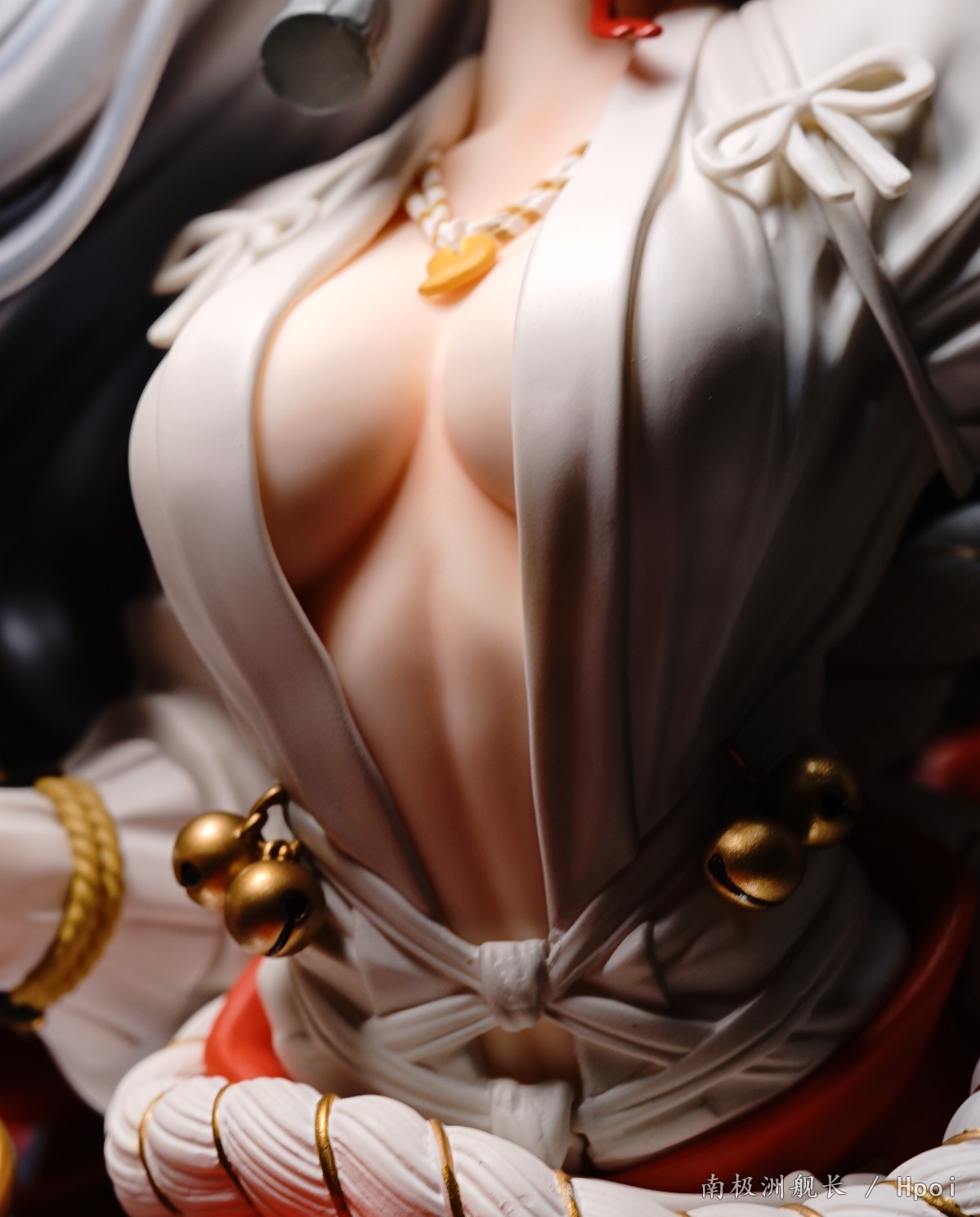 这款铃鹿御前是一只1/4比例的手办,较大的体型或许会让身体的细节处理像freeing一样减少细节。不过这款铃鹿在细节上的表现是出乎我意料的。首先是头发的渐变色涂装,从头顶的银色到中间的银灰色,再到发梢末尾的火红色。这个三色渐变的涂装处理相当不错,(头顶的帽子也是有渐变涂装的哦)。虽然身上的部分没有做什么阴影涂装(裤腿的部分是有阴影+渐变的),但是配饰和腰部的绳子、盔甲涂装都很工整,没有溢色现象,这点要给好评,美中不足的是胸口的项链,涂装略显潦草。另外这款铃鹿的脚做的也非常细致,无论是脚掌还是脚趾的形状设计都细节满满,比直接套一个黑丝然后五个脚趾合在一起的设计强多了。