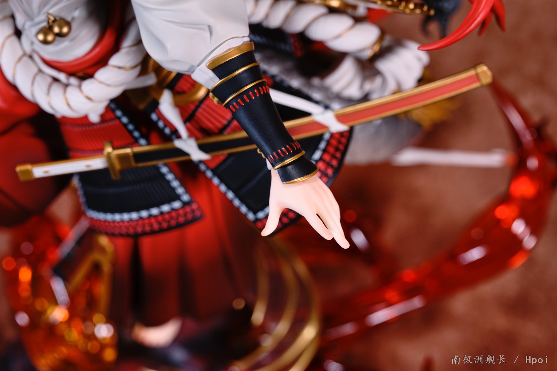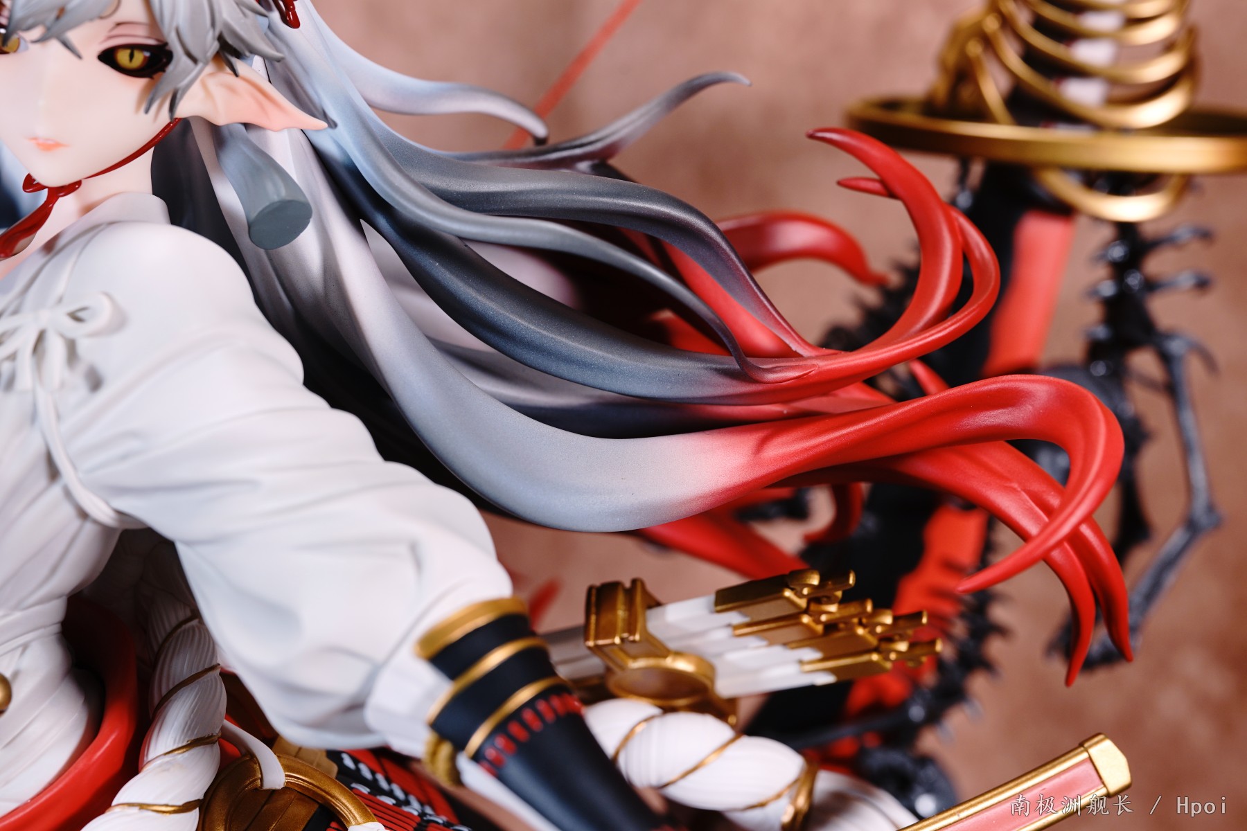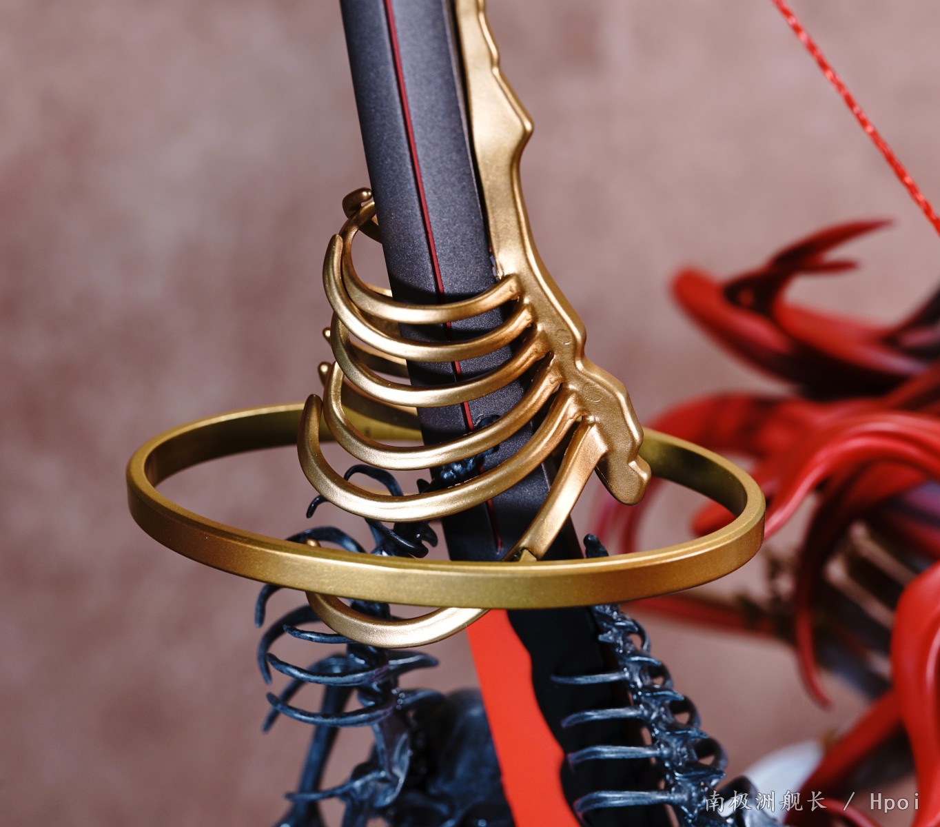 后背的冥弓的弓体涂装相对简单,不过冥弓上的配件骷髅以及金色肋骨的做工却是诚意满满。同时铃鹿的大龙尾巴也是从上到下有从深到浅的渐变,虽然尾巴的质感比较一般,不过能有渐变效果以及尾巴能放在一个火焰特效件的分叉上的设计还是值得肯定的。