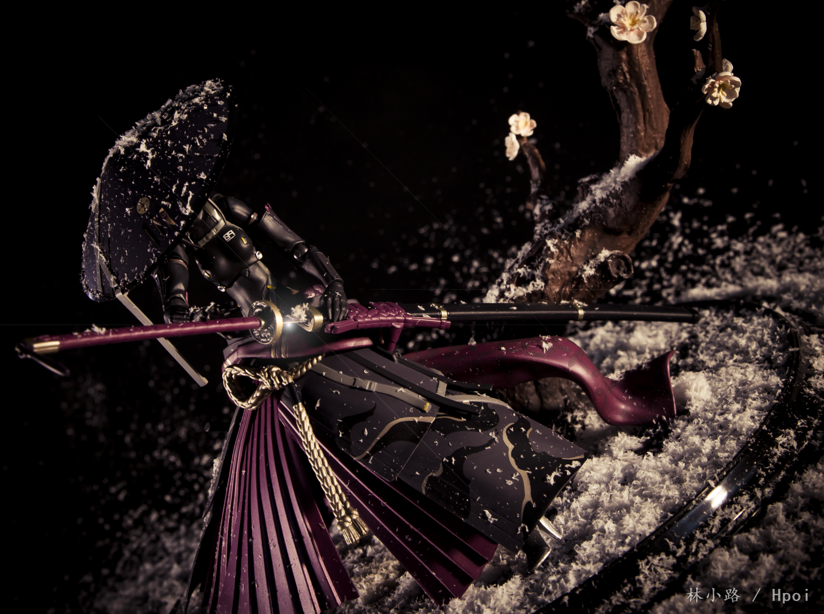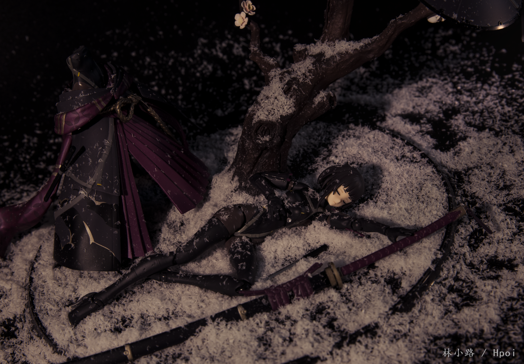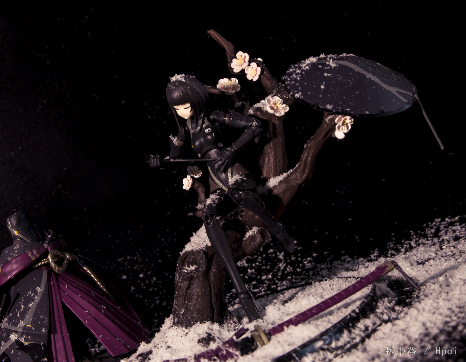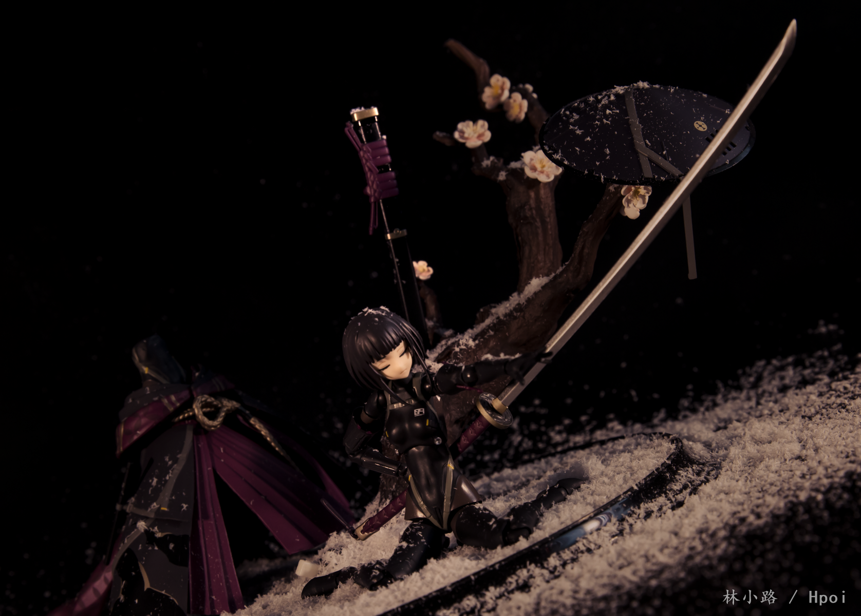 这款浪人脸型感觉还有点呆板,两张脸差别并不大,闭眼脸反而感觉是最好看的一张脸。大太刀、长腿高跟和大裙子感觉非常酷。地台树枝用的是昭君的地台,人造雪景布置起来有点麻烦,事后的打扫挺费劲。