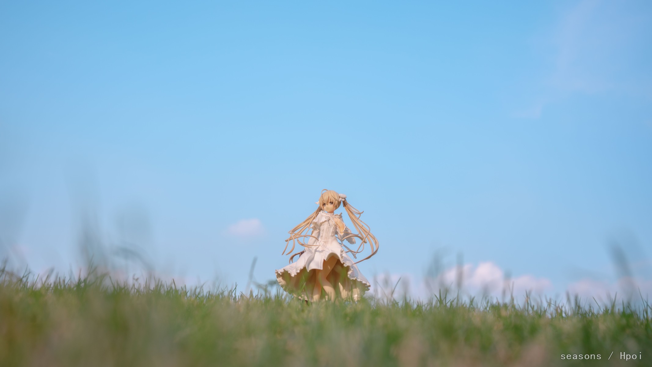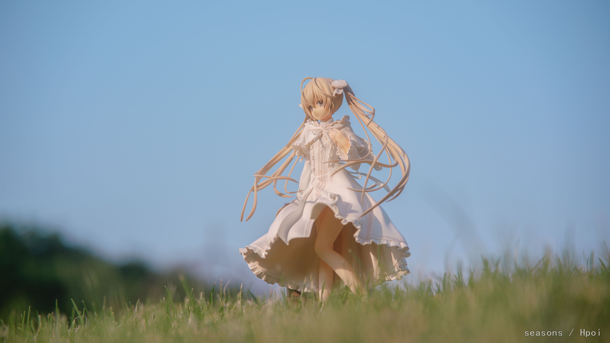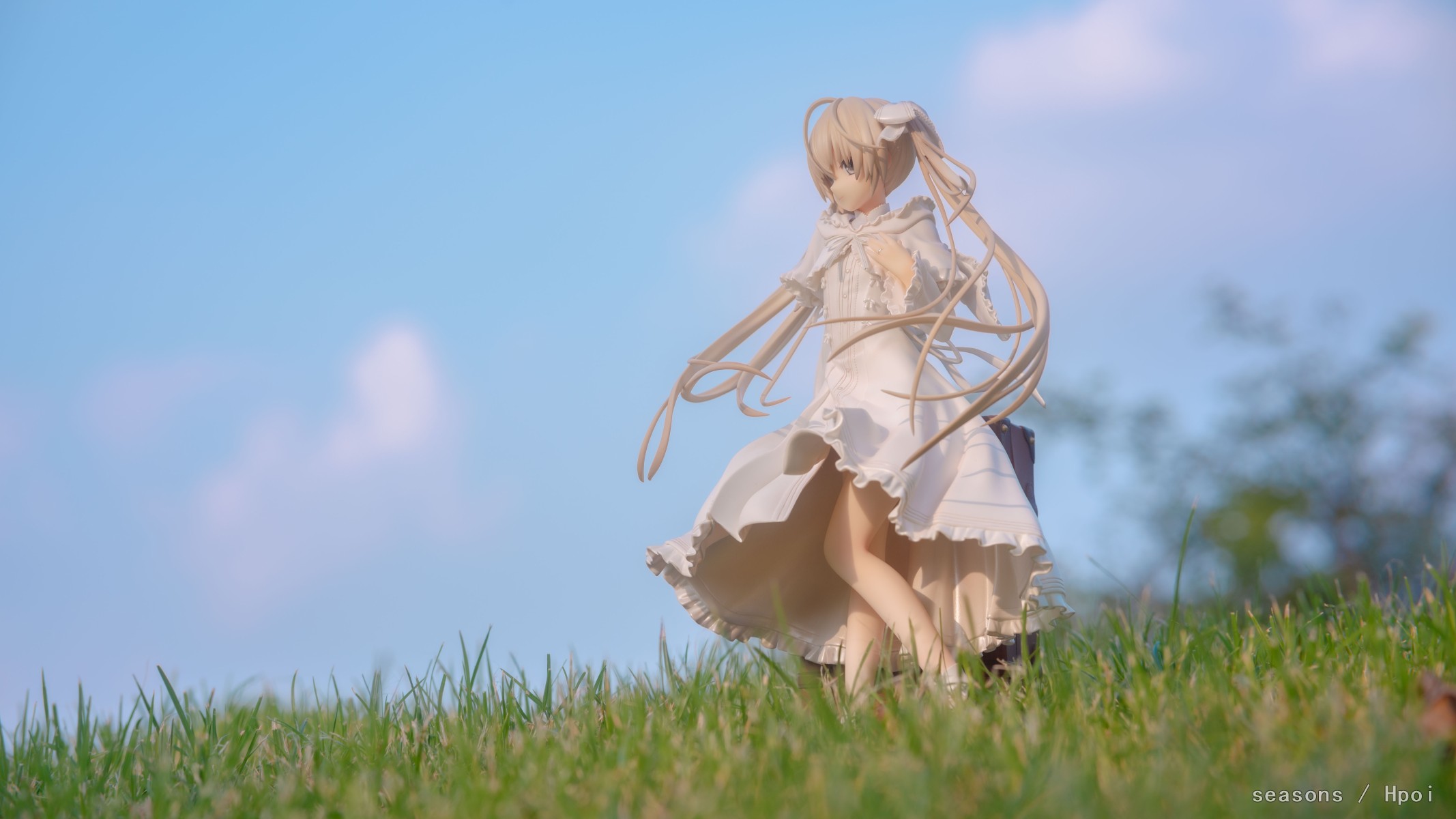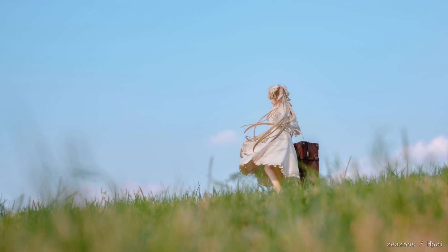 无论何时,无论何地,我们的上方都是那广阔的蓝色天空。我们为了守护自己最想守护的人努力、奋斗。在这亘古不变一直延续的天空下,我们的思念也会这样一直强烈地延伸下去。我们的心就像那天空一样,不分离。直至苍穹的尽头。」--缘之空 啊啊啊,穹妹好可爱呀。好喜欢,我也想要一个穹妹。 手上的戒指亮闪闪的,各种意义上。 在学校玫瑰园旁的小草坡上拍的,不知道算不算主题里。 主要参考了游戏《悠之空》里,穹和悠初到北欧时,在草原上等着的场景,选择了一个可以过滤背景草坡,学校里就这么一块合适的小草坪,傍晚时分的阳光也能很好的洒在这一片。学校还经常性的修剪草坪,还得等草长得差不多的时候抓紧好天气拍。