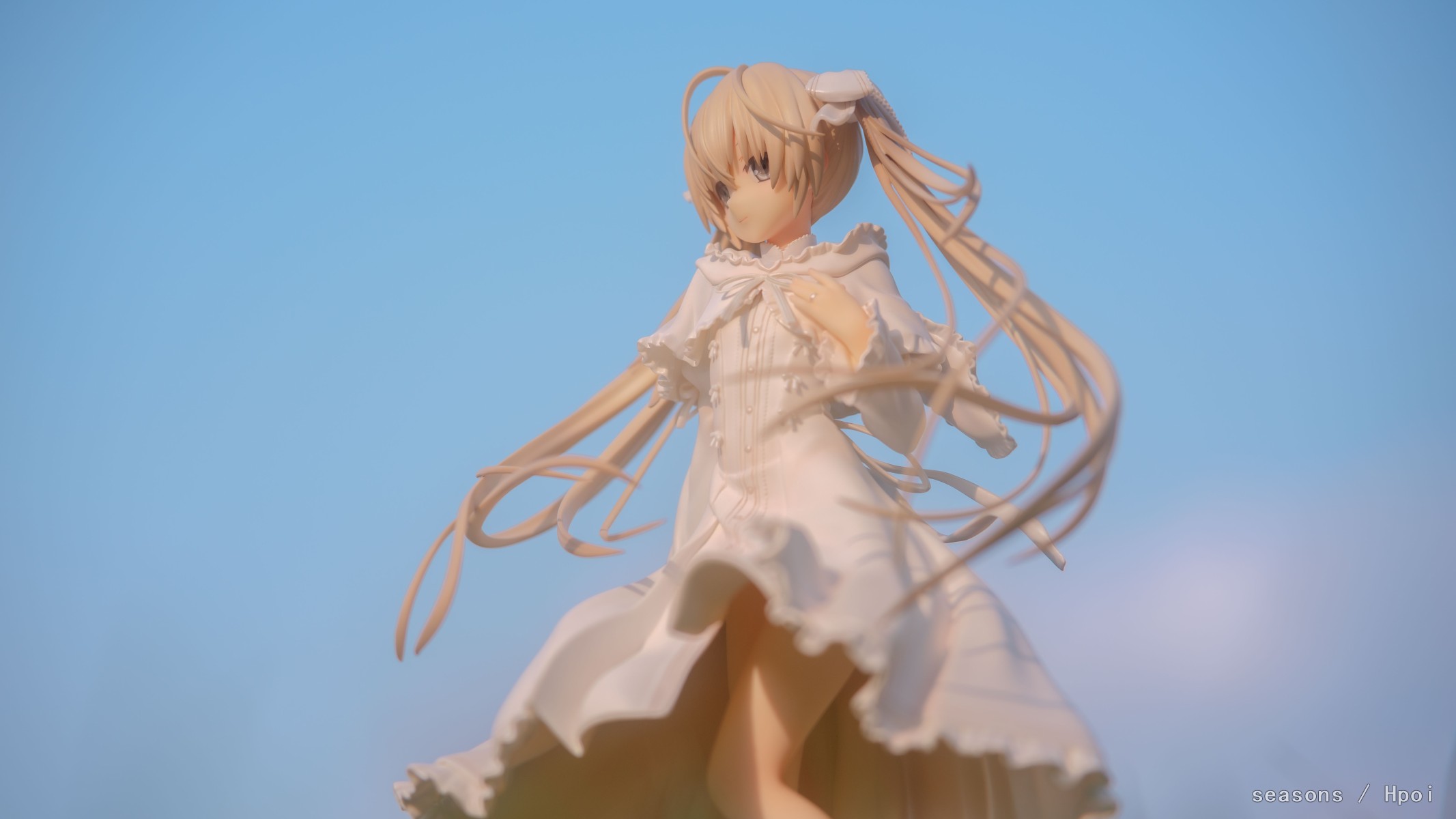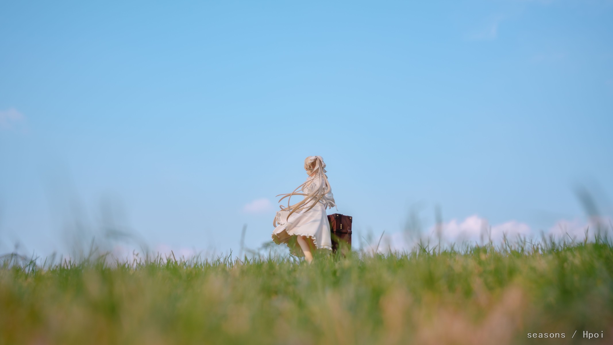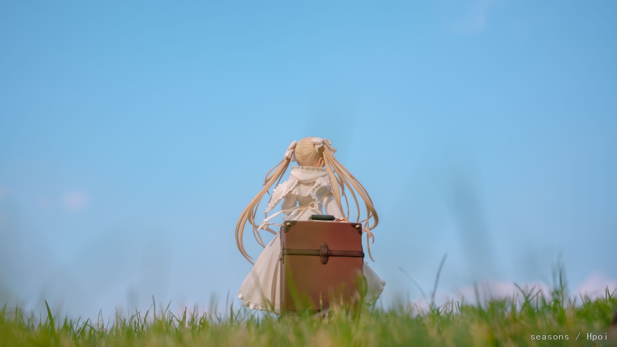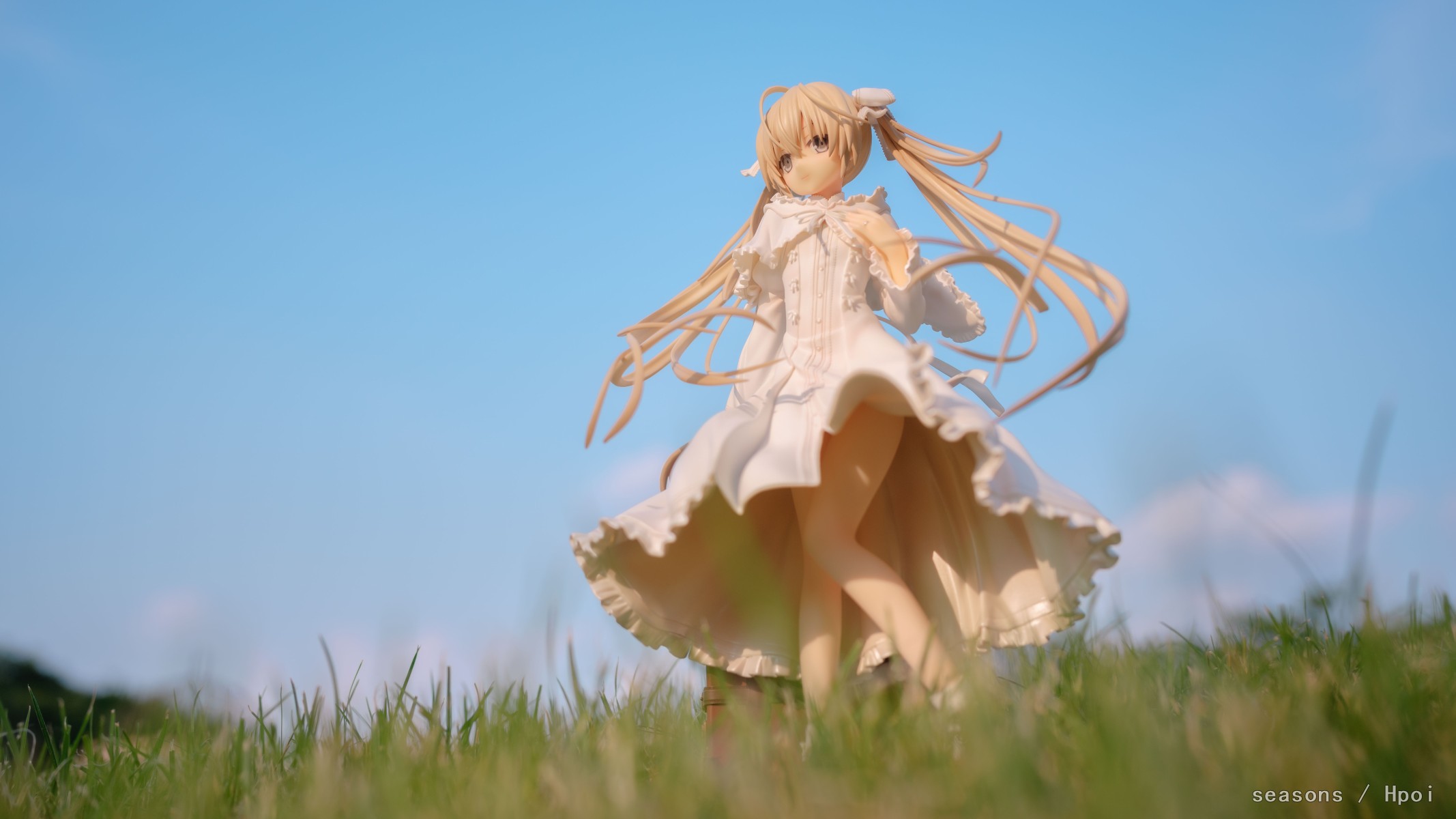 无论何时,无论何地,我们的上方都是那广阔的蓝色天空。我们为了守护自己最想守护的人努力、奋斗。在这亘古不变一直延续的天空下,我们的思念也会这样一直强烈地延伸下去。我们的心就像那天空一样,不分离。直至苍穹的尽头。」--缘之空 啊啊啊,穹妹好可爱呀。好喜欢,我也想要一个穹妹。 手上的戒指亮闪闪的,各种意义上。 在学校玫瑰园旁的小草坡上拍的,不知道算不算主题里。 主要参考了游戏《悠之空》里,穹和悠初到北欧时,在草原上等着的场景,选择了一个可以过滤背景草坡,学校里就这么一块合适的小草坪,傍晚时分的阳光也能很好的洒在这一片。学校还经常性的修剪草坪,还得等草长得差不多的时候抓紧好天气拍。