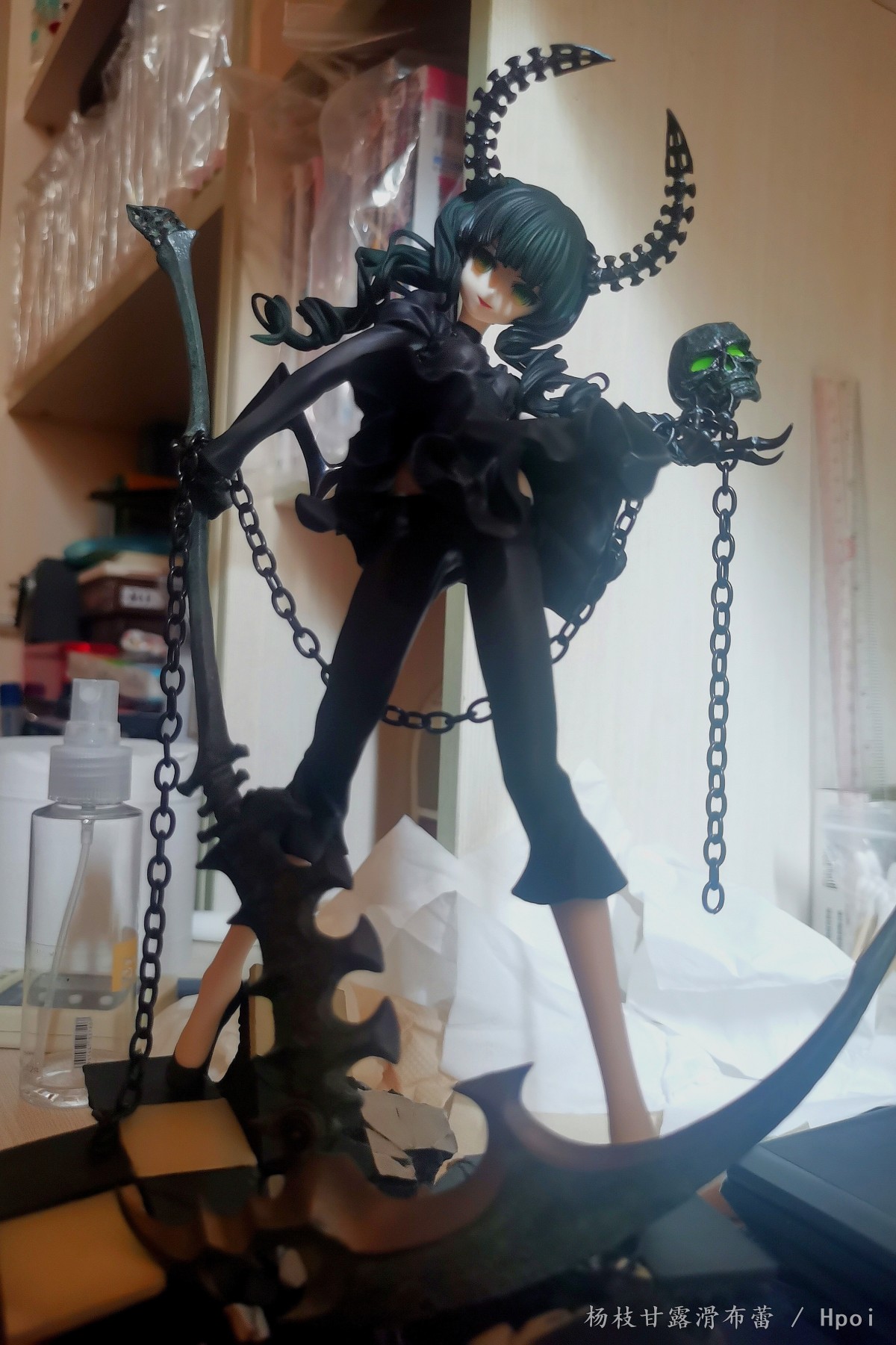 因为年代久远和设计原因,脚桩还断了一个......真是历经磨难。好在其他地方都很优秀,多褶裙、大镰刀、手中的OO、自由搭配的铁链、Dark♂翅膀、骨感身材(XP原来这时候就养成了吗?)同完美还原huke原画的面相及耐雕琢的造型还有黑岩那经典的格子地台。