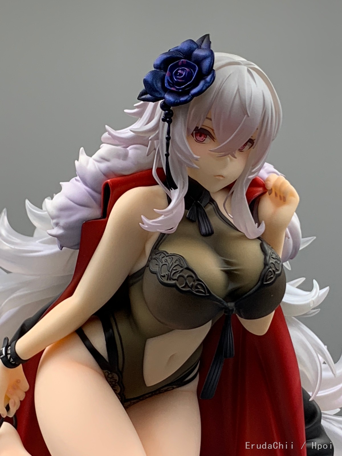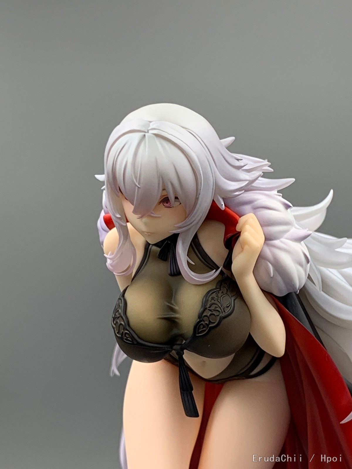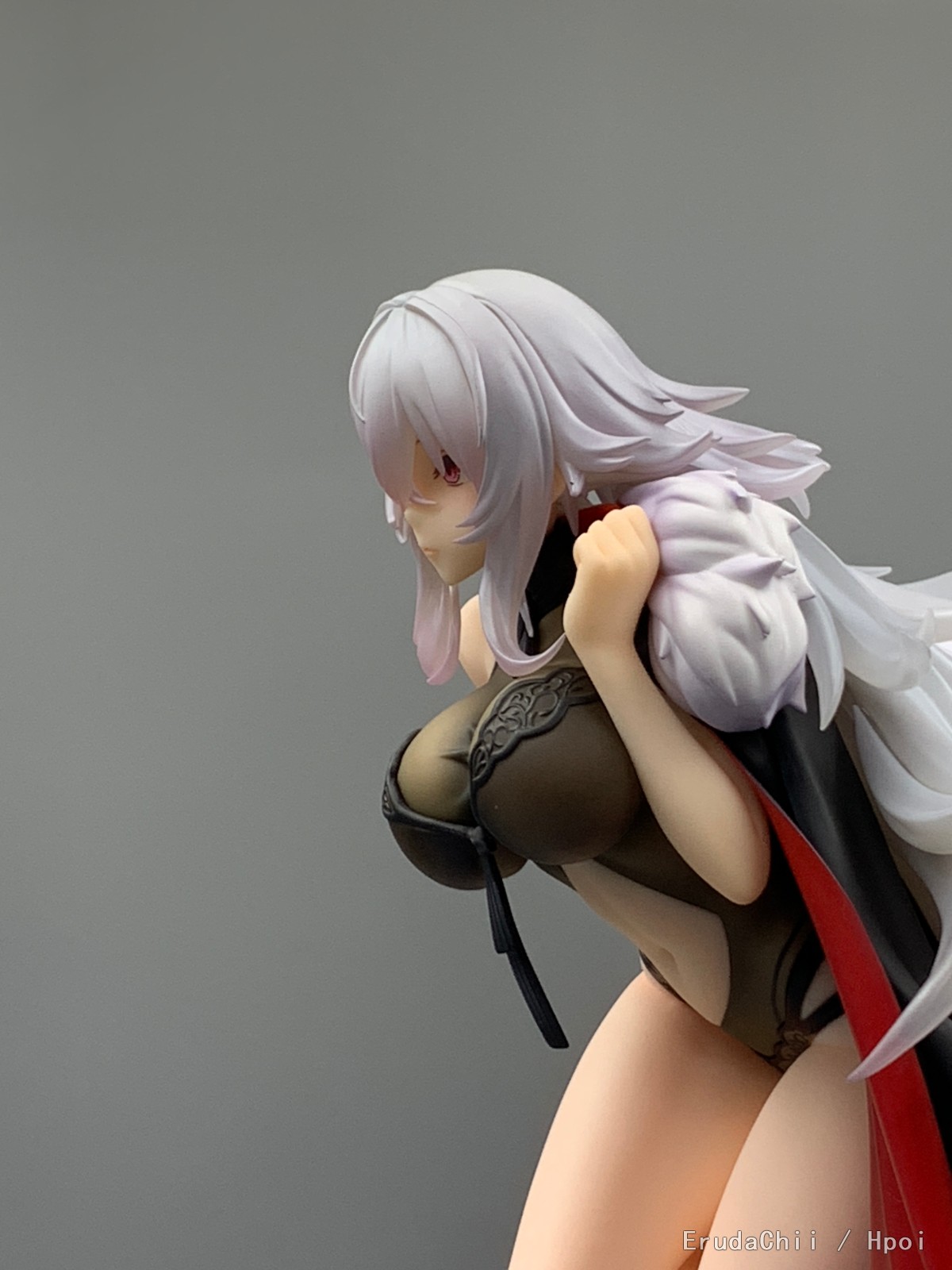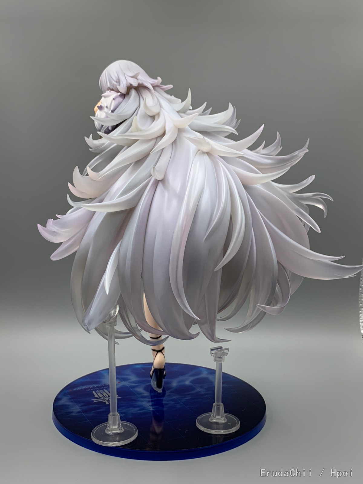 这款只有左腿一个支撑,头发又很重,所以配了两个支架,大的那个勉强能撑住一端头发,另一个小的就比较搞笑了,短了一截,撑了个寂寞…… 很担心摆久了断腿……