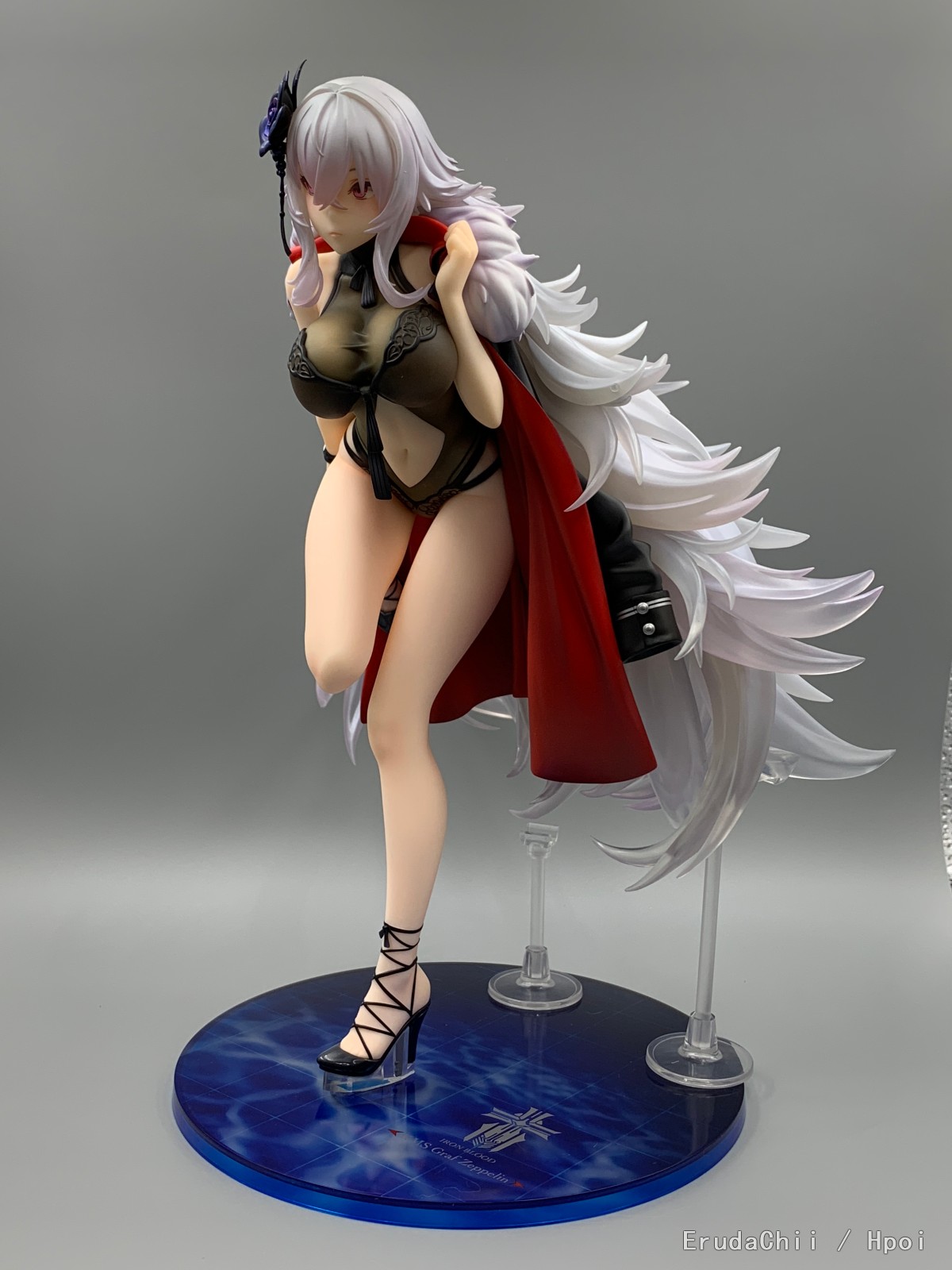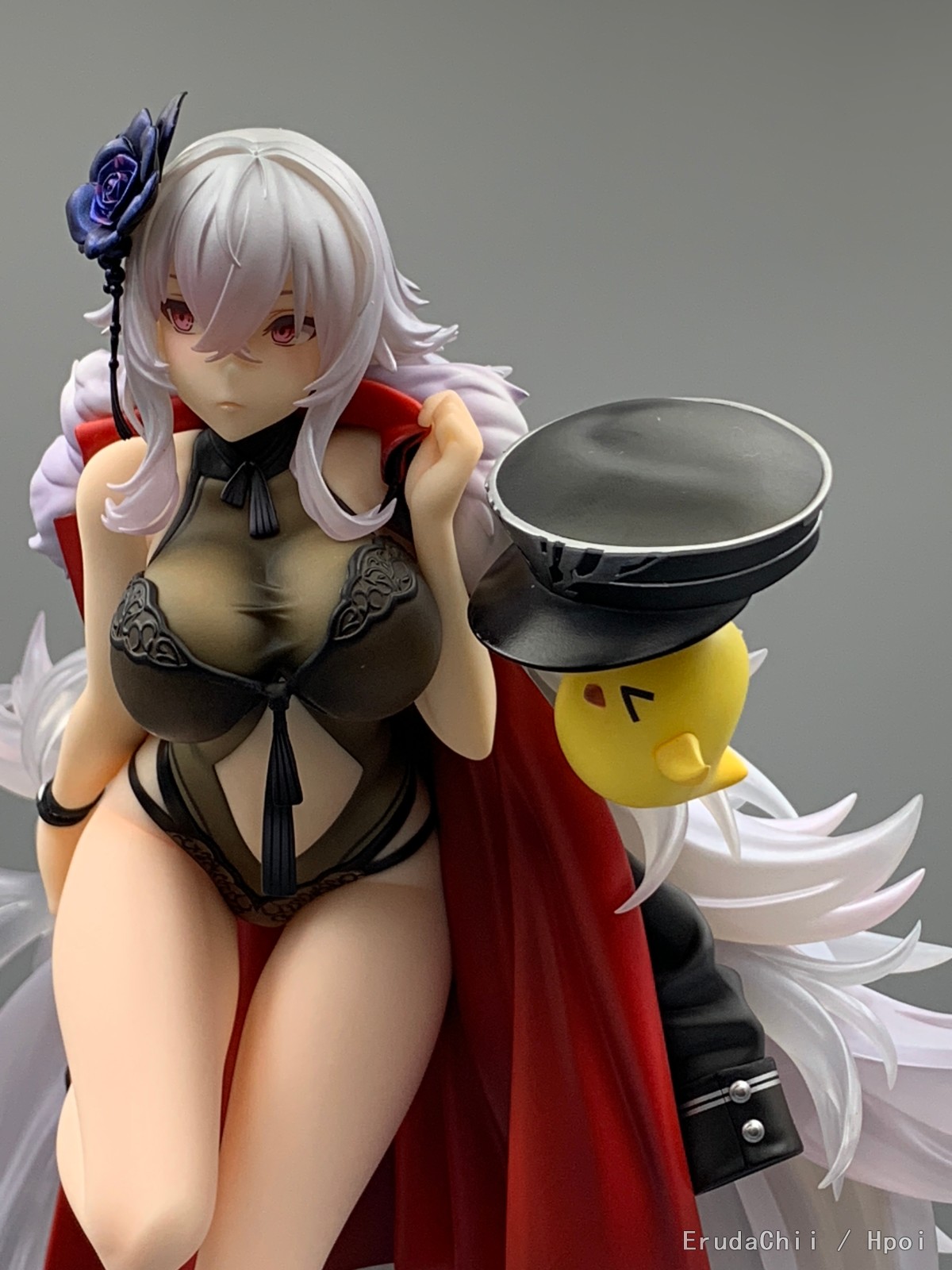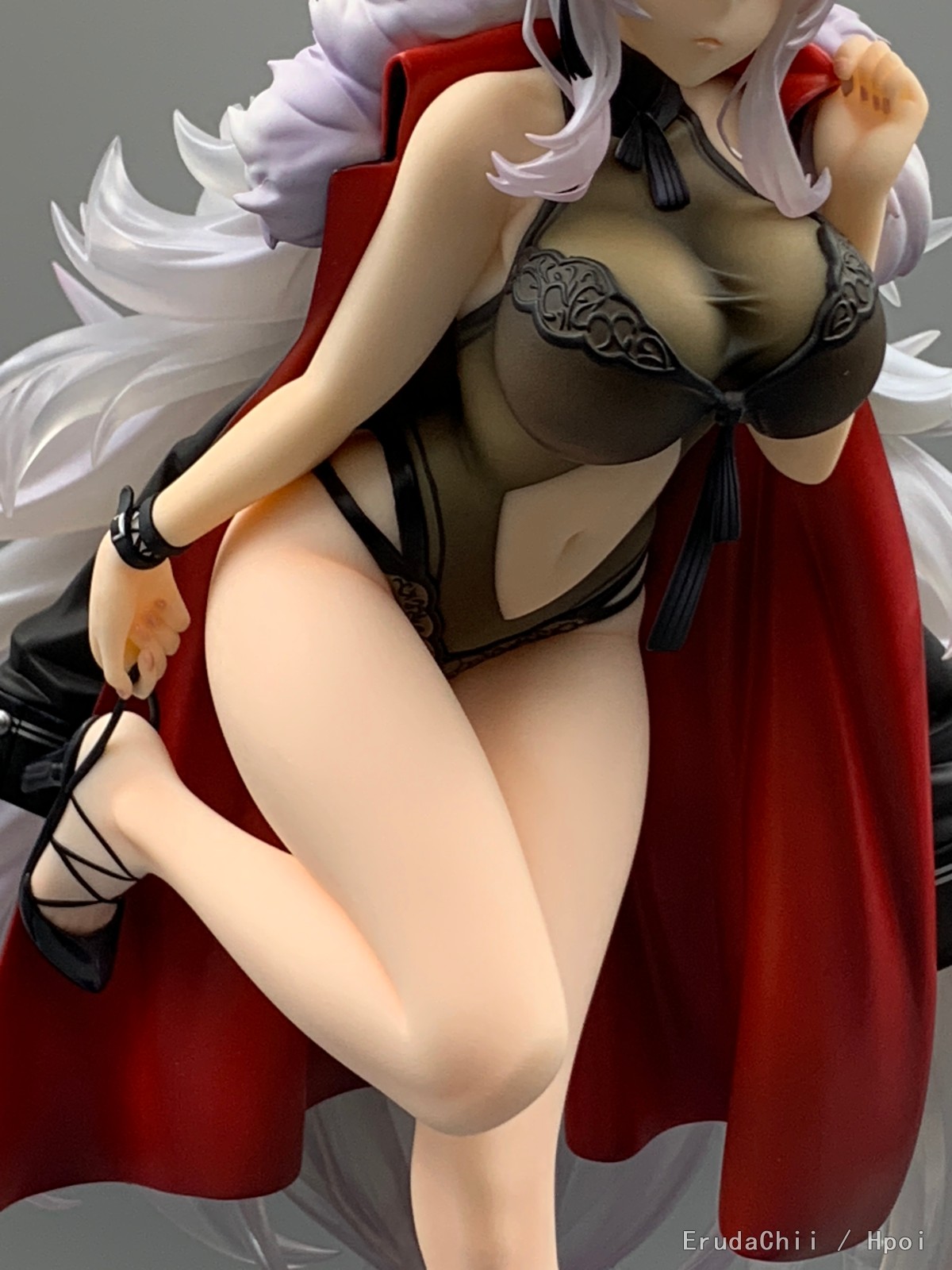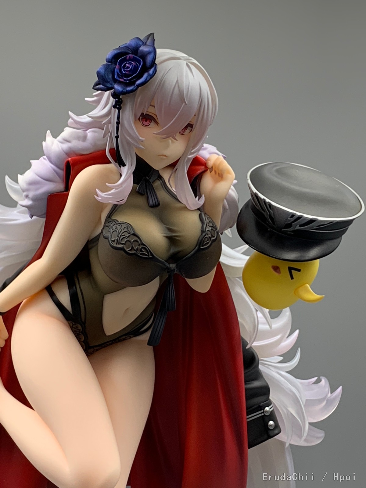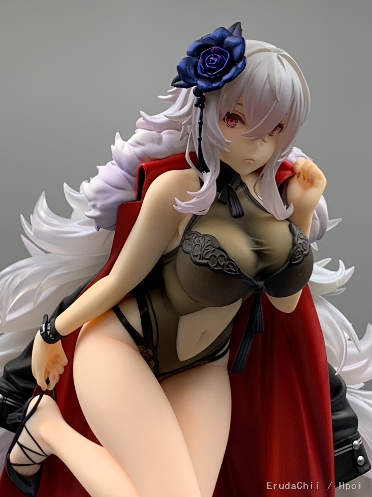 这款只有左腿一个支撑,头发又很重,所以配了两个支架,大的那个勉强能撑住一端头发,另一个小的就比较搞笑了,短了一截,撑了个寂寞…… 很担心摆久了断腿……