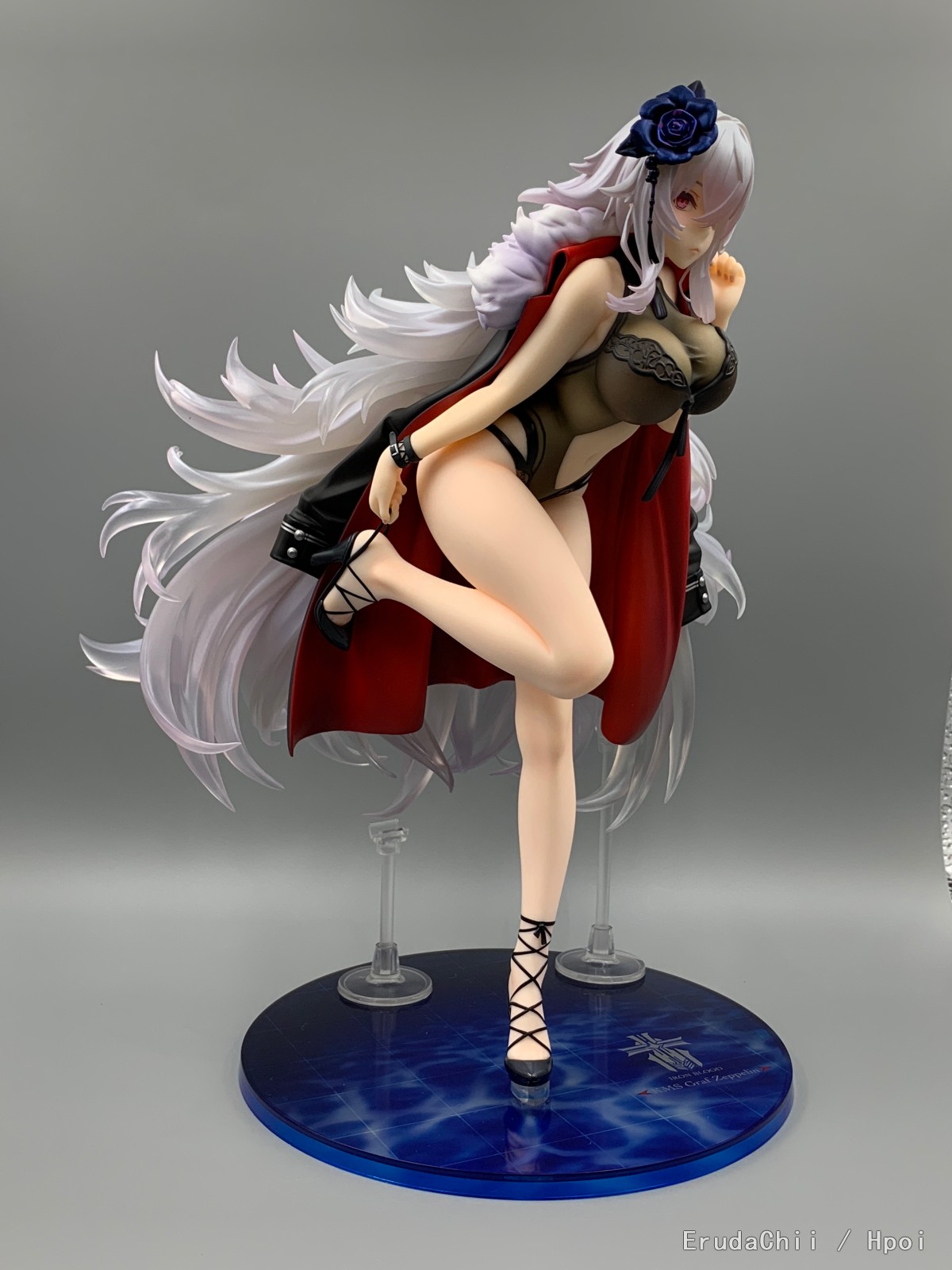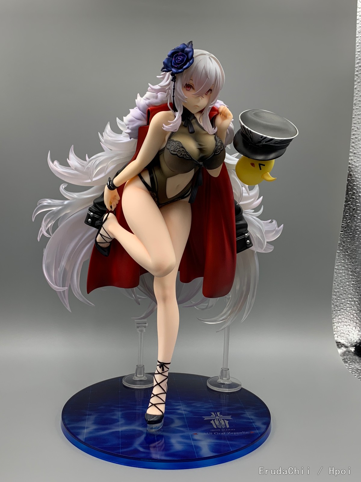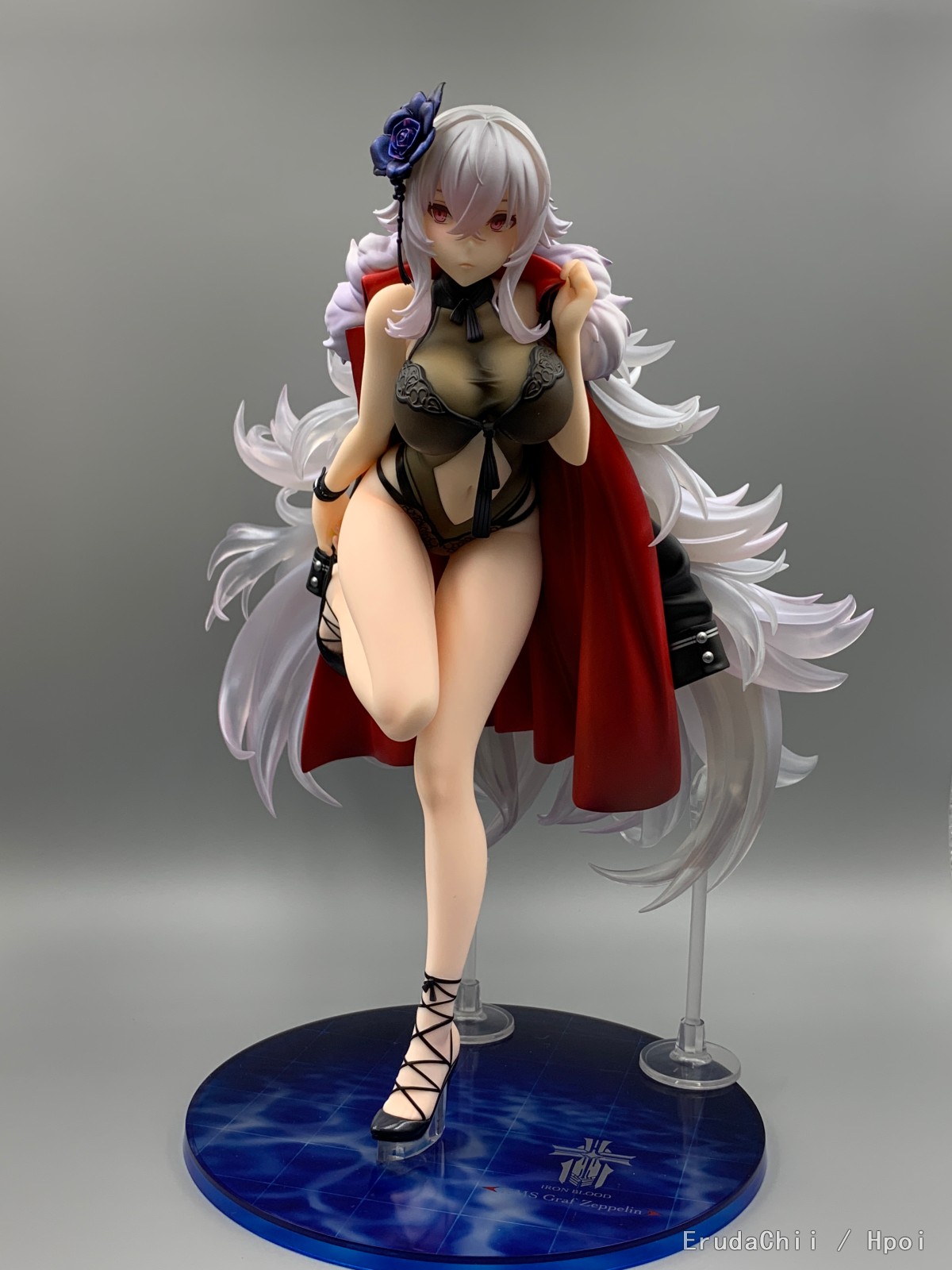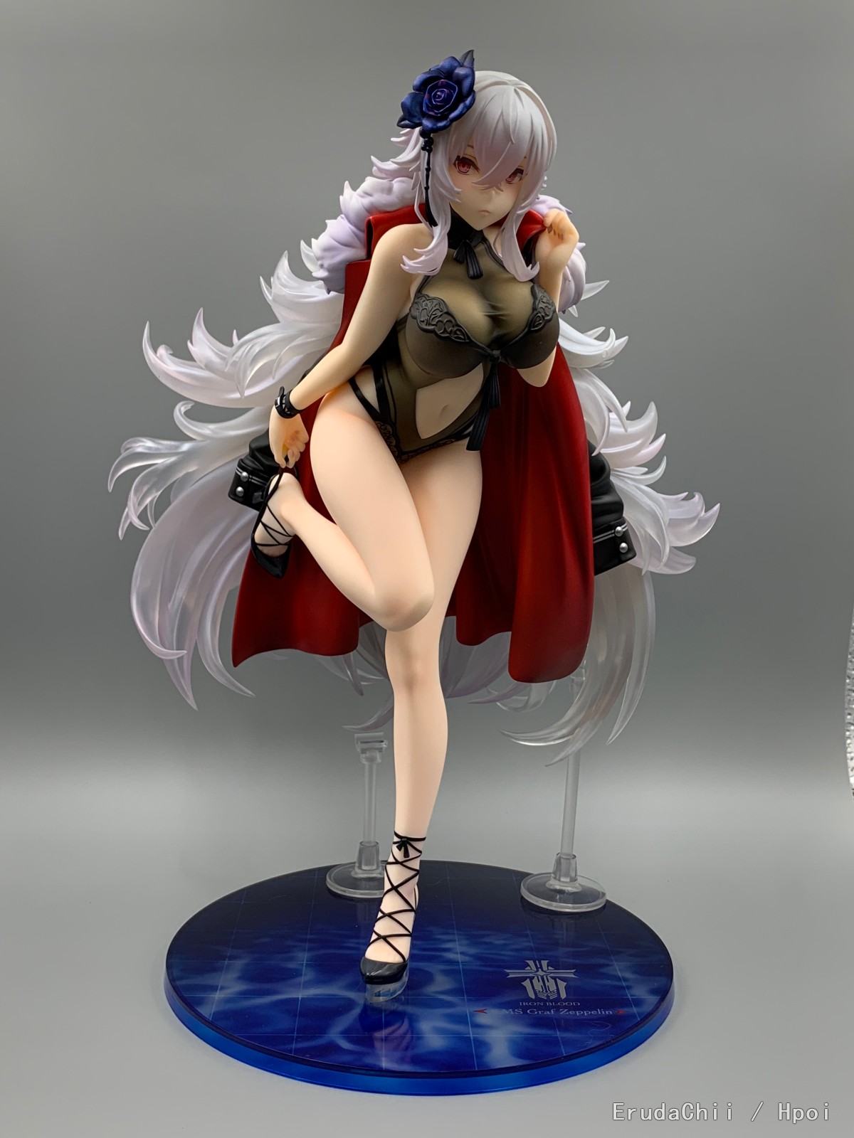 这款只有左腿一个支撑,头发又很重,所以配了两个支架,大的那个勉强能撑住一端头发,另一个小的就比较搞笑了,短了一截,撑了个寂寞…… 很担心摆久了断腿……