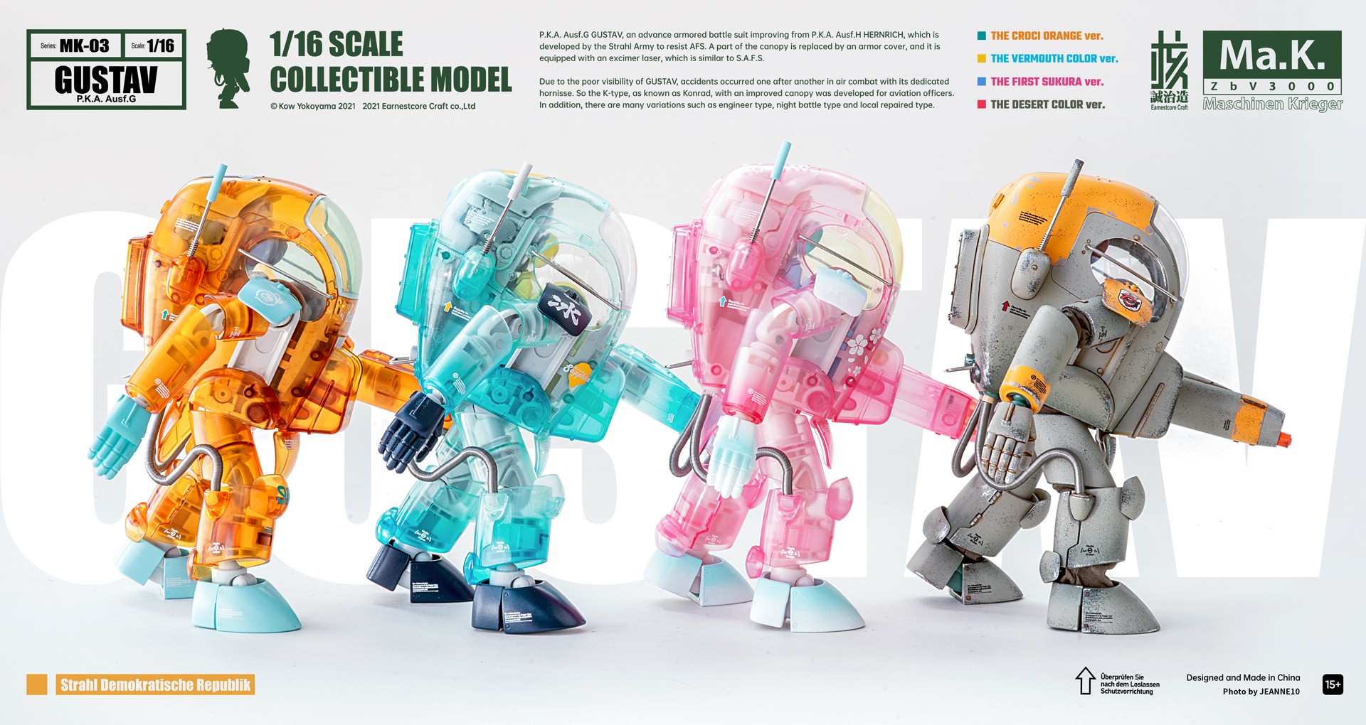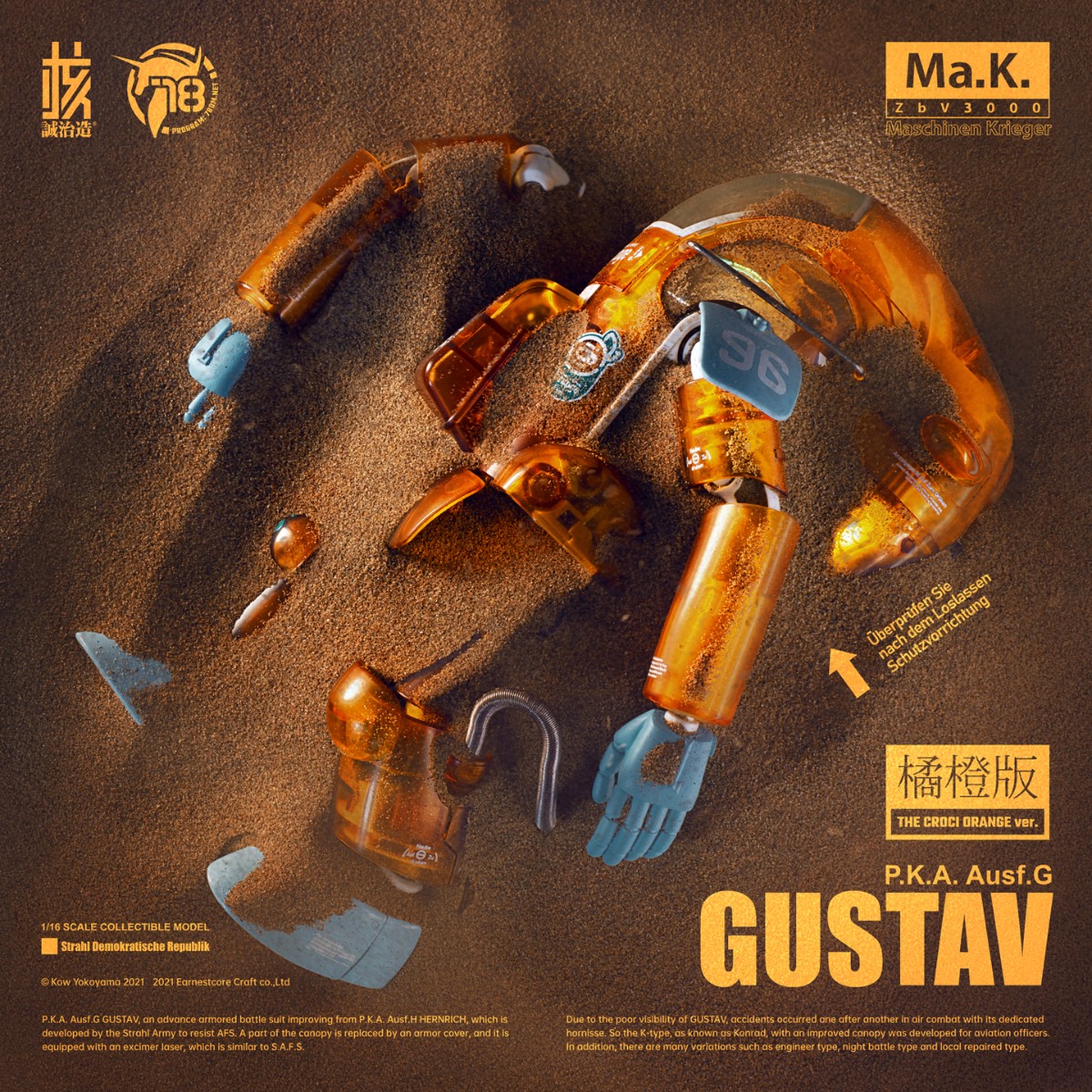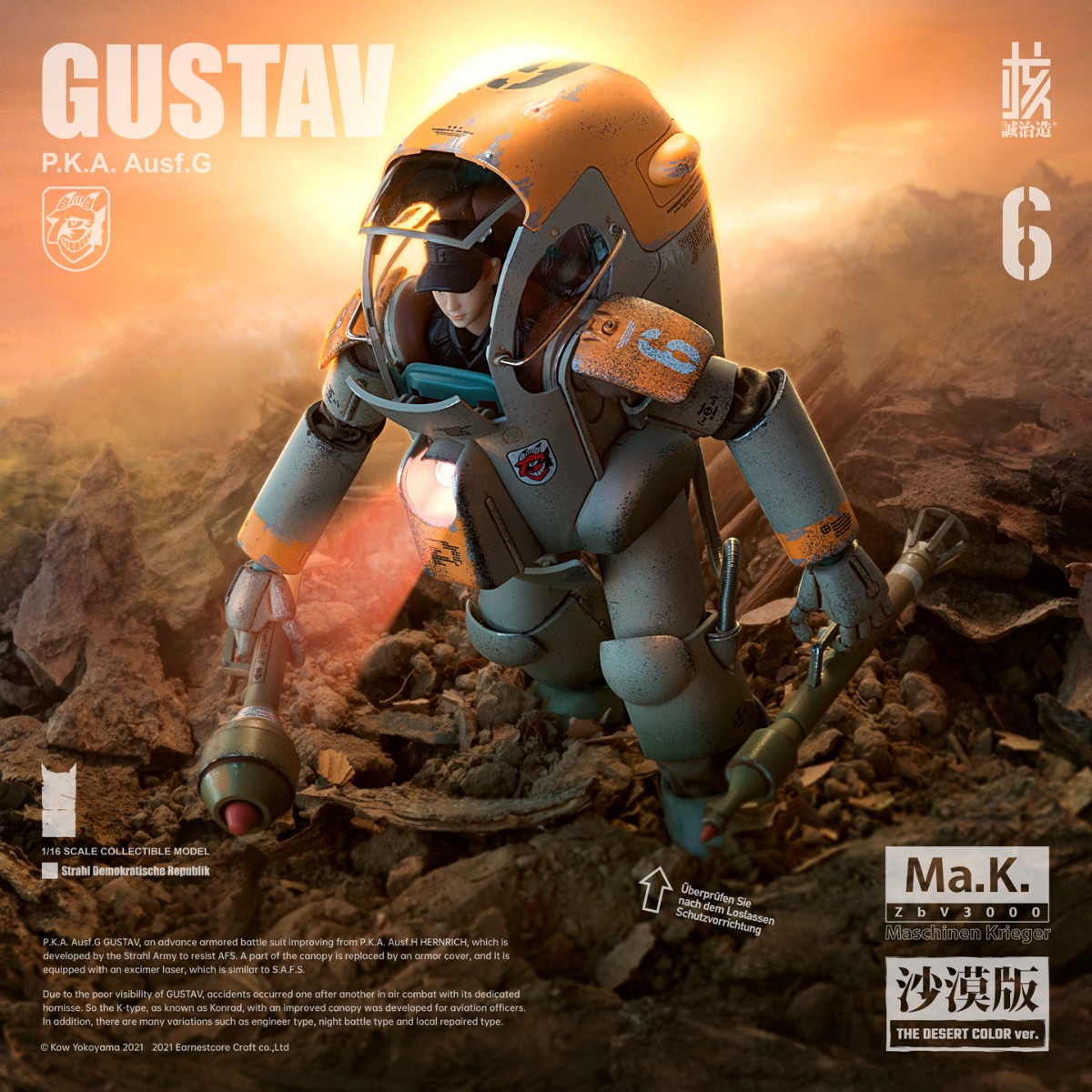 核诚治造 x 横山宏 Ma.K. 古斯塔夫 Ma.K. ZbV3000 GUSTAV P.K.A. Ausf.G 本系列以精巧的涂装完成品和清新的配色构筑「Ma.K.」的魅力、和可玩的机械性能。 外观以苏托尔军队的P.K.A.系的“古斯塔夫”为原点呈现。 系列通用的1/16比例,分量感十足的大尺寸。各部位关节可动、呈现更多姿势。 原设沙漠配色的关节采用密封布料,获取更高的观赏价值。 除了再现精密的细节之外,腹部的传感器还装备有LED发光装置。 不仅头部驾驶舱可以打开,还再次呈现舱口开启机构和内部细节。 通过多种透明材料的使用,可从外观观看到内部组合的造型效果。 左臂装备通常配置的激光装备外,还附带了可替换的机械手造型零件,内容十分丰富。