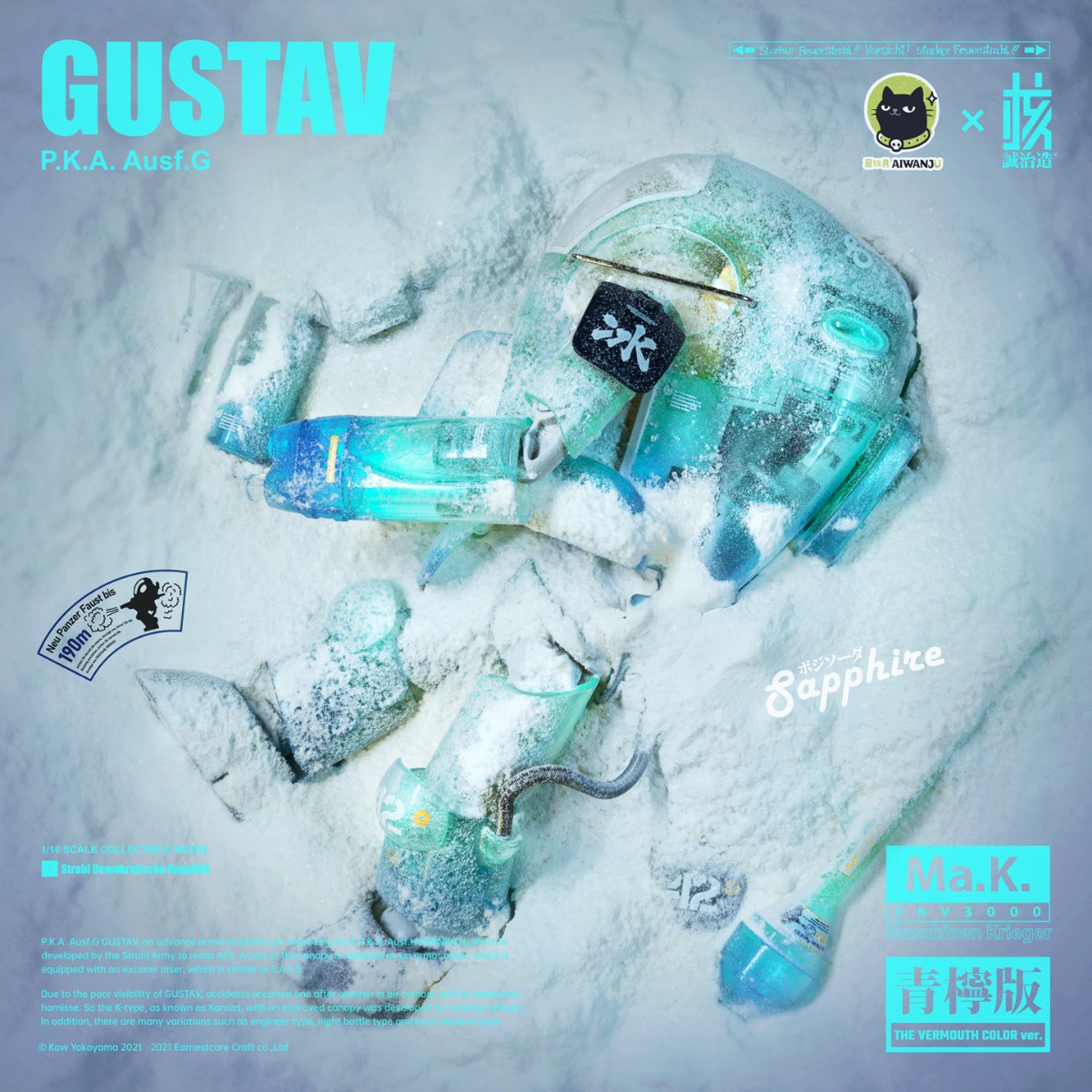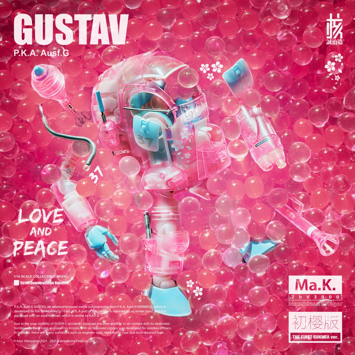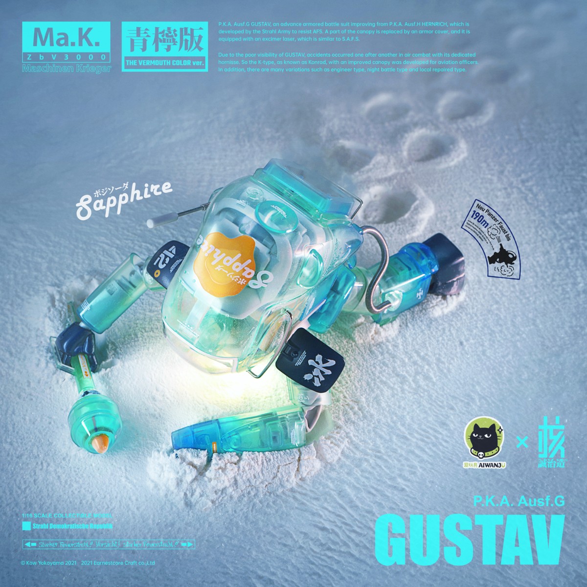 核诚治造 x 横山宏 Ma.K. 古斯塔夫 Ma.K. ZbV3000 GUSTAV P.K.A. Ausf.G 本系列以精巧的涂装完成品和清新的配色构筑「Ma.K.」的魅力、和可玩的机械性能。 外观以苏托尔军队的P.K.A.系的“古斯塔夫”为原点呈现。 系列通用的1/16比例,分量感十足的大尺寸。各部位关节可动、呈现更多姿势。 原设沙漠配色的关节采用密封布料,获取更高的观赏价值。 除了再现精密的细节之外,腹部的传感器还装备有LED发光装置。 不仅头部驾驶舱可以打开,还再次呈现舱口开启机构和内部细节。 通过多种透明材料的使用,可从外观观看到内部组合的造型效果。 左臂装备通常配置的激光装备外,还附带了可替换的机械手造型零件,内容十分丰富。
