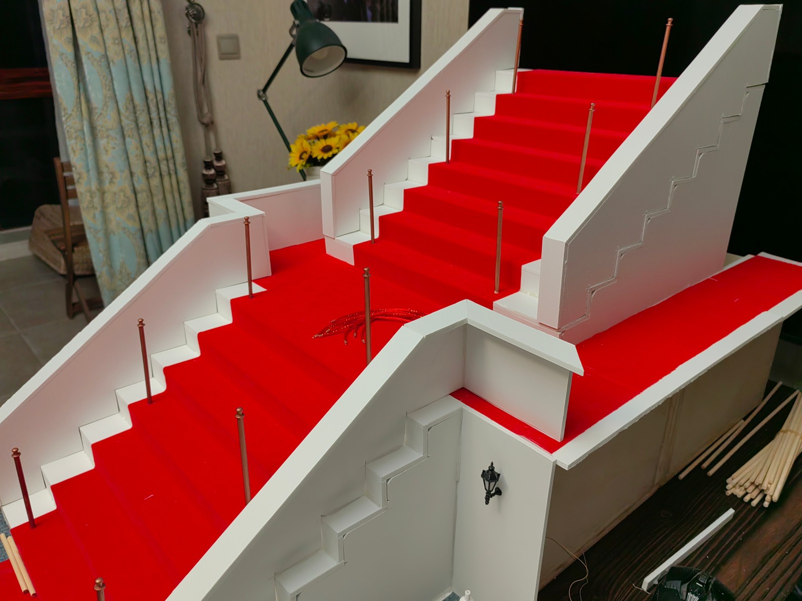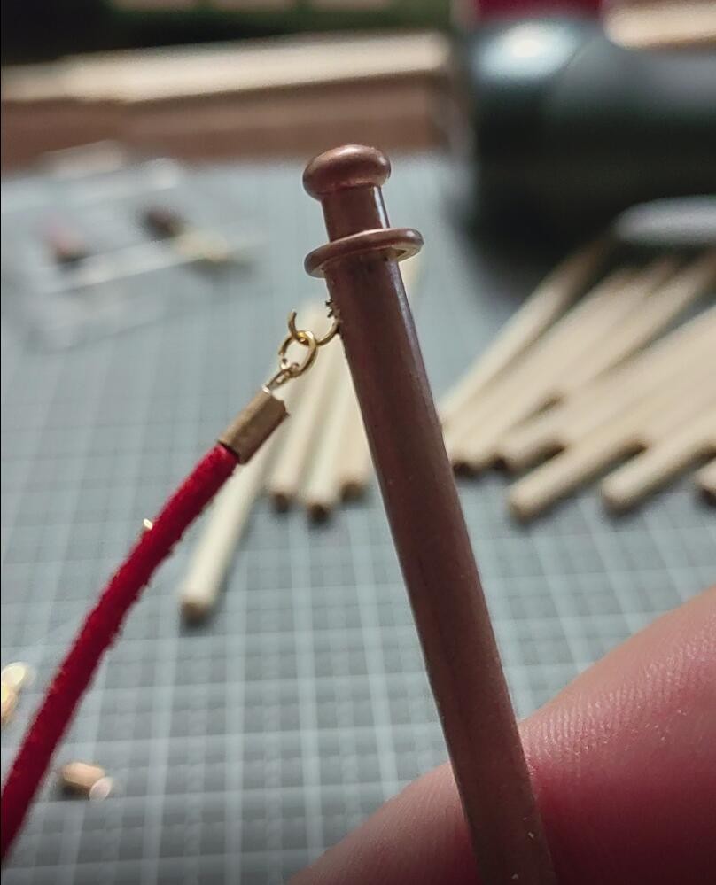 然后制作栏杆,简化处理,木棒加金属头喷紫铜漆,两侧打孔,金属环弯成钩子插入孔中,红绳两端固定端子和金属环,挂在立柱钩子上,就可以当做是栏杆,这部分咨询和参考了@mzy001老师的部分操作: