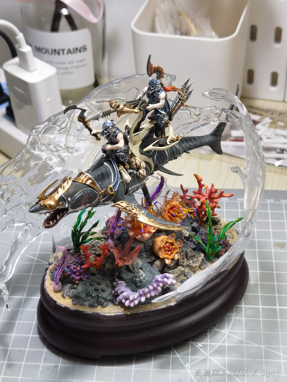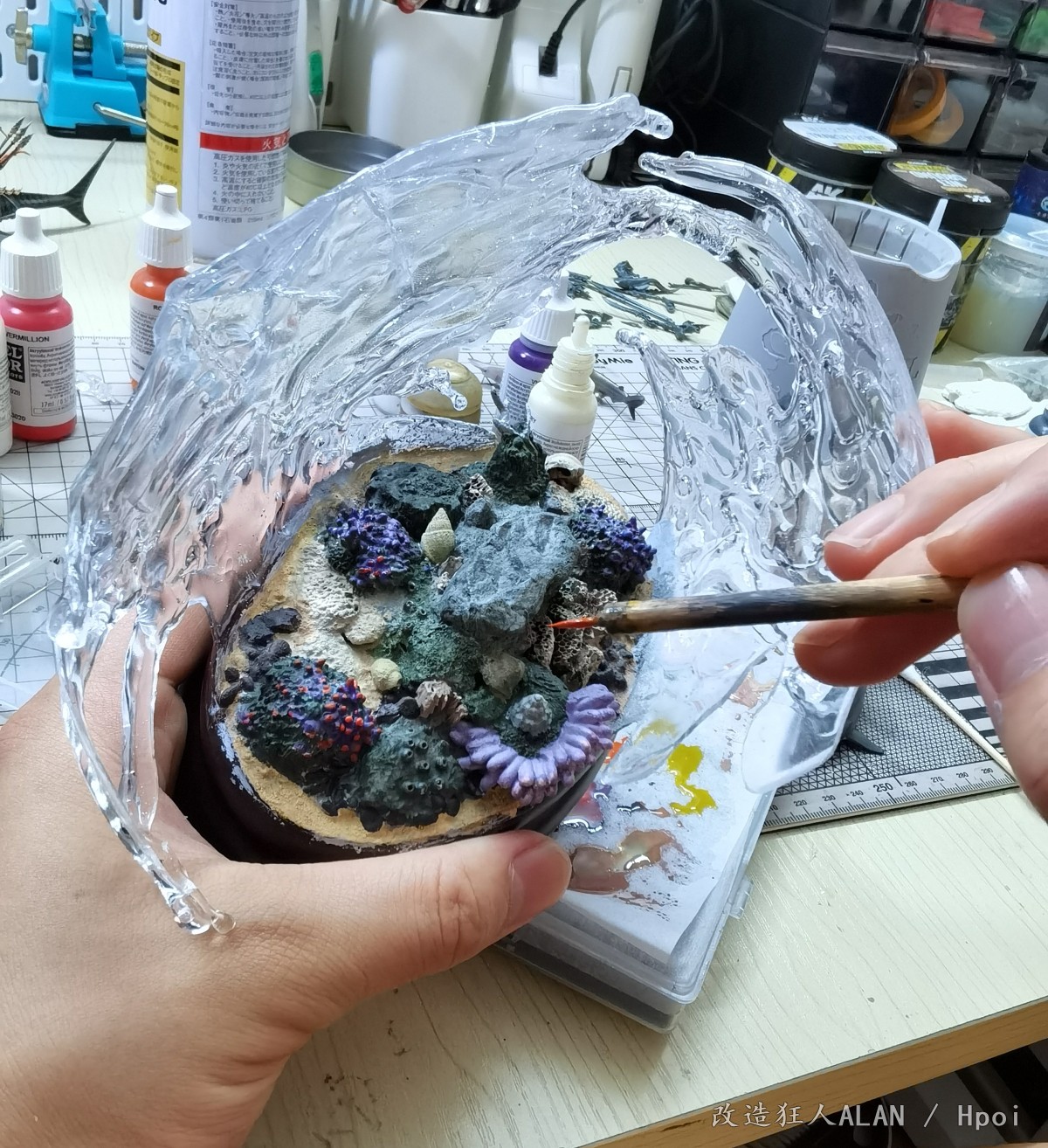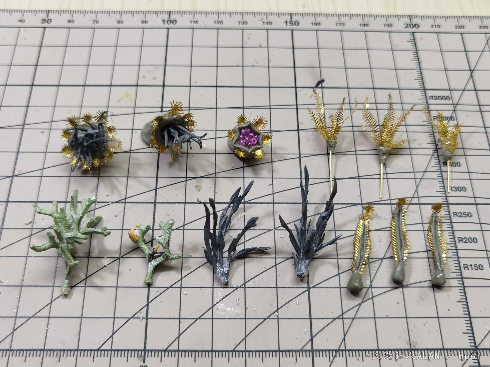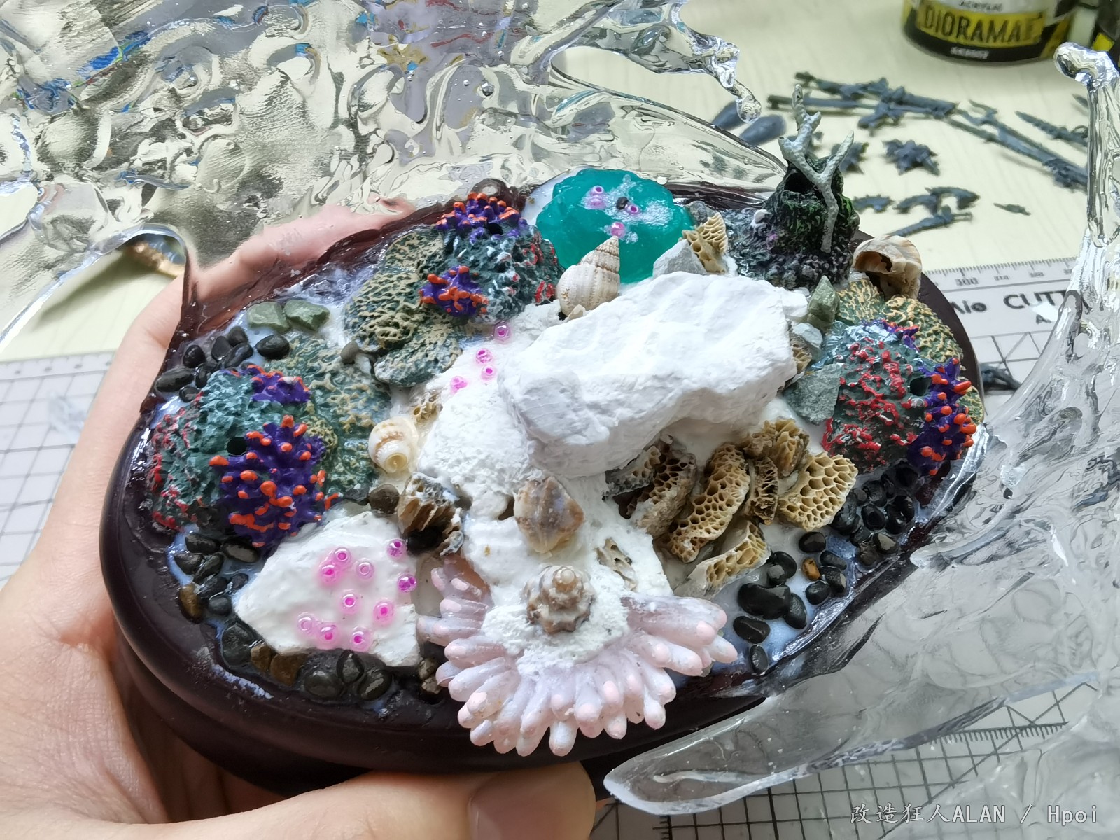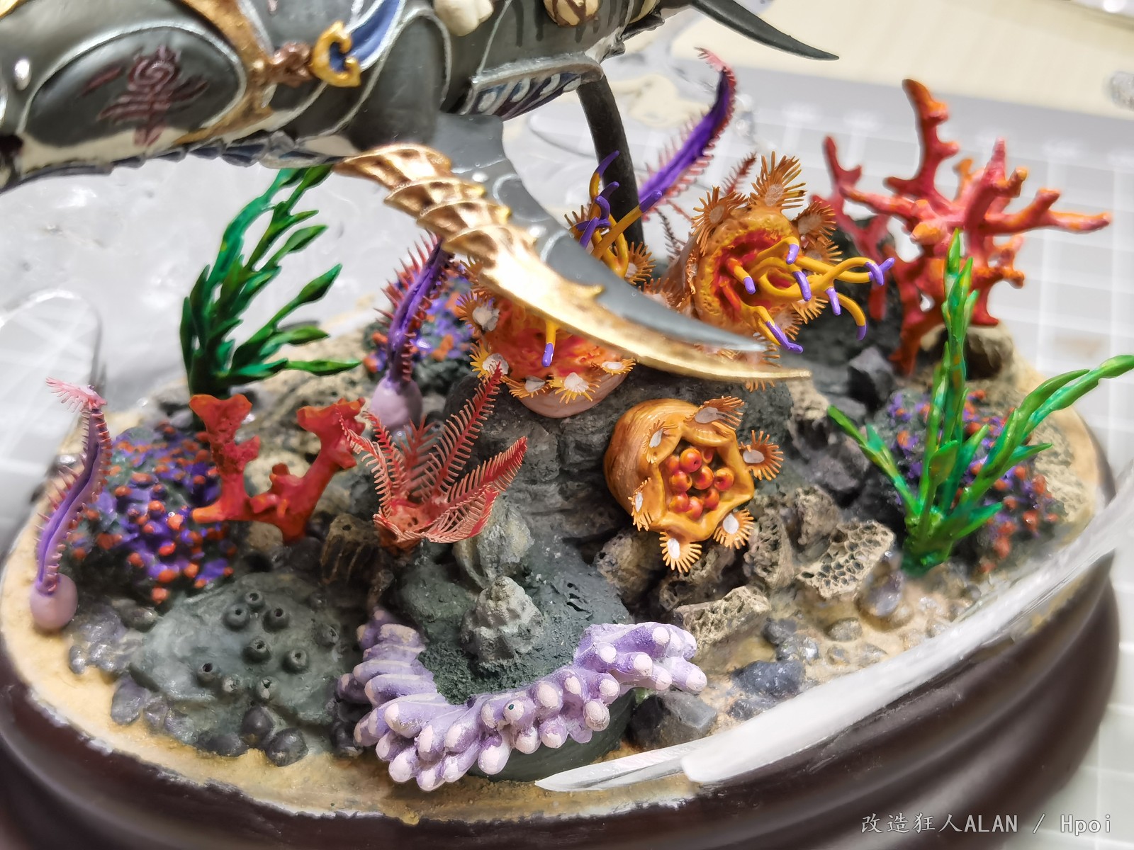 刚才和一心描绘海的颜色大佬聊起了水景的制作体验,遇到同好非常高兴,就在这里和大家分享一下《破浪》这个场景的一些制作过程~海底的地形用的是各种海洋生物扭蛋的地台,小石子,石膏块,小贝壳和藤壶壳拼凑而成,上面的植物和软体动物有的是直接沿用扭蛋地台上的零件(例如珊瑚),有的是用海鲜市场低价淘回来的战锤废件(例如海草就是用aos里树人的零件),还有的如海葵,海腮之类则是用AB补土和蚀刻片自制~