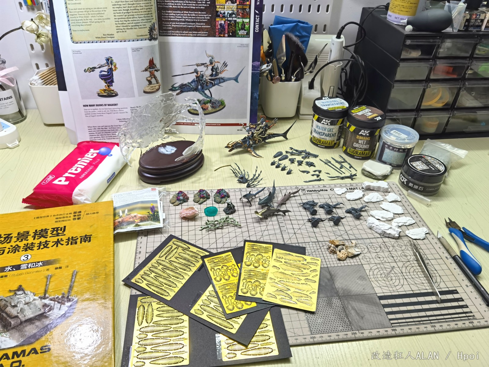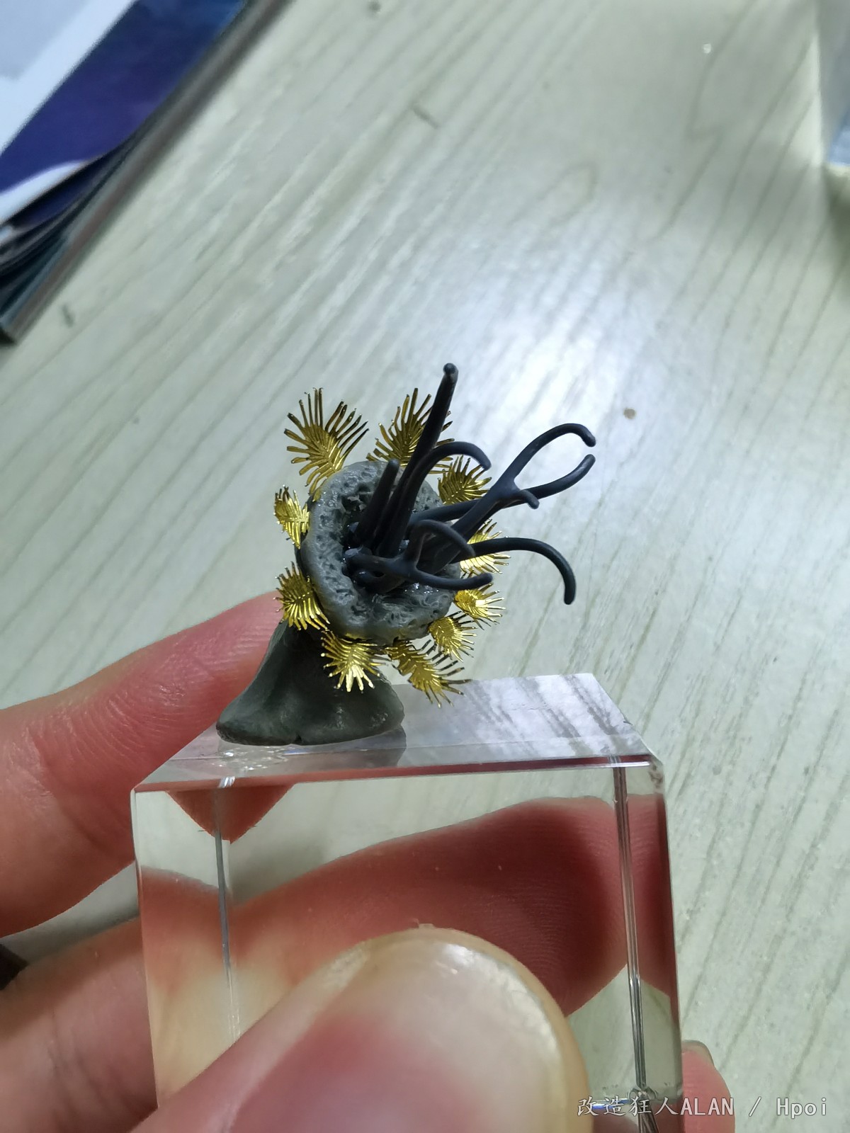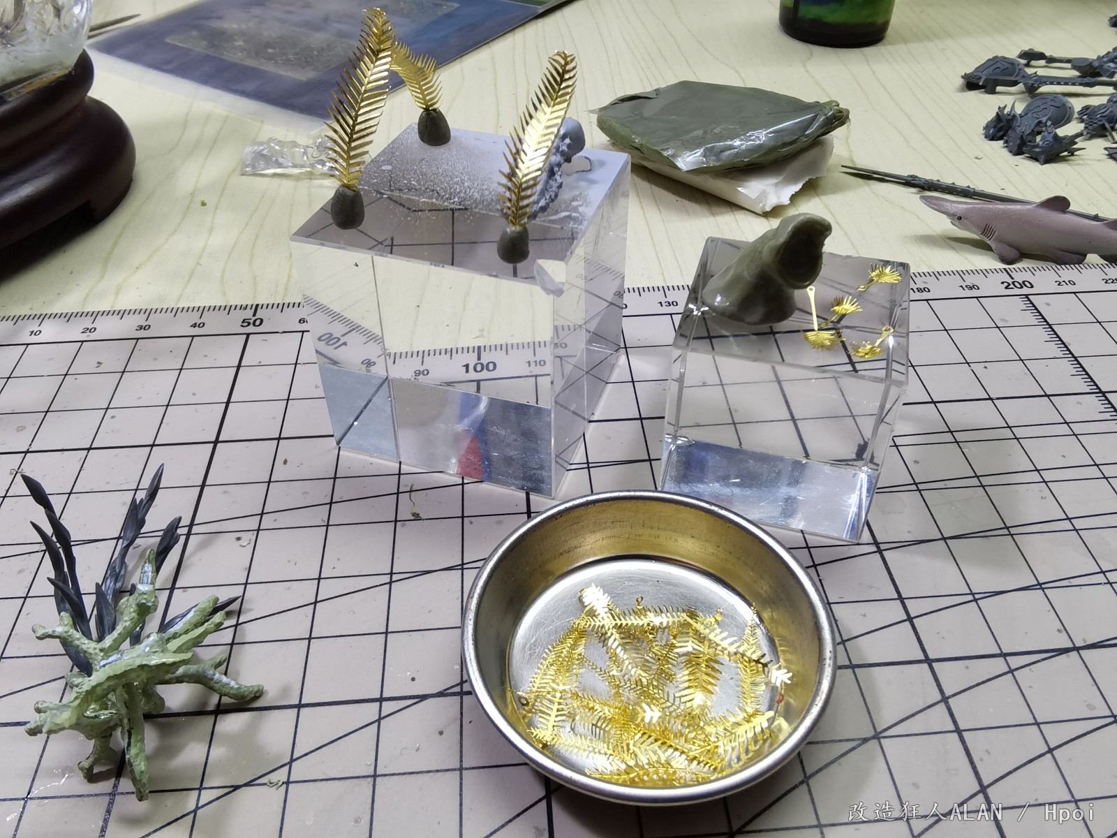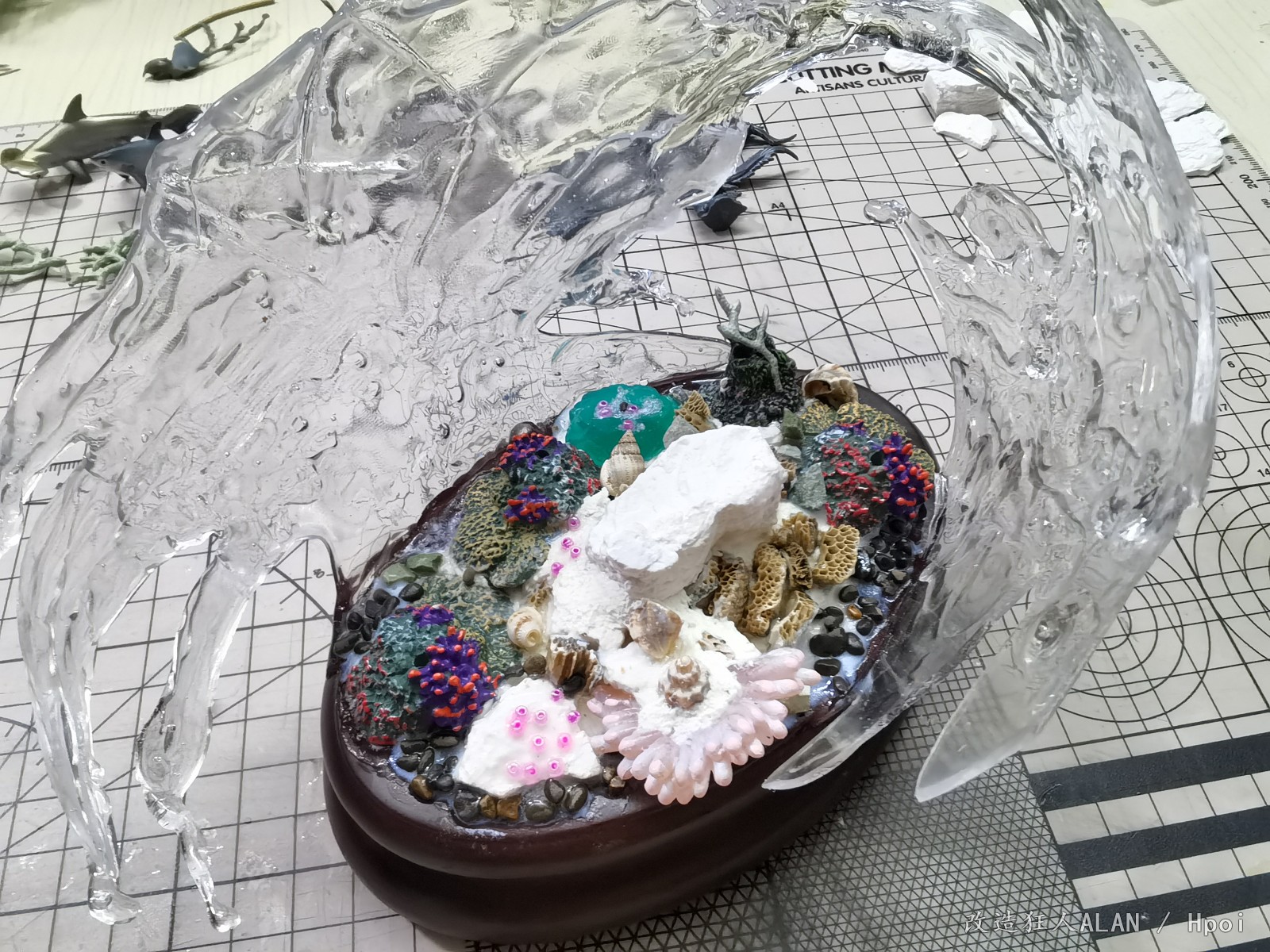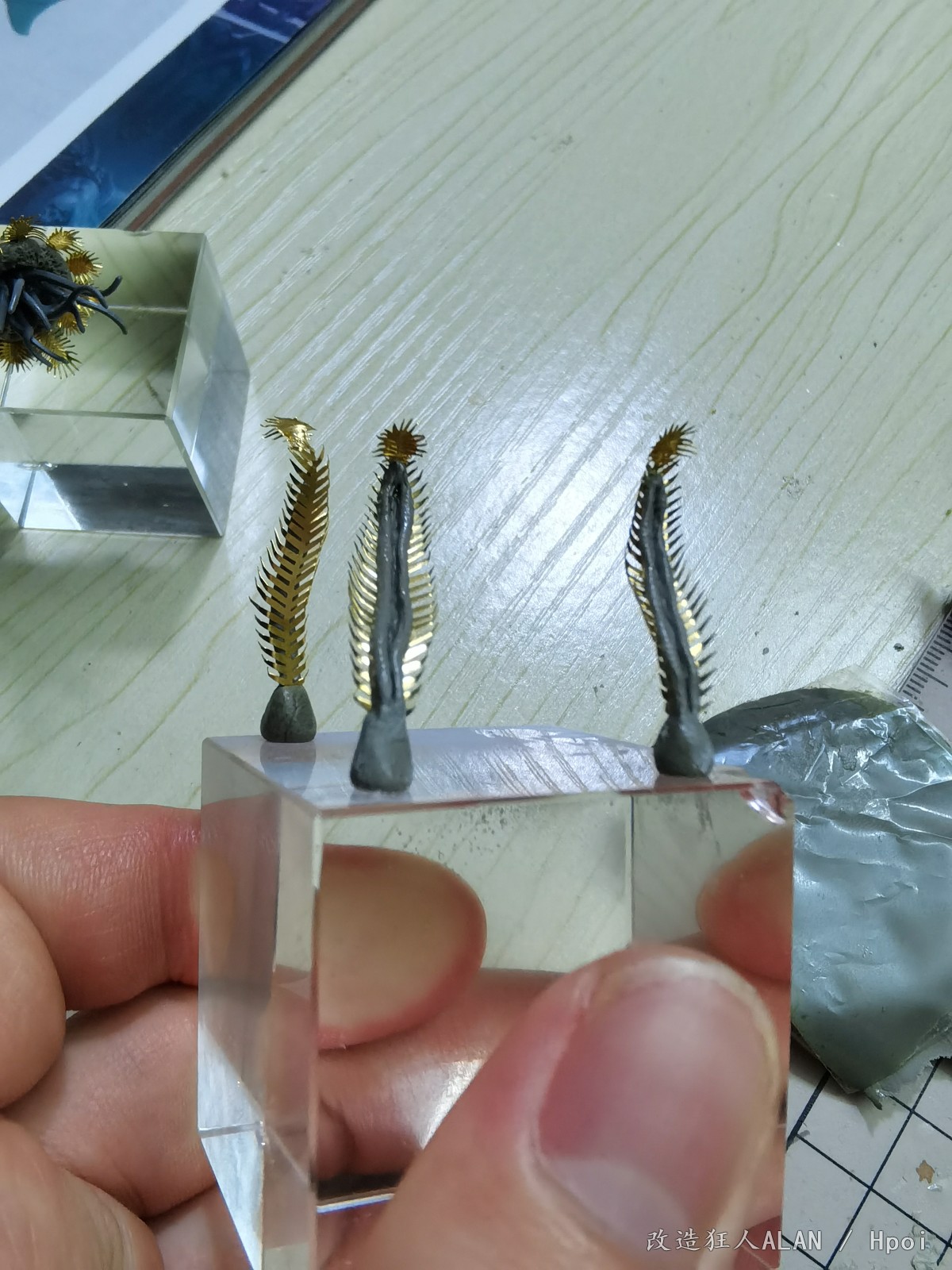 刚才和一心描绘海的颜色大佬聊起了水景的制作体验,遇到同好非常高兴,就在这里和大家分享一下《破浪》这个场景的一些制作过程~海底的地形用的是各种海洋生物扭蛋的地台,小石子,石膏块,小贝壳和藤壶壳拼凑而成,上面的植物和软体动物有的是直接沿用扭蛋地台上的零件(例如珊瑚),有的是用海鲜市场低价淘回来的战锤废件(例如海草就是用aos里树人的零件),还有的如海葵,海腮之类则是用AB补土和蚀刻片自制~