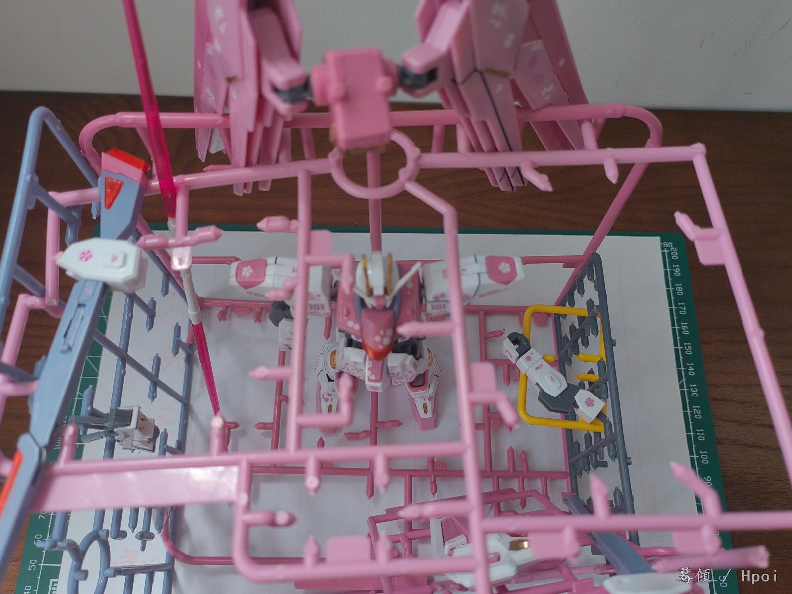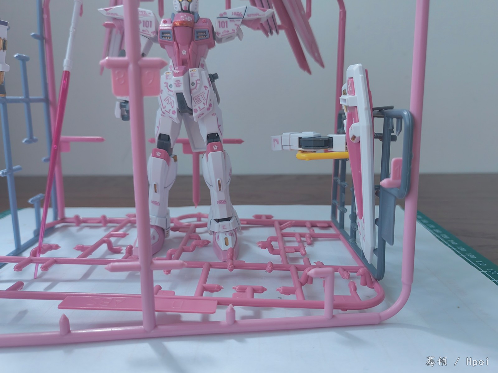 黄色的F2小板件原本是想做成升降平台,所以用PC板(比较整齐)当做升降台的支架,打磨F2后切断PC板放进去后再粘结,同时PC板连接底板和背景板起支撑作用,升降平台也确实可以实现升降,但是打磨技术有限(只能想象力来凑),并不是那么丝滑,最后想了想还是用了放胳膊好了,PC板的话也可以挂一些装备。