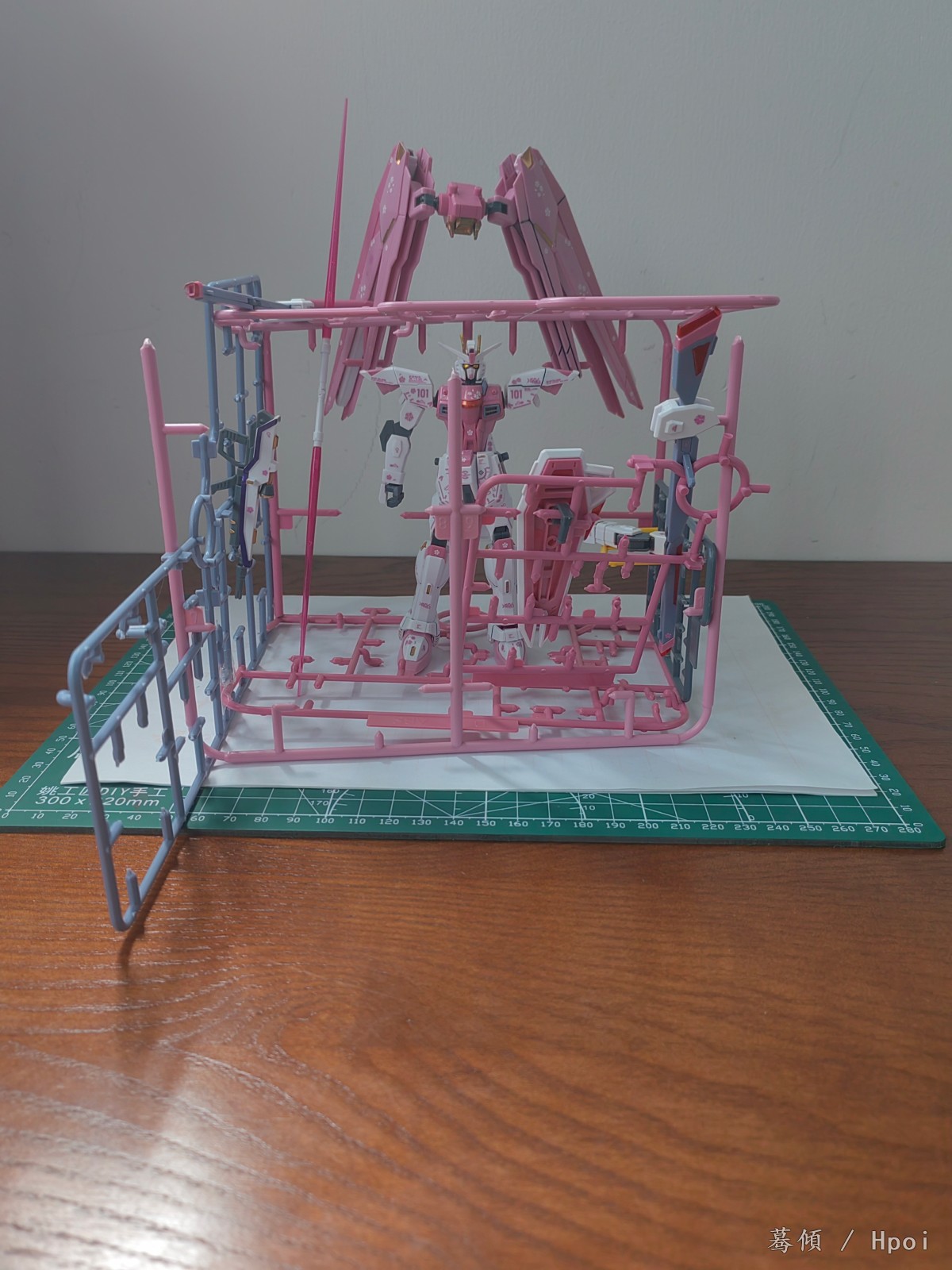 拿D板做的地基,与其说是地基,其实就是空位大一点,可以放下脚,不同于那个扎古,这个没有封底,高达是高达,格纳库是格纳库,其实没挨着,不过这个板子有些凹凸不平,即地板不是平的,一开始我没注意,在粘淡蓝色的墙壁的时候才注意到,不过影响不是很大。
