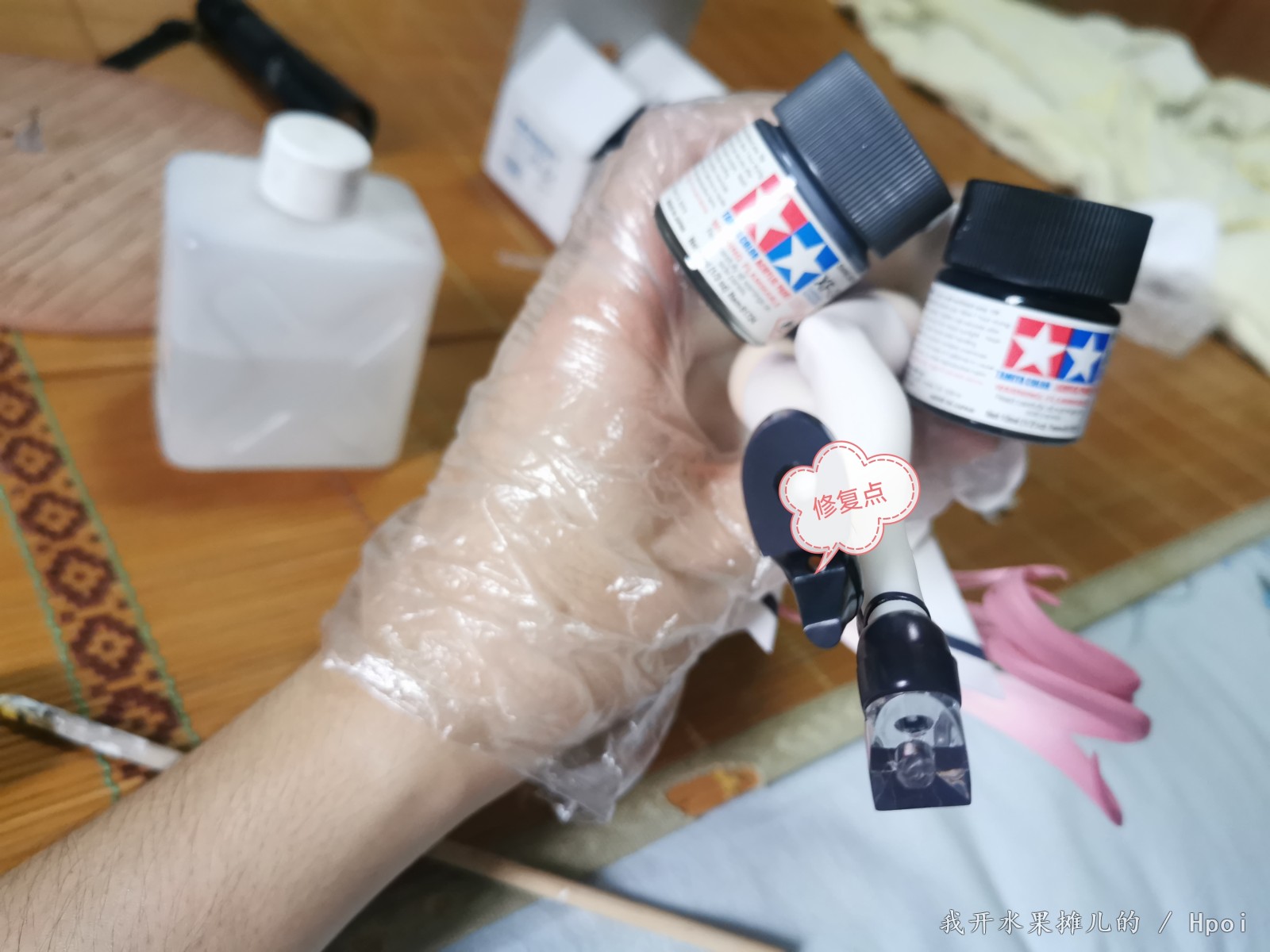 组装的时候就翻车了,把高跟鞋的鞋底稍微蹭掉了,大概一粒小米那么大的漆(因为安装原因,后面会跟大家讲)一开始我是很悲观的,但是后面我转念想想看,既然是一位无暇少女,那我就尽力要修复好,哪怕这个瑕疵面很小且正常视角根本看不到于是我第一次尝试对手办的漆面进行修复。我早来了,以前涂装德国海军迷彩的颜料,与黑色颜料混合,最终完成了修复。(基本看不出来)