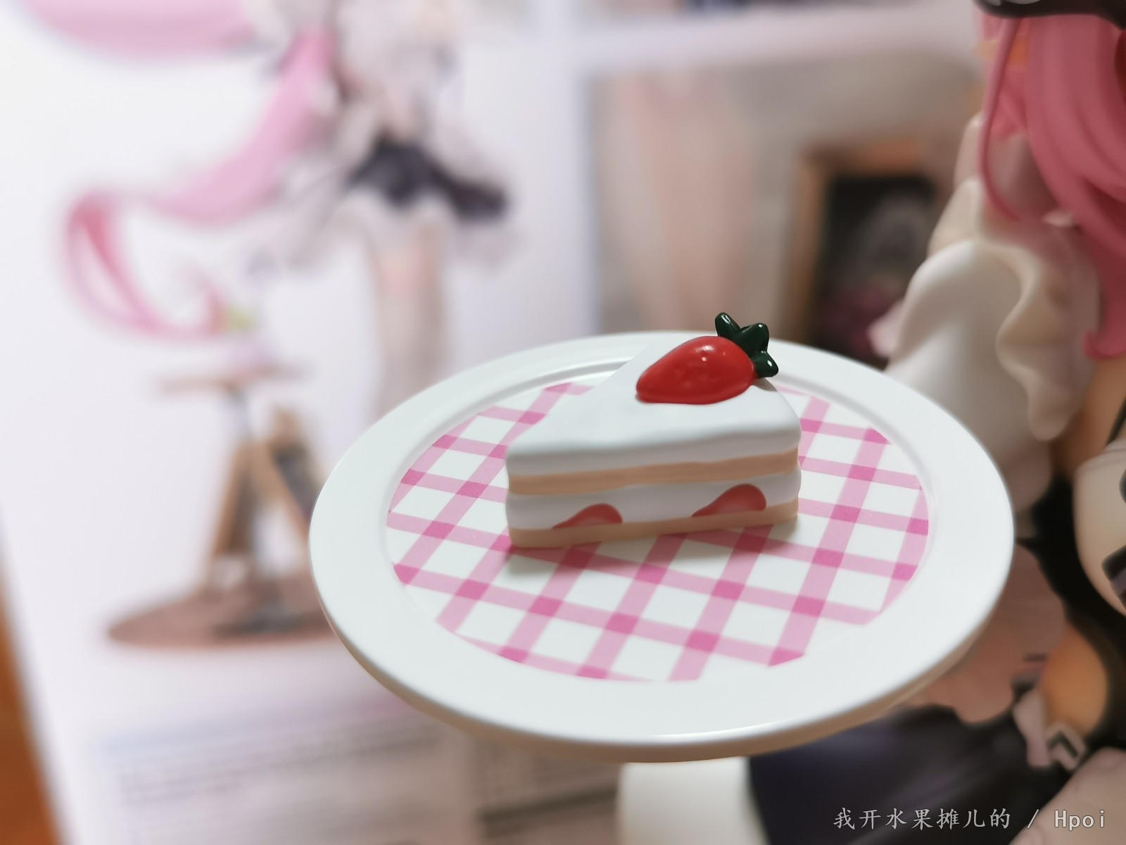 接下来就是这个盘子和盘子上面的小蛋糕,很多人都说这个小蛋糕太塑料了,但是就我个人而言,我觉得看着还好哈,挺想吃一口的,就是可能他如果在蛋糕层上面更多的表现出那种蛋糕的孔洞的话,就会给人更真实一点了,其实奶油层的刻画都还好,包括草莓上面也做出了坑坑洼洼的点。