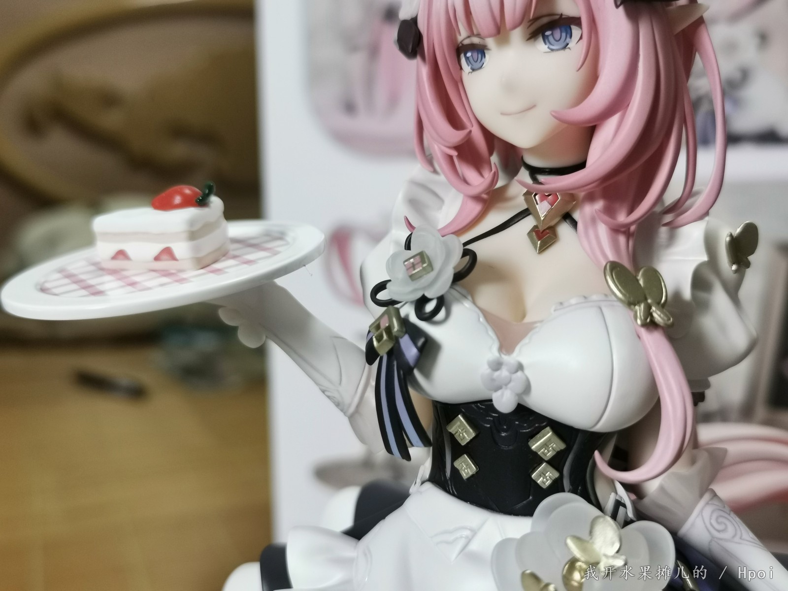 来到身体的部分,首先先看欧派部分。用一句话来概括就是:“爱莉希雅,是你胖了!”事业线的刻画非常的自然,不深不浅,大小也能对应上原画。脖子上面的吊带刻画与背部是一样的,非常的清晰,同时挂在胸口上方的爱心也非常棒,在这么小的零件里面,涂色居然可以做到不蹭边属实非常难得