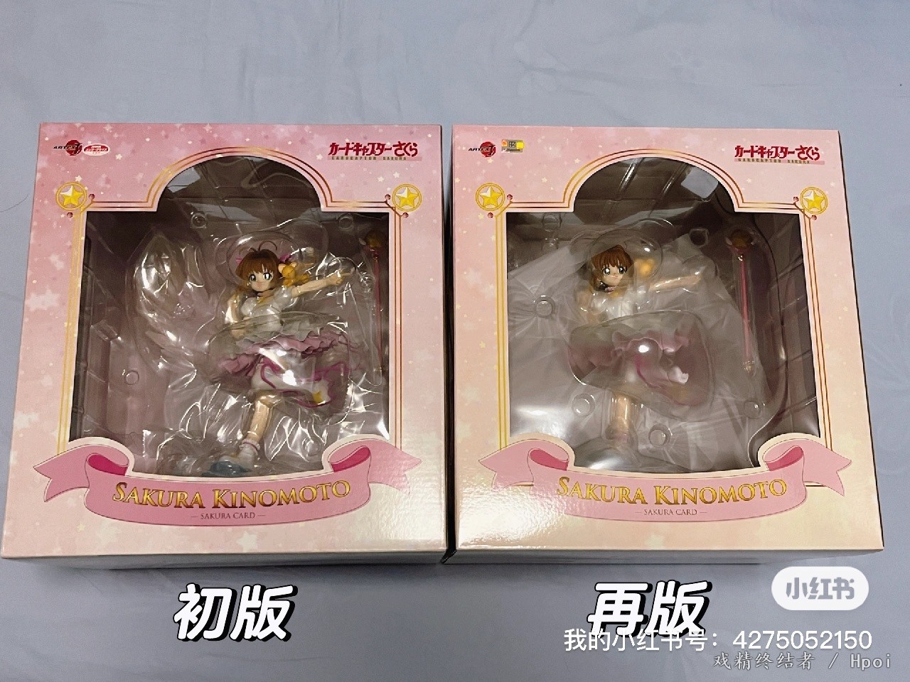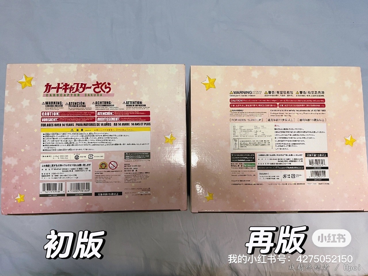 今日收到寿屋木之本樱再版星之力手办,拿出初版和再版对比🆚一下: 1、外盒色差:初版盒子粉色比较正,再版盒子粉中带黄。虽然初版是2017年出荷,已经有6年了,但是盒子色彩比再版更鲜艳,初版外盒文字更清晰。 2、外盒信息差别:防伪标调整了,外盒下方信息差别很大,详见图片。 3、盒内防蹭漆膜:初版为透明色,再版乳白色。初版可以直接看清本体,再版只能看到面雕。 4、圆贴差距:初版外盒上下各一个圆贴,再版上下各三个圆贴。 5、手办模具和涂装:一模一样,无大差别。 6、入手建议:不用高价追初版,建议直接买再版750左右,性价比高。 千万不要贪图便宜!